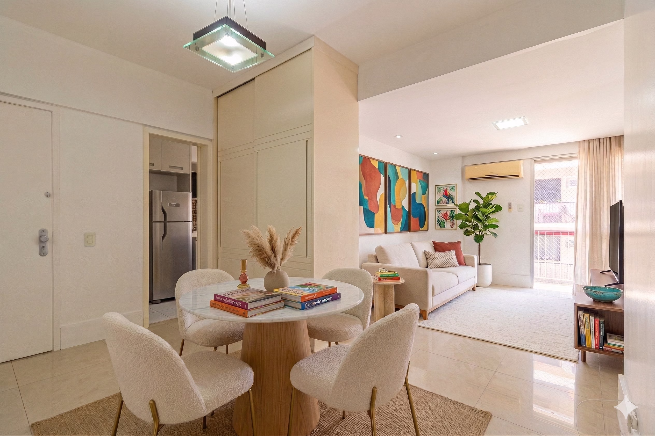A sala é super iluminada e conta com 2 ambientes seperados, um para estar/TV e outro para refeições. Apesar de ser um pouco devassado por outros prédios, o apê fica em um andar alto, contando com respiros de céu e verde nas vistas das sacadas e janelas. A decoração da primeira imagem deste anúncio foi criada com auxílio de inteligência artificial.