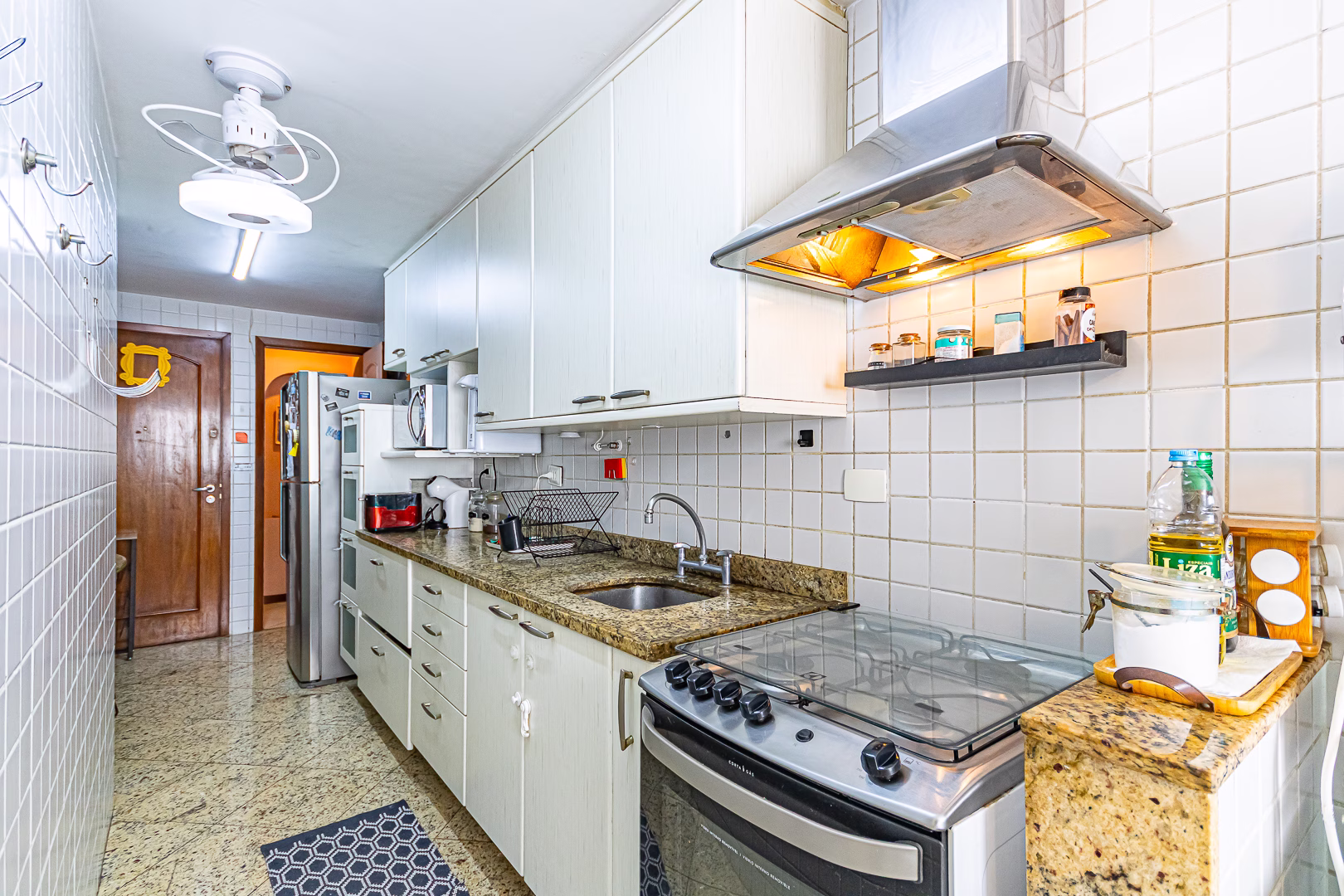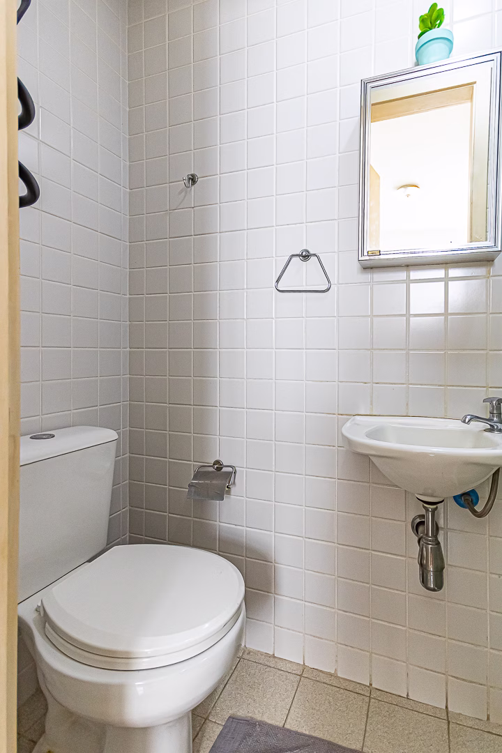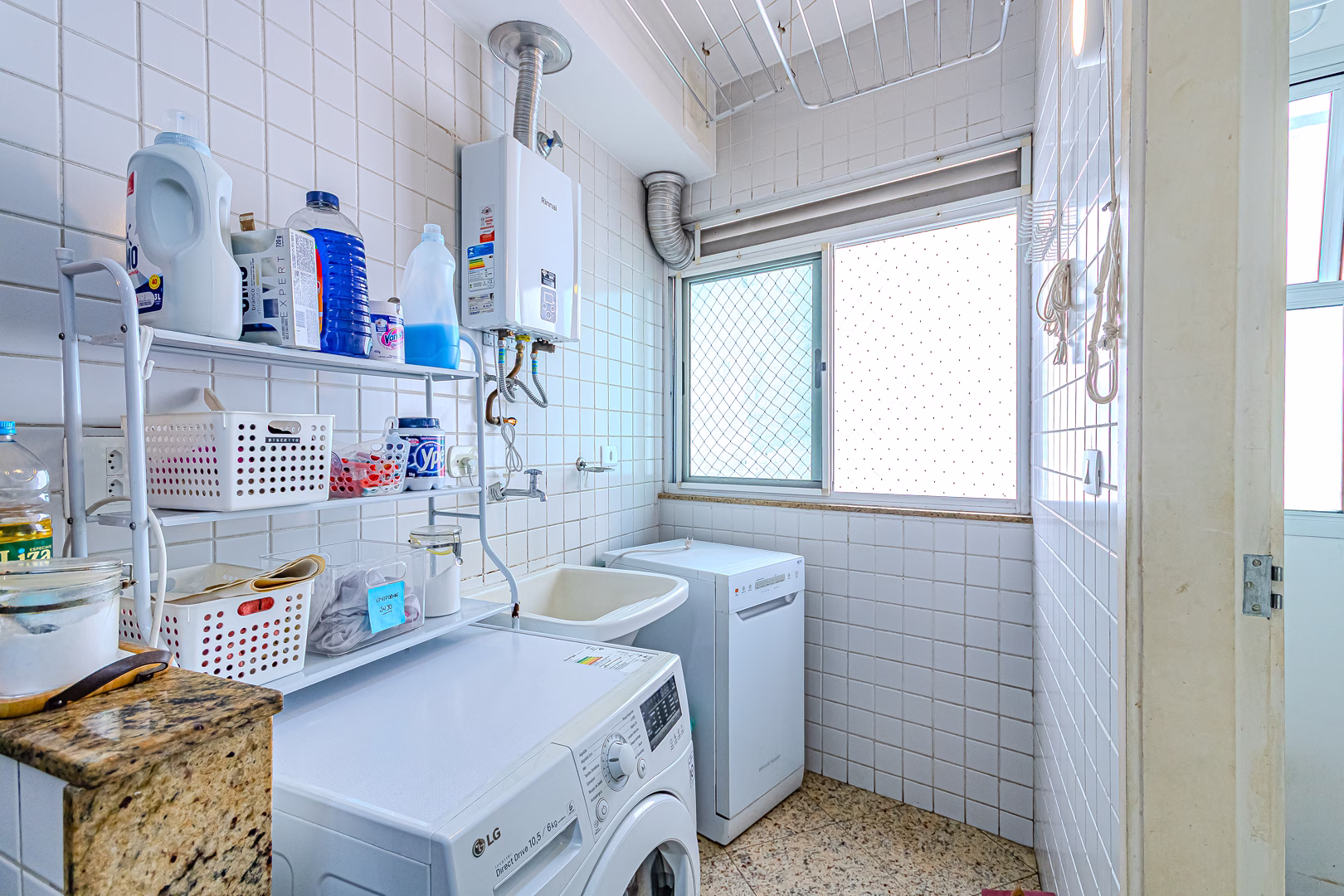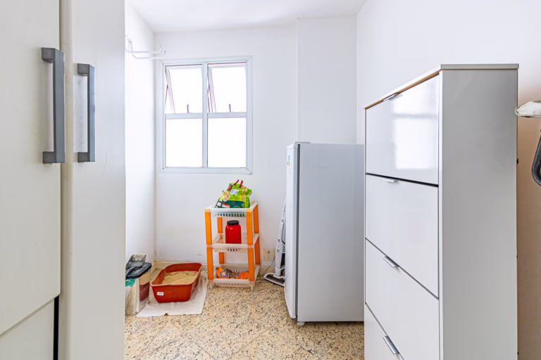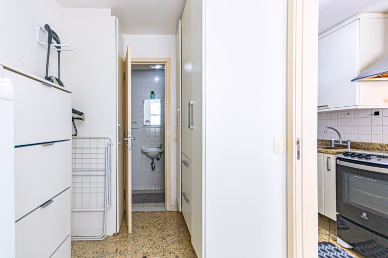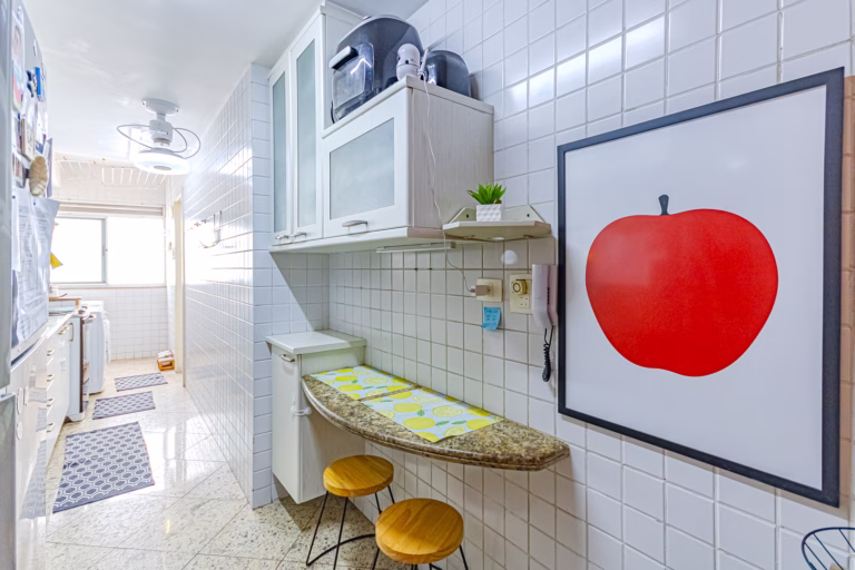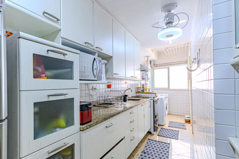 A cozinha é iluminada e também repleta de armários. Conta com uma mesinha de 2 lugares para refeições rápidas, área de serviço, dependência e WC.