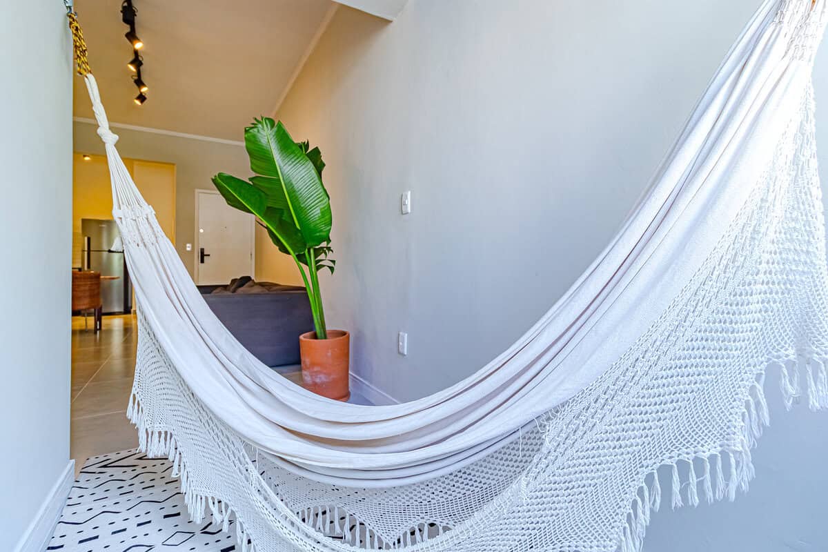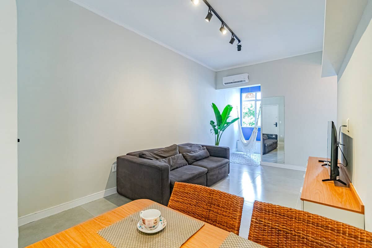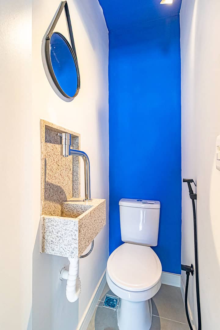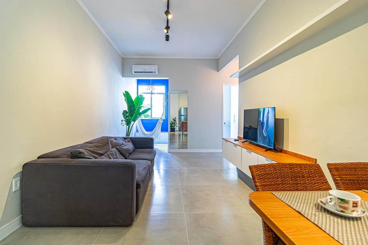 Na sala, tudo é encaixadinho, tendo bons espaços para um sofá grande, TV, mesa de jantar e o canto da rede. Mas o que impressiona mesmo é que o arquiteto ainda conseguiu encaixar um lavabo atrás da parede da TV.