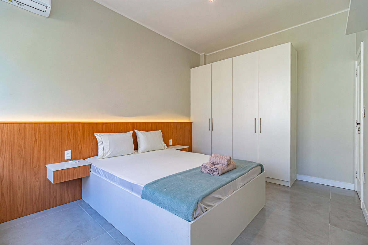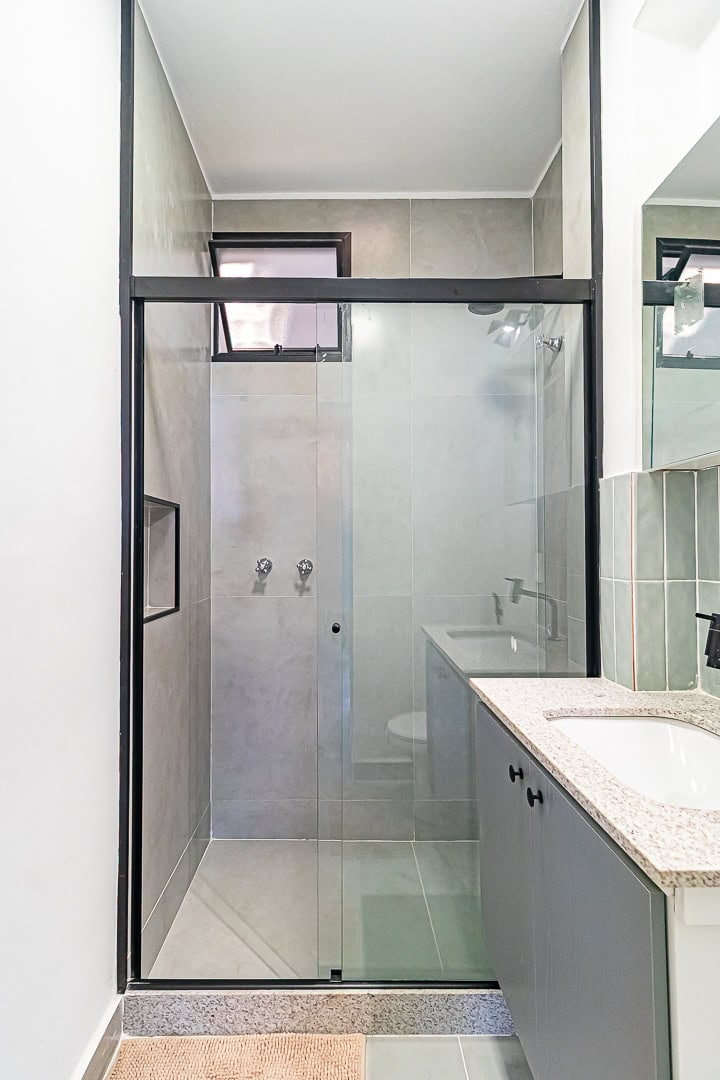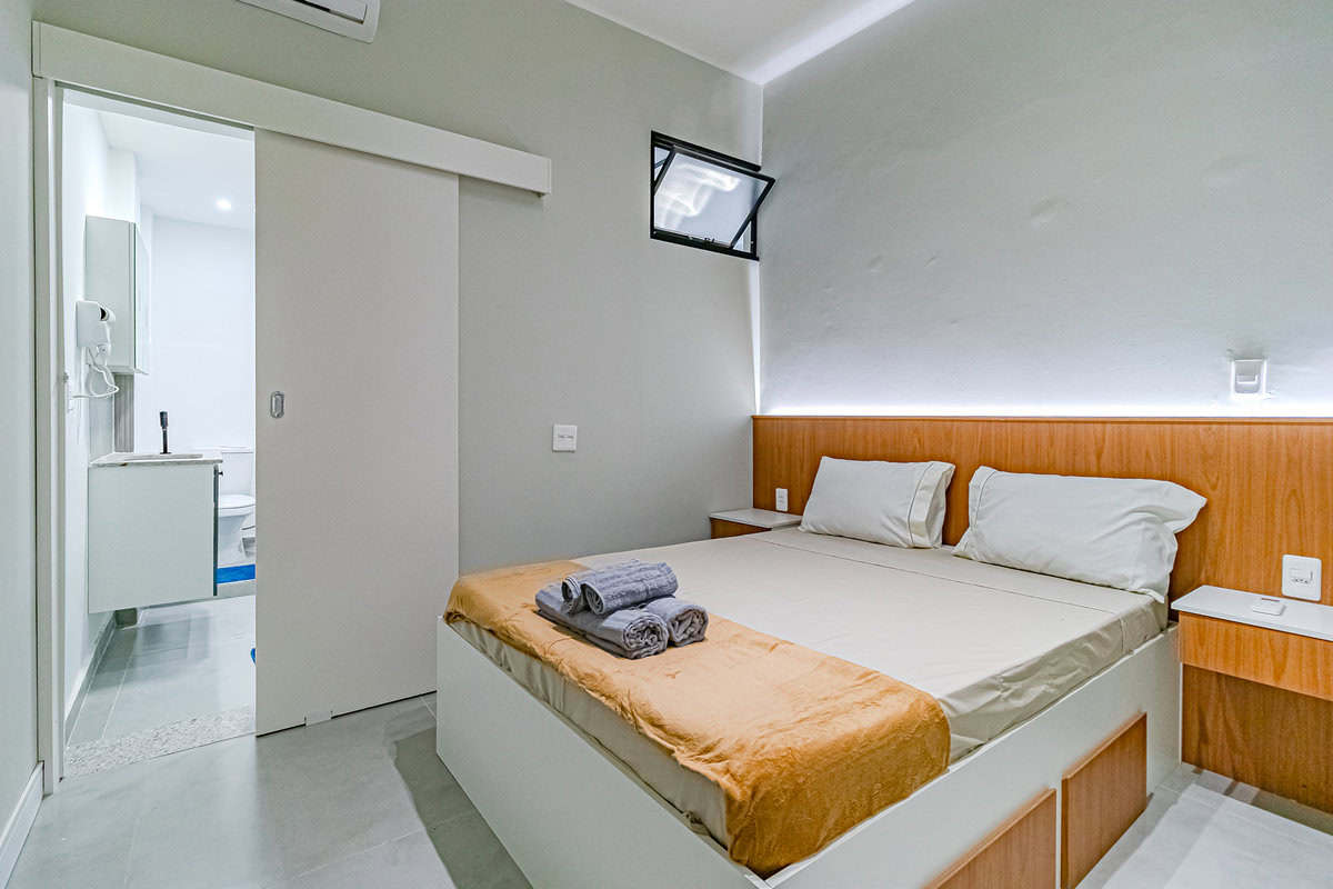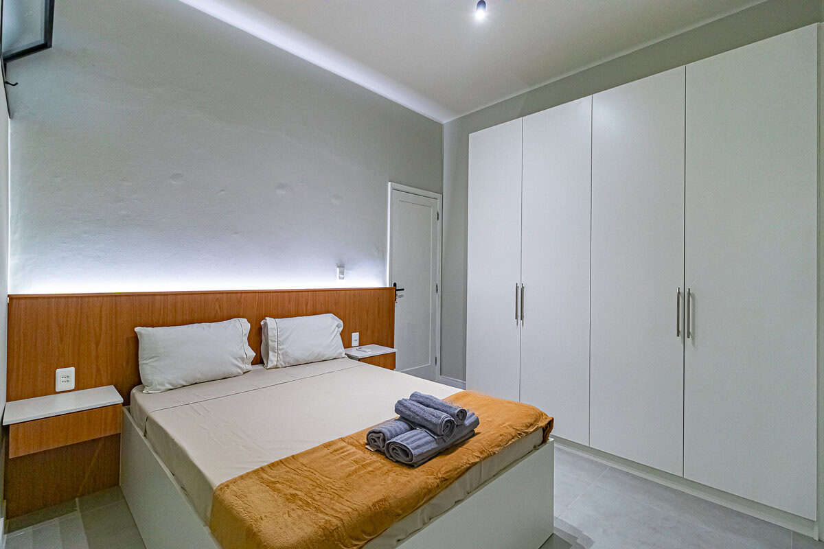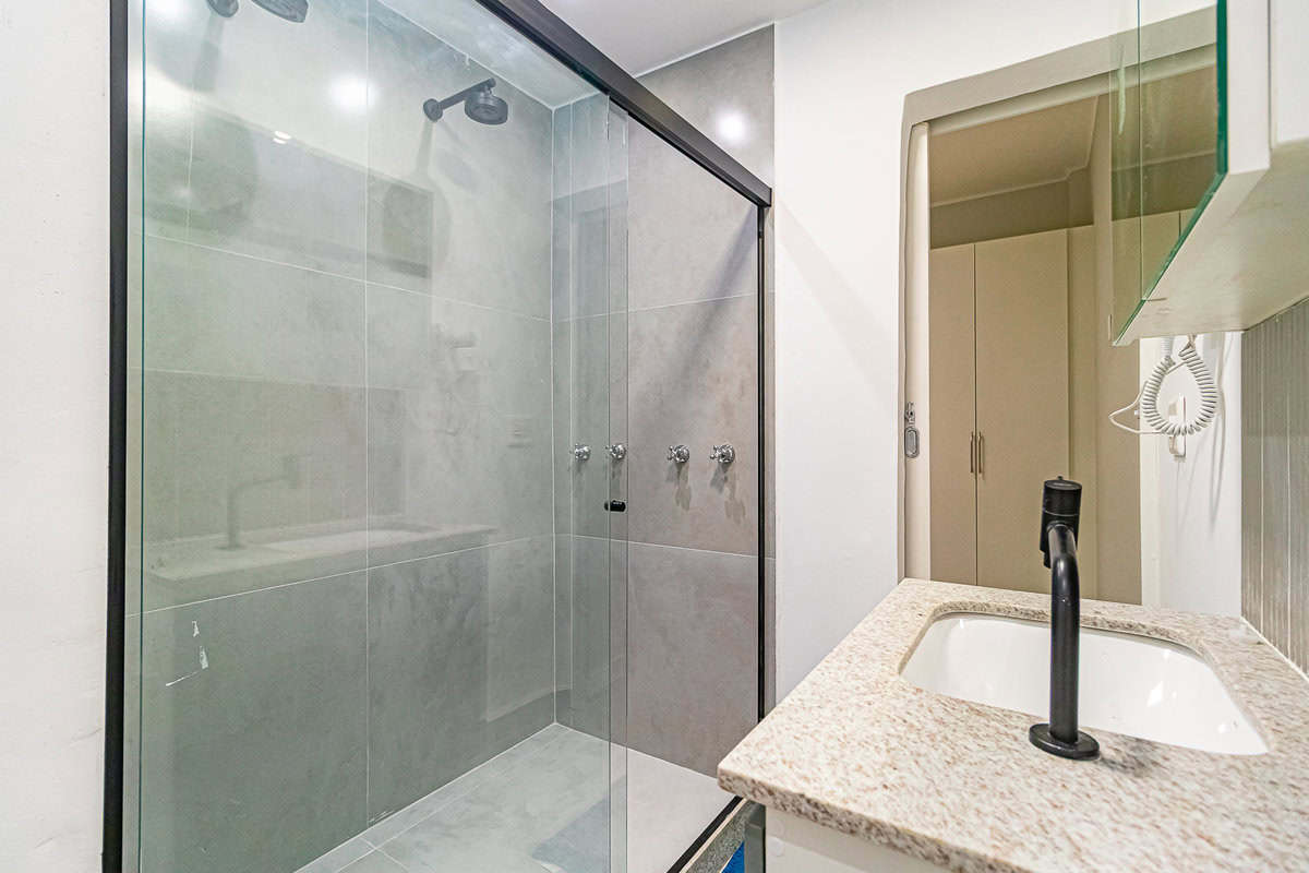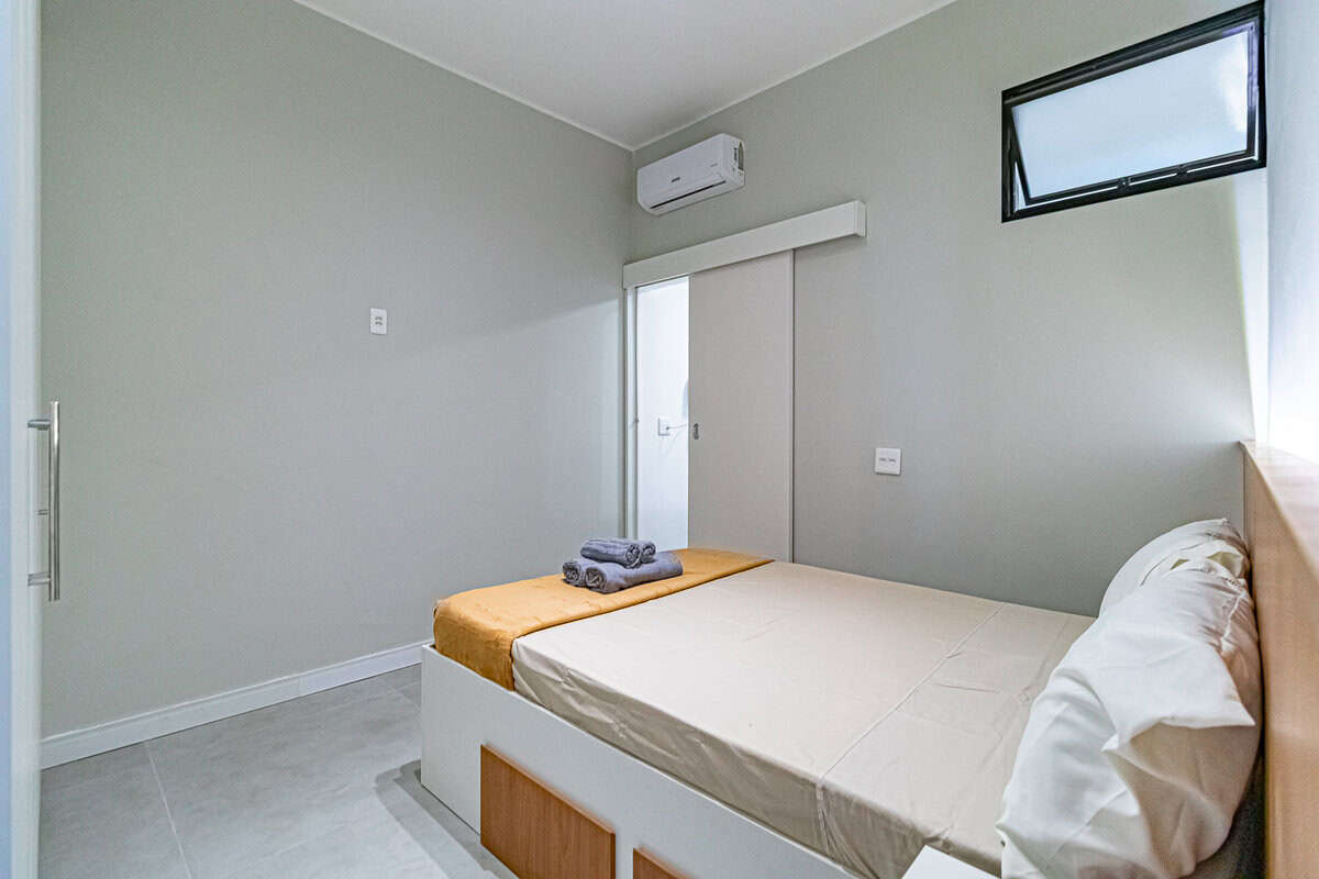 A área íntima é composta por 3 quartos, sendo 1 suíte e mais 1 banheiro social. Para fazer isso, o proprietário teve que refazer toda a planta do imóvel. Desta forma, a suíte teve que ficar no espaço onde era a dependência, na planta original, assim tem apenas uma janela basculante. Mas fora isso, os cômodos são relativamente espaçosos, contam com armários e aparelhos de ar-condicionado tipo split e os banheiros ventilados naturalmente.