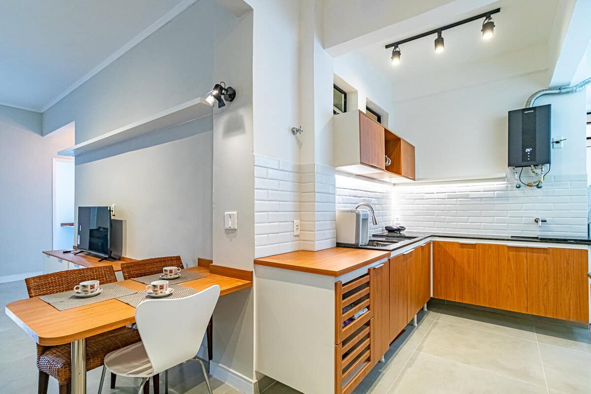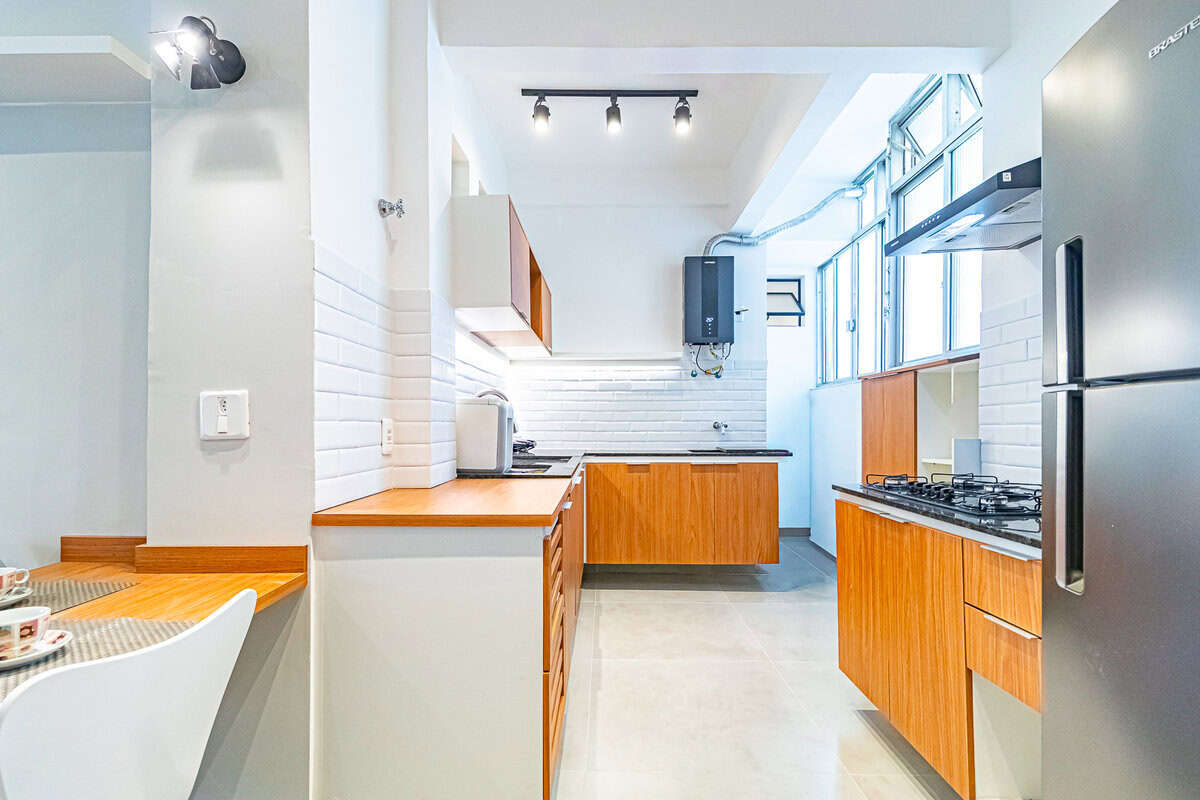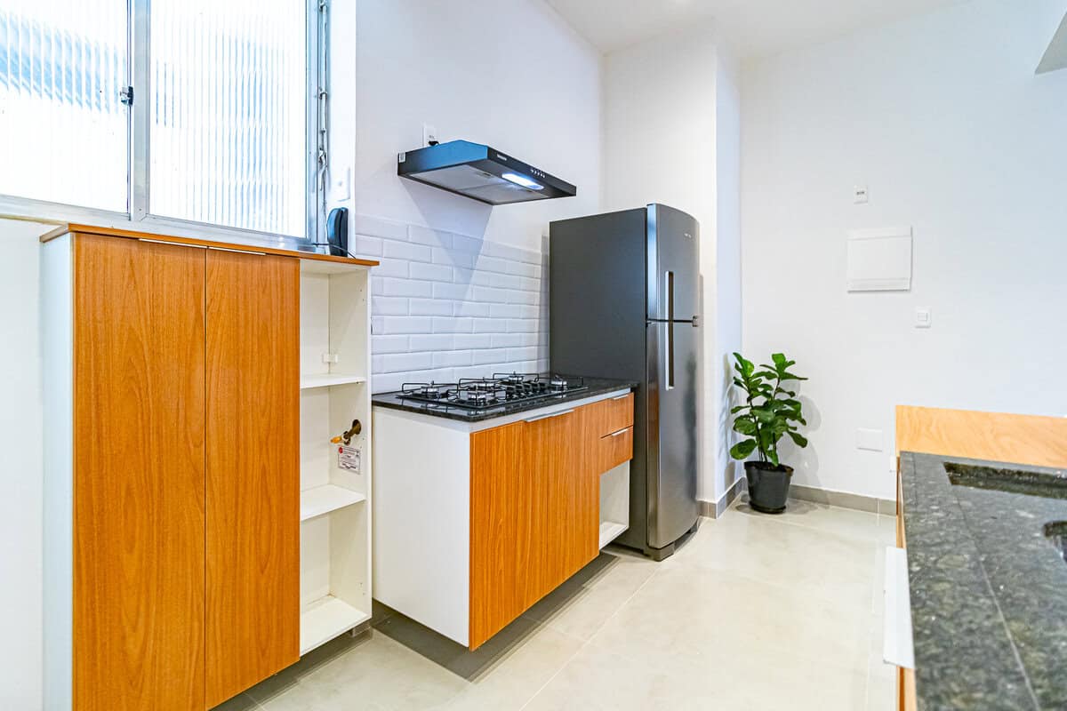 A cozinha é aberta para sala, bem ventilada e toda equipada. Há ainda uma pequena área de serviço, com espaço para máquina de lavar e varal.