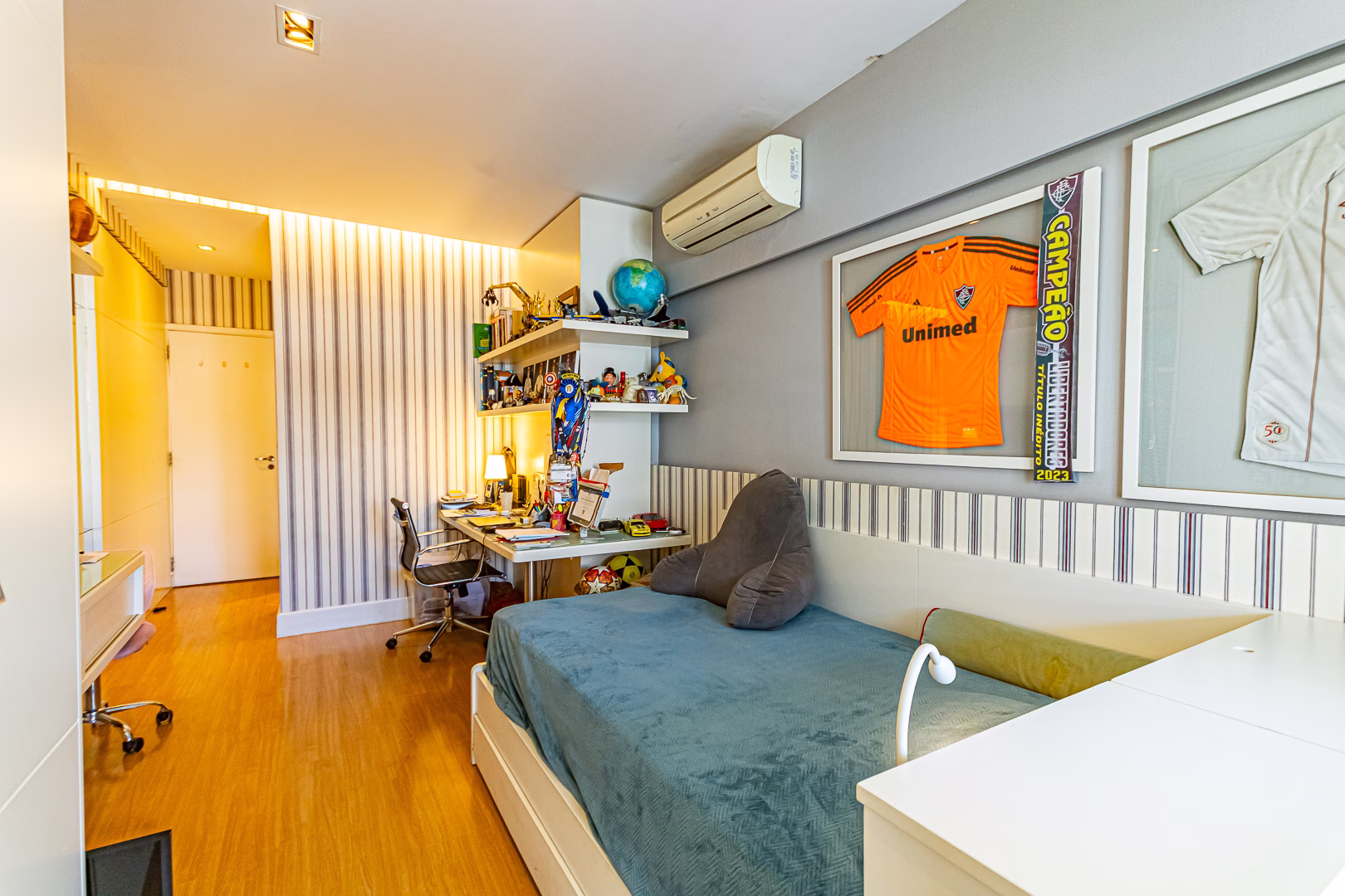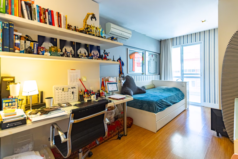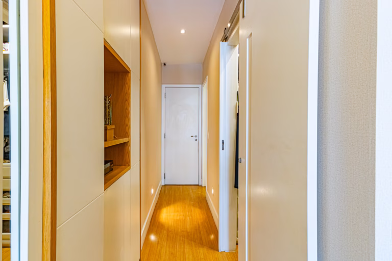 A área íntima é composta por 3 suítes, todas com marcenaria planejada e aparelhos de ar-condicionado tipo split. A suíte máster conta com um closet e também tem acesso para a varanda.