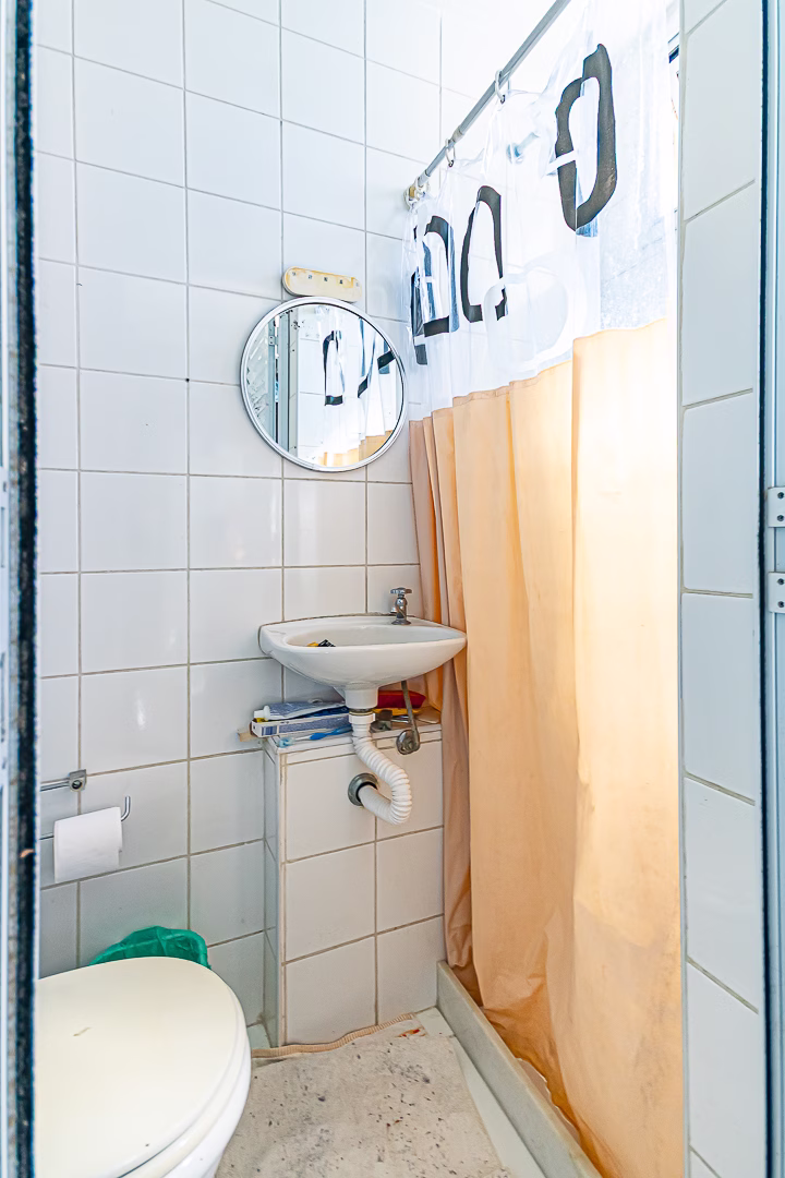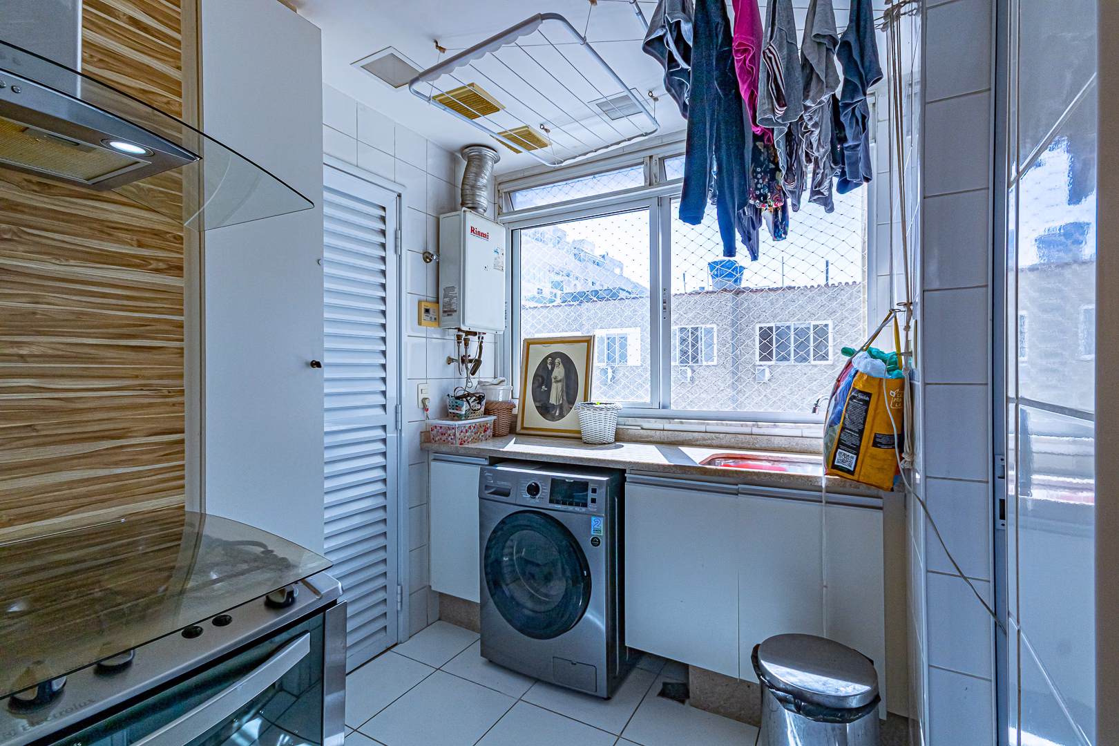 A cozinha é ótima. O que não falta nela é espaço e armários. Conta com uma mesa de 4 lugares, área de serviço. dependência e WC.