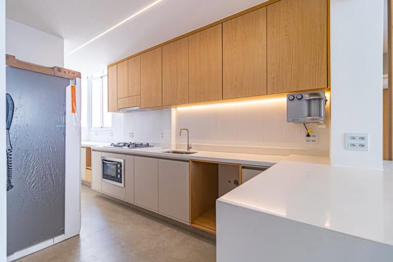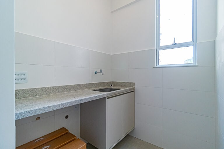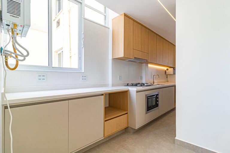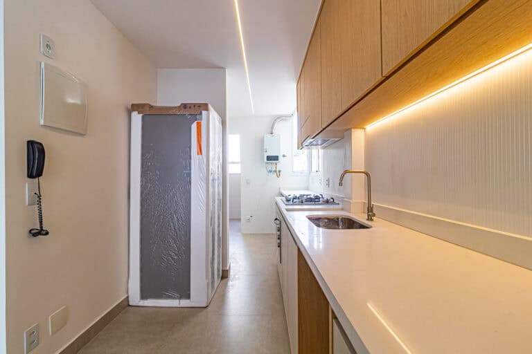 A cozinha, além de linda, é bastante arejada. Tem uns janelões que trazem muita luz e brisa ao ambiente. Está totalmente equipada e decorada com um belo projeto de marcenaria. Conta ainda com área de serviço separada e WC.
