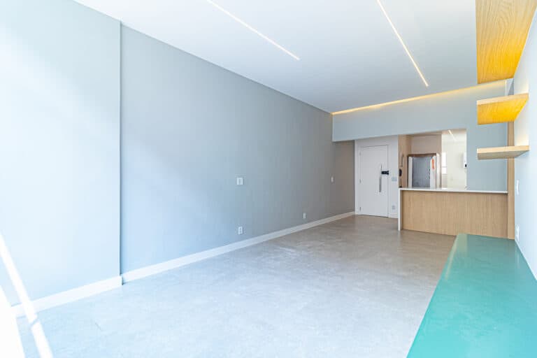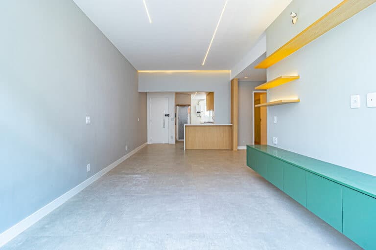 A sala é ampla, bem ventilada e conta com um belo projeto de iluminação. O apê fica de frente e num andar alto, desta forma se vê os prédios do outro lado da rua e uma grande parte do céu.