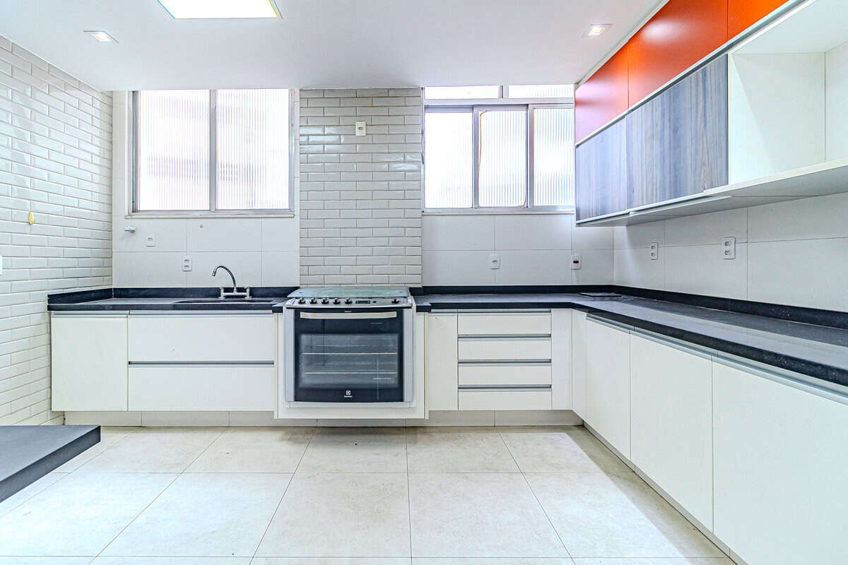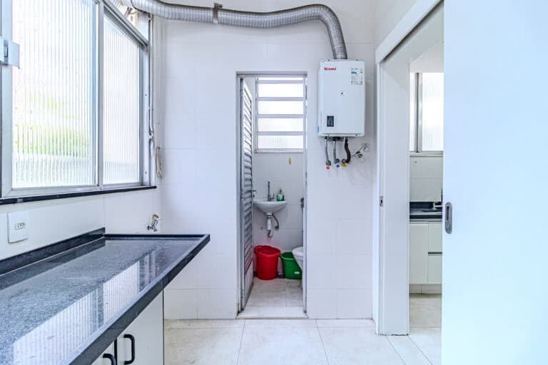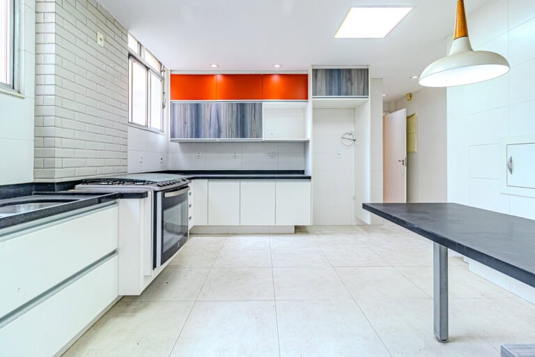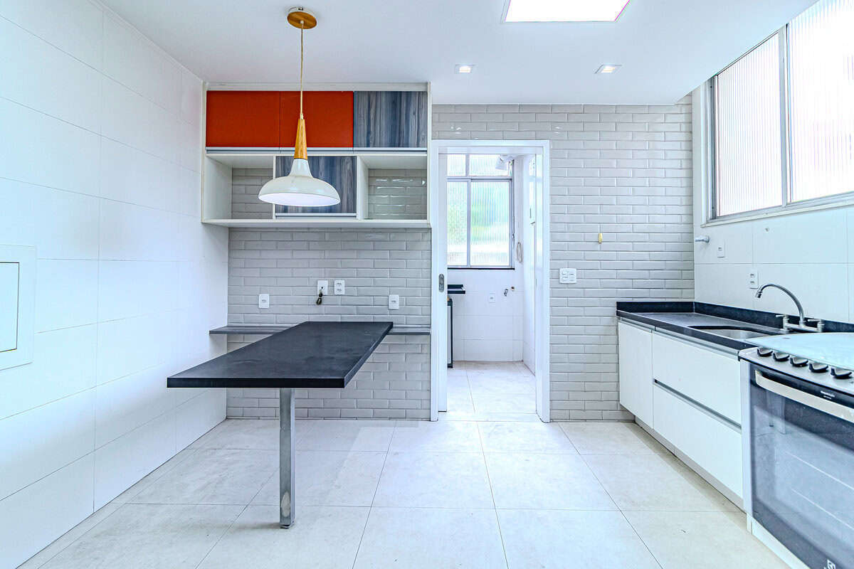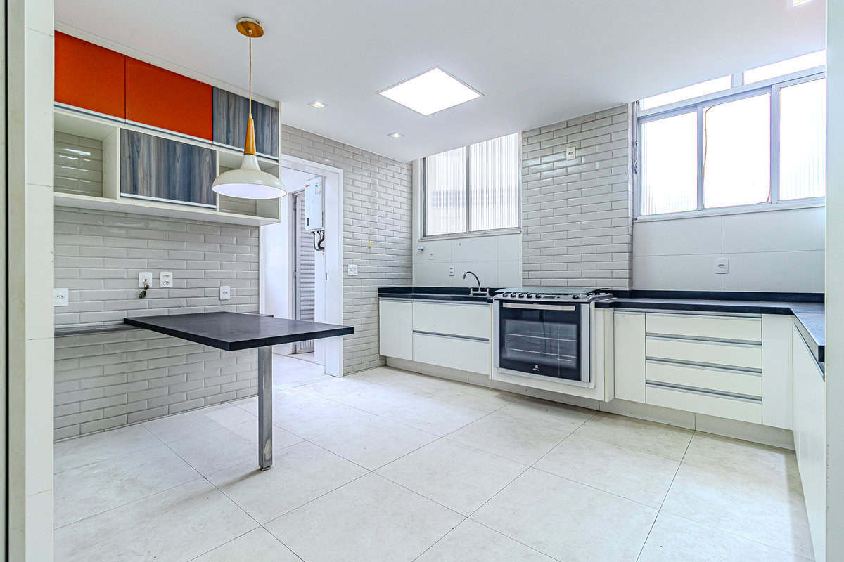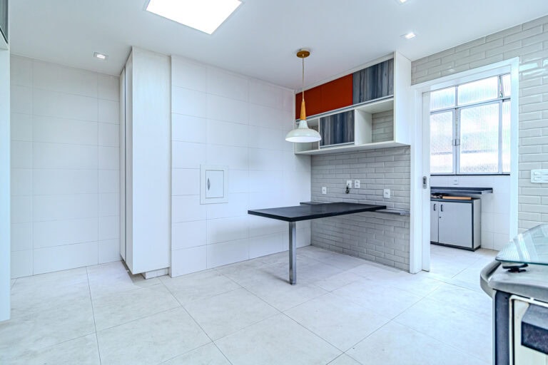 A cozinha é clara e super espaçosa. Tem uma mesa para refeições e um ótimo projeto de marcenaria planejada. Conta ainda com uma ampla área de serviço e WC.
