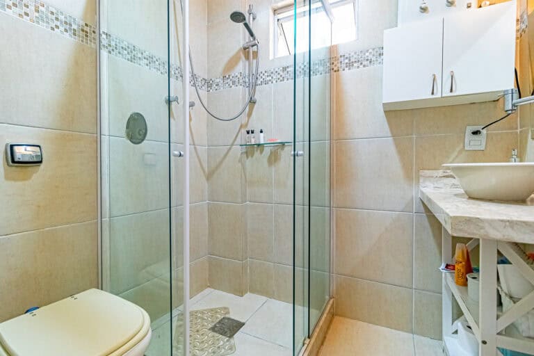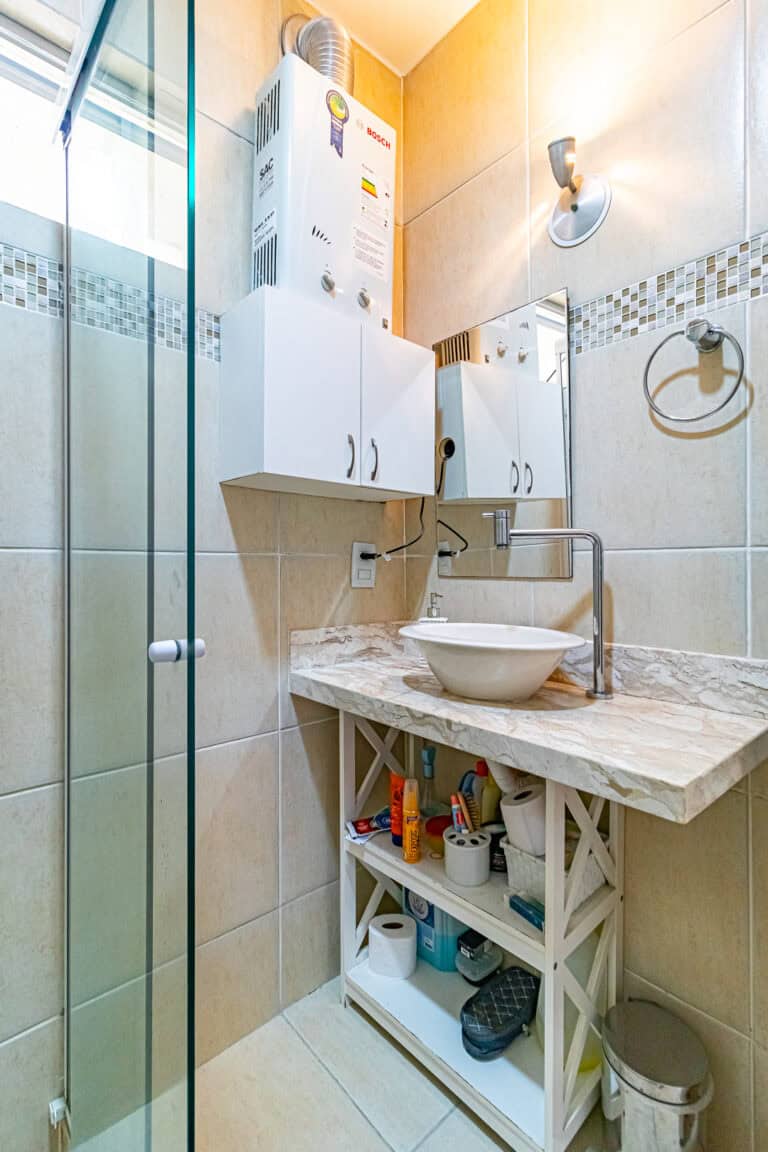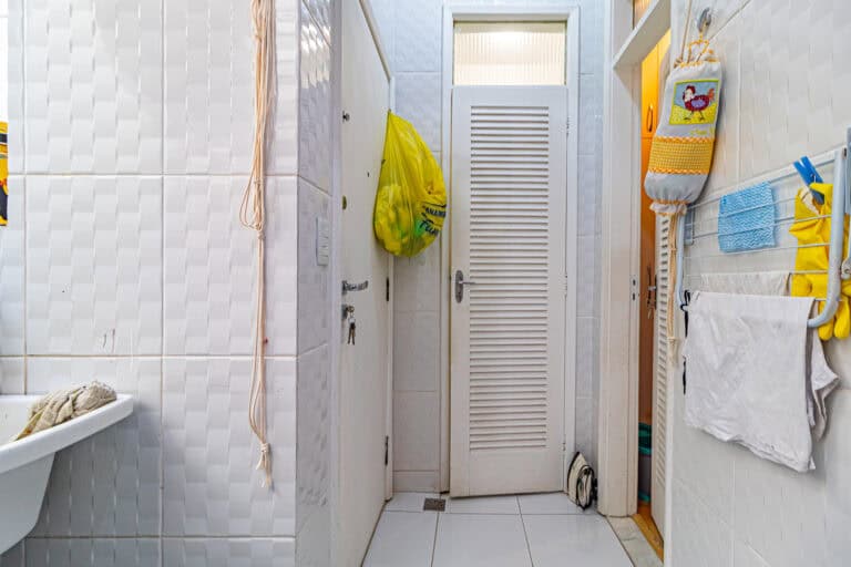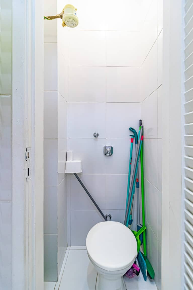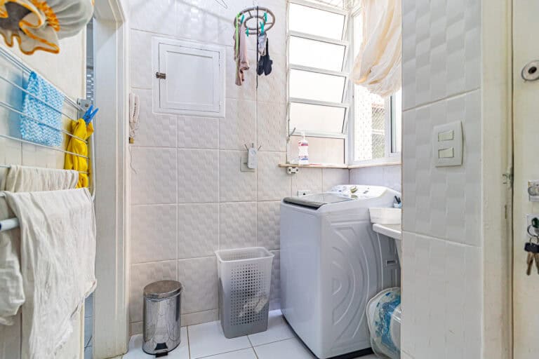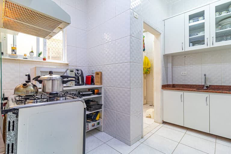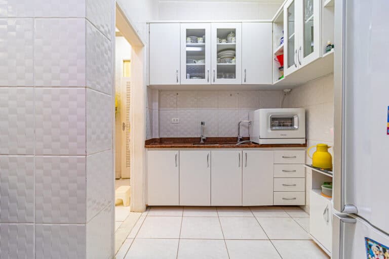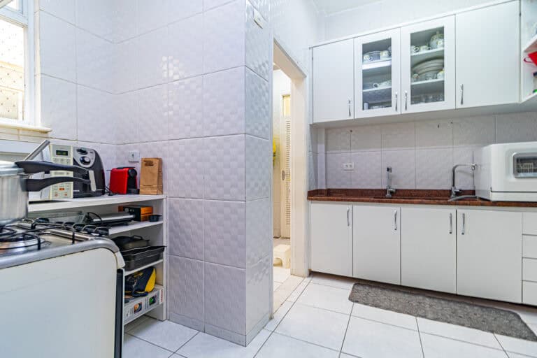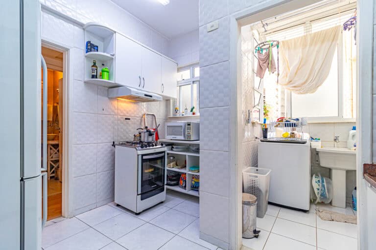 A cozinha é ampla e iluminada, com formato quadradinho. Conta ainda com área de serviço separada, dependência e WC de serviço.