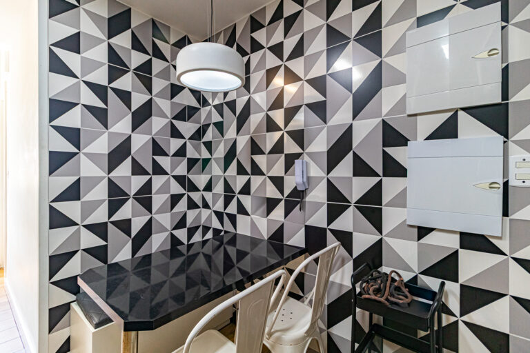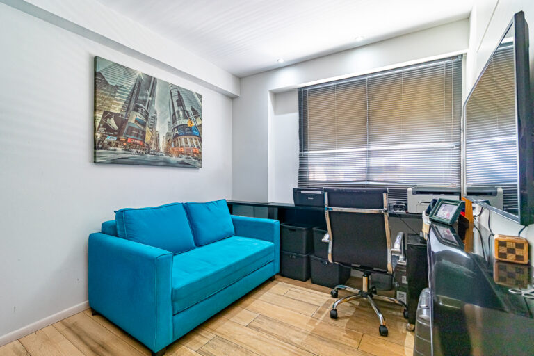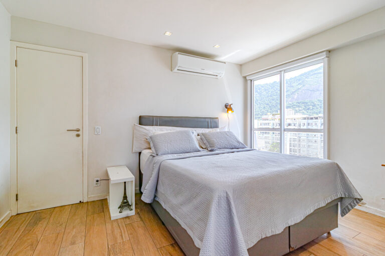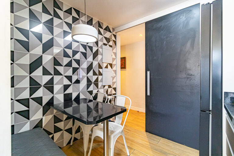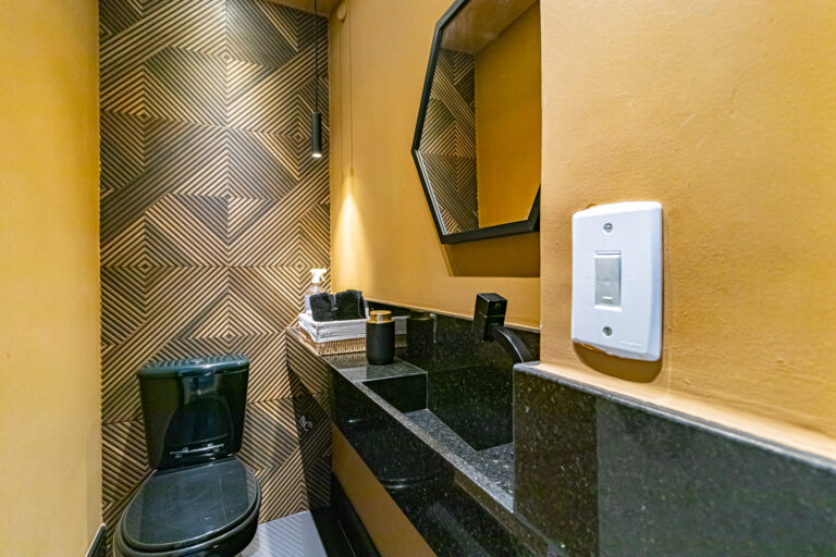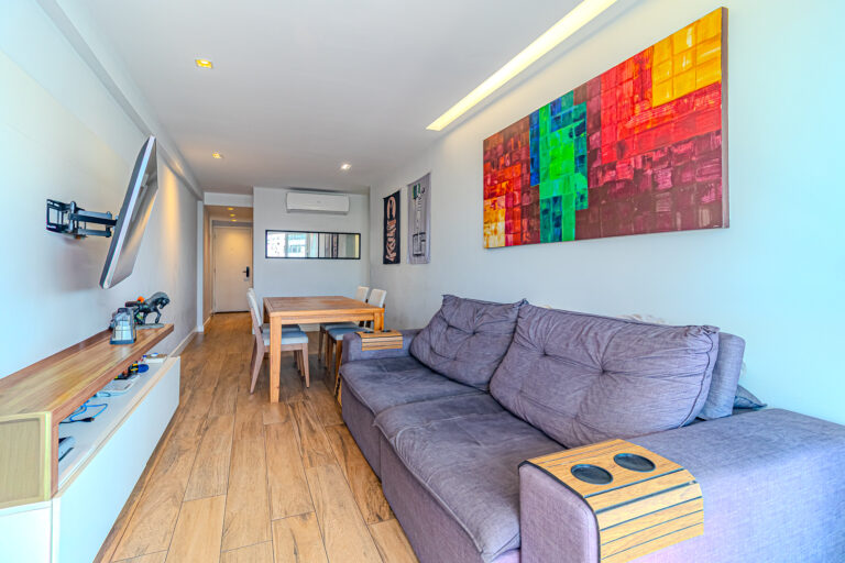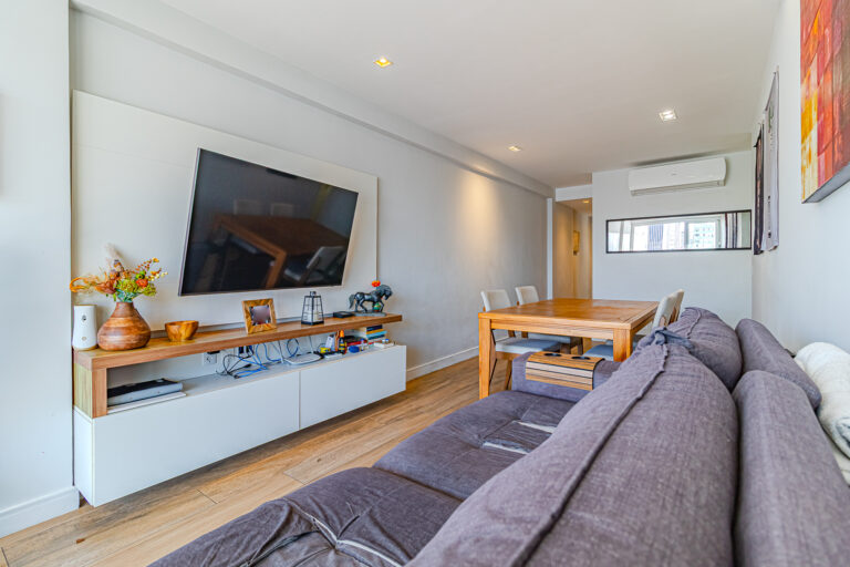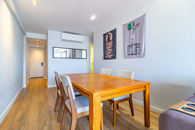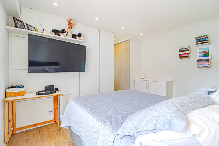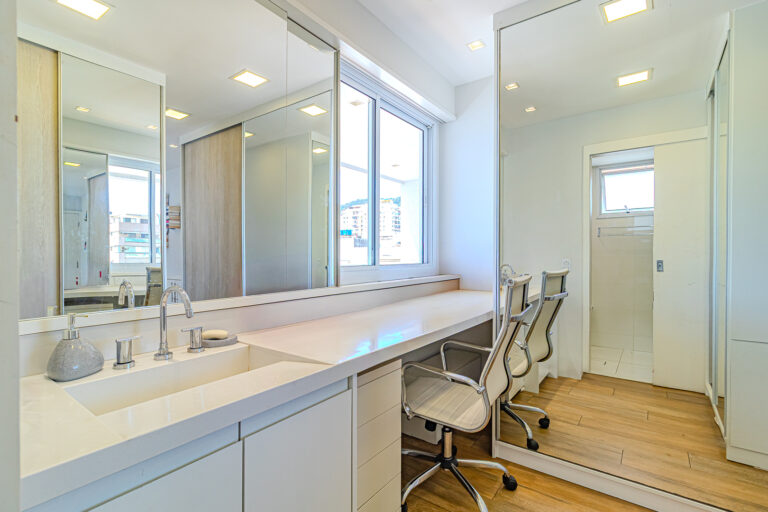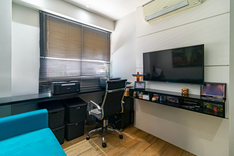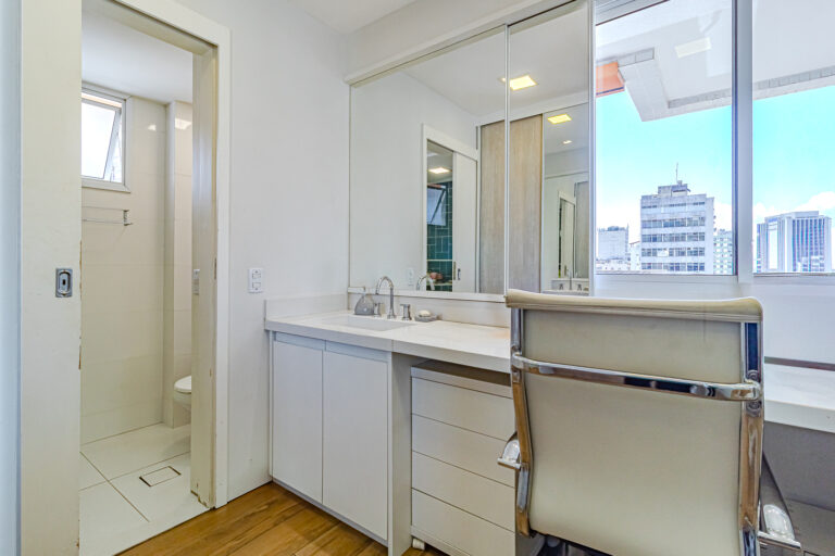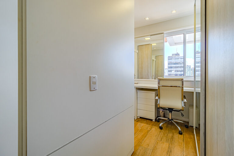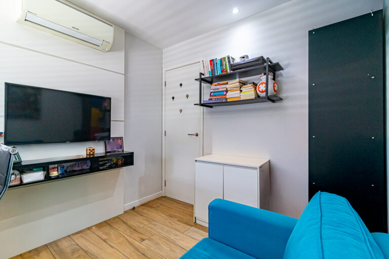 A área íntima originalmente tinha 3 quartos, mas a propietária juntou 2 em 1, criando uma grande suíte master com closet e escritório. Desta forma, o apê atualmente conta com 2 quartos, sendo 1 suíte e mais 1 banheiro social.