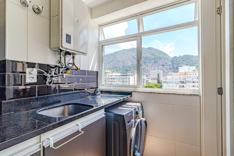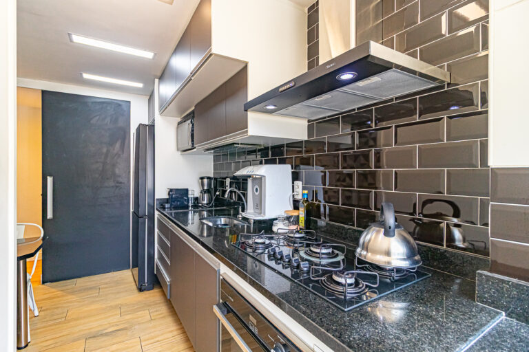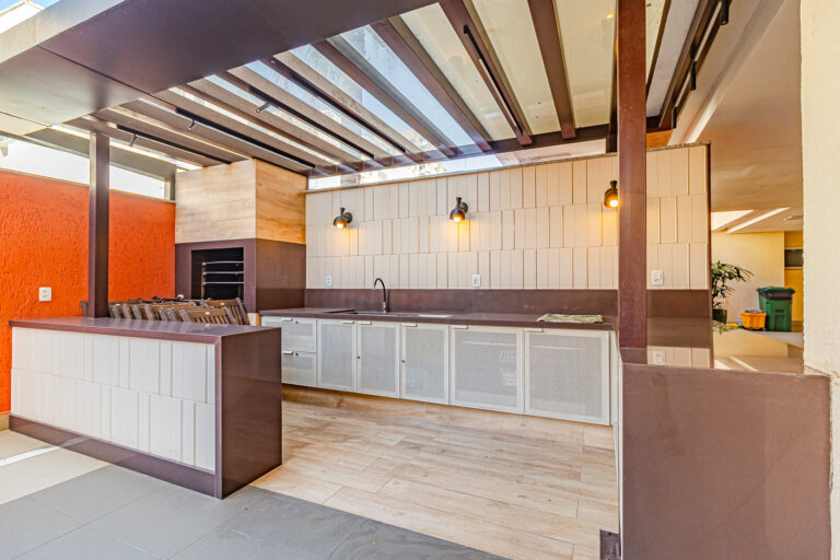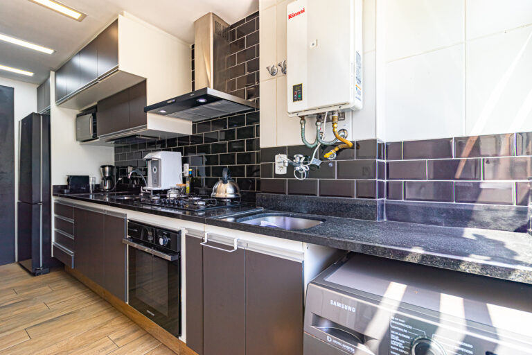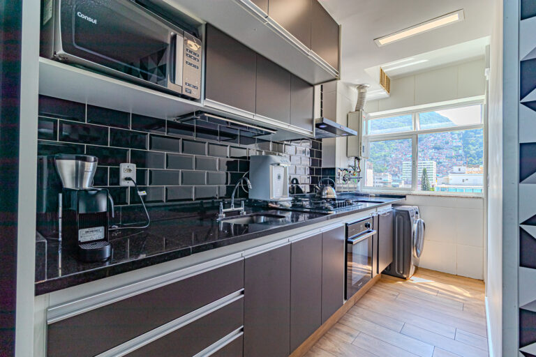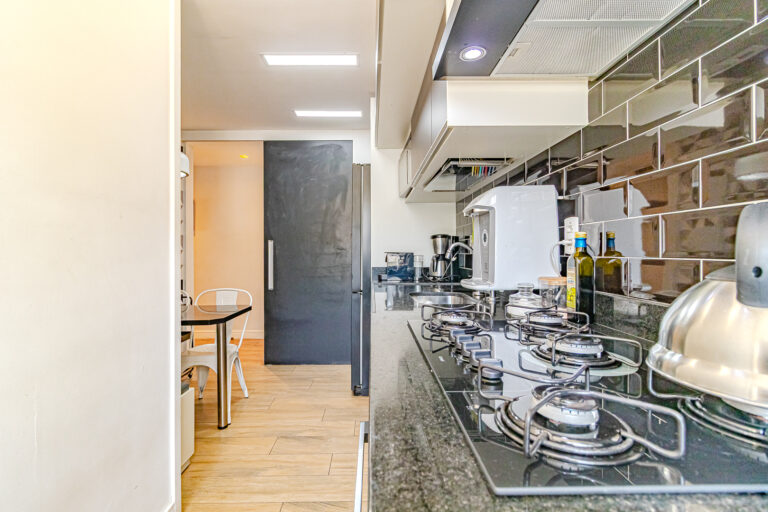 A cozinha tem um bom tamanho, é repleta de armários e conta com copa, área de serviço e dependência.