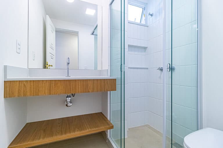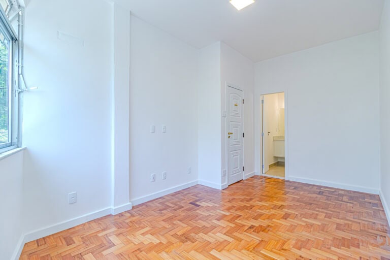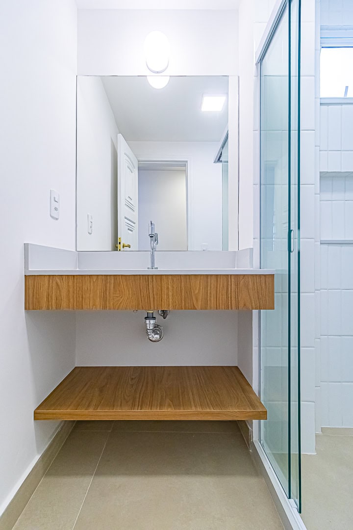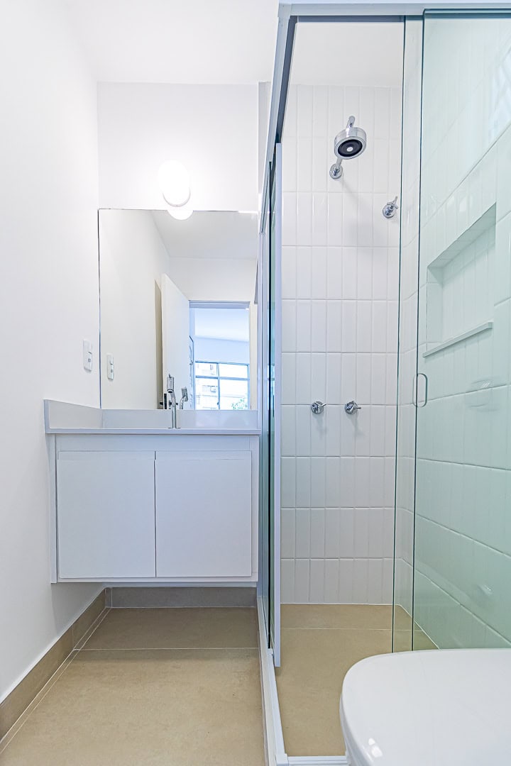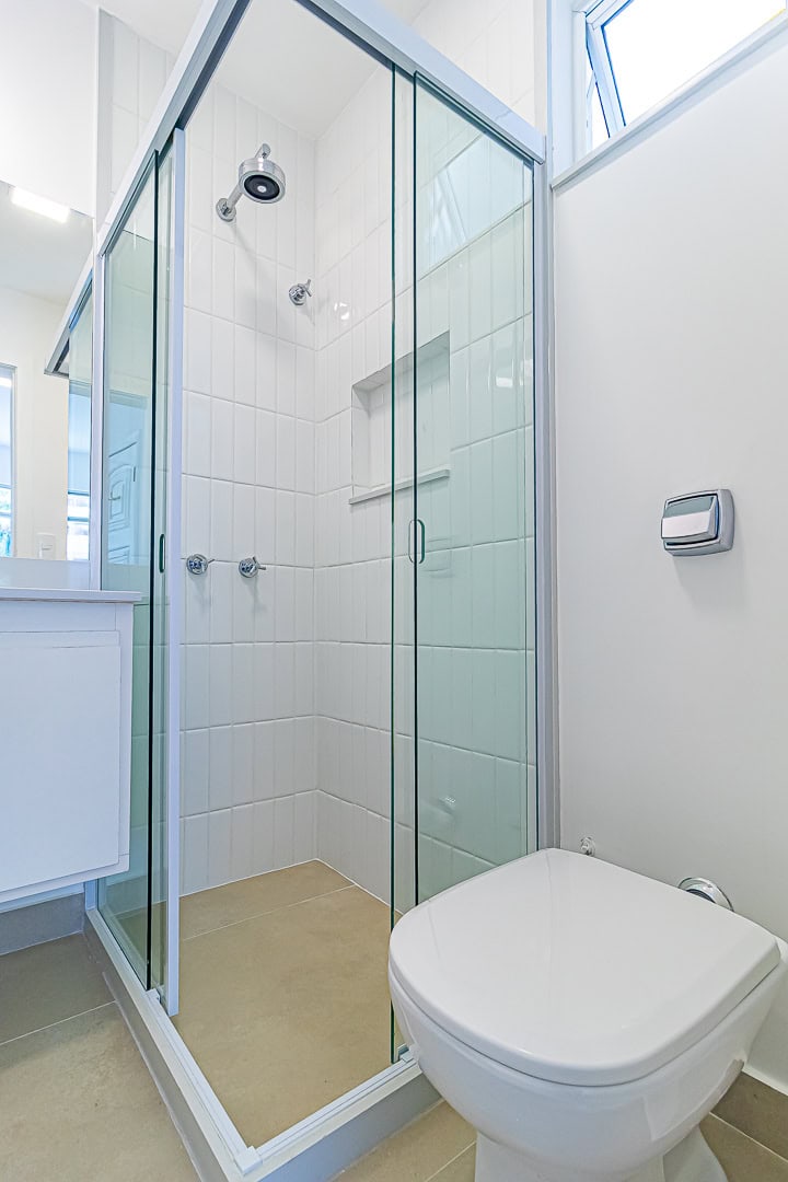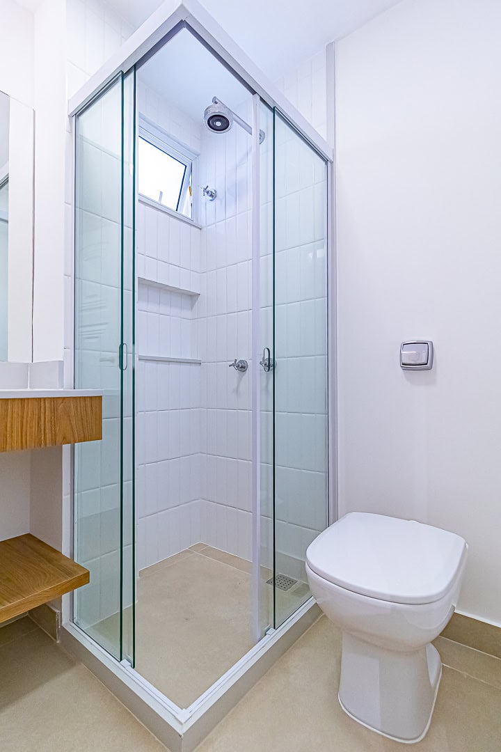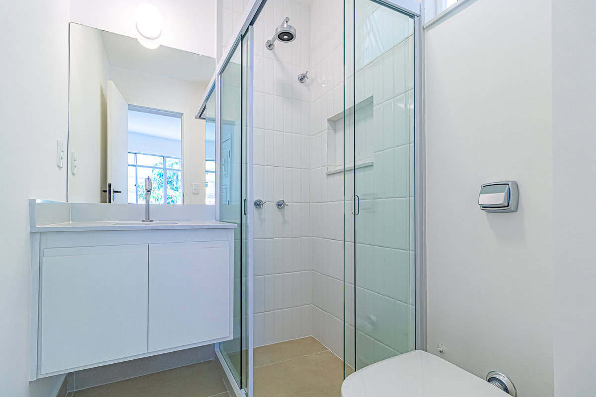 A área íntima é composta por 3 quartos, sendo 1 suíte e mais 1 banheiro social. Apesar da baixa metragem, todos os quartos são confortáveis e já estão preparados para a instalação de aparelhos de ar-condicionado tipo split. Outro detalhe importante é que os 2 banheiros têm ventilação natural.