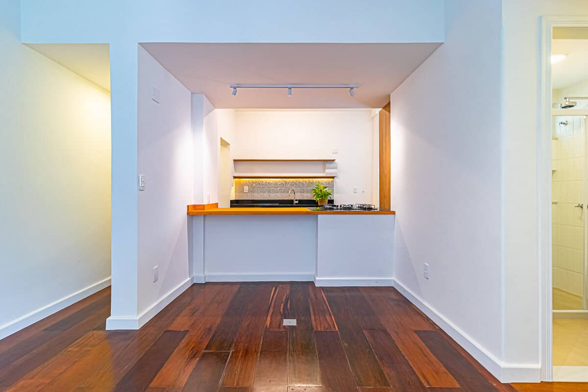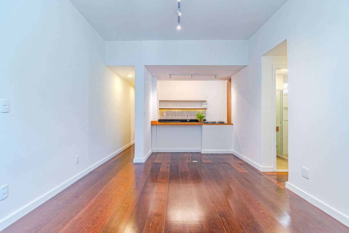 A sala é bastante iluminada, assim como todo o apê, pois todas as janelas são grandes. A cozinha aberta, traz ainda mais amplidão ao ambiente.