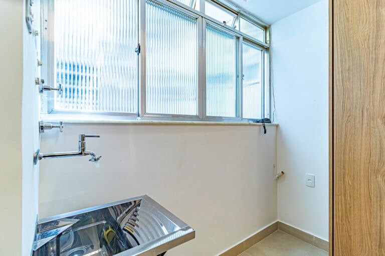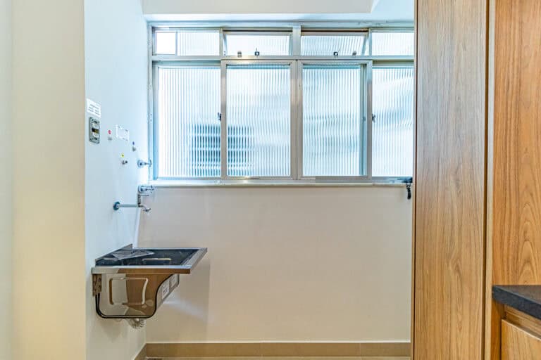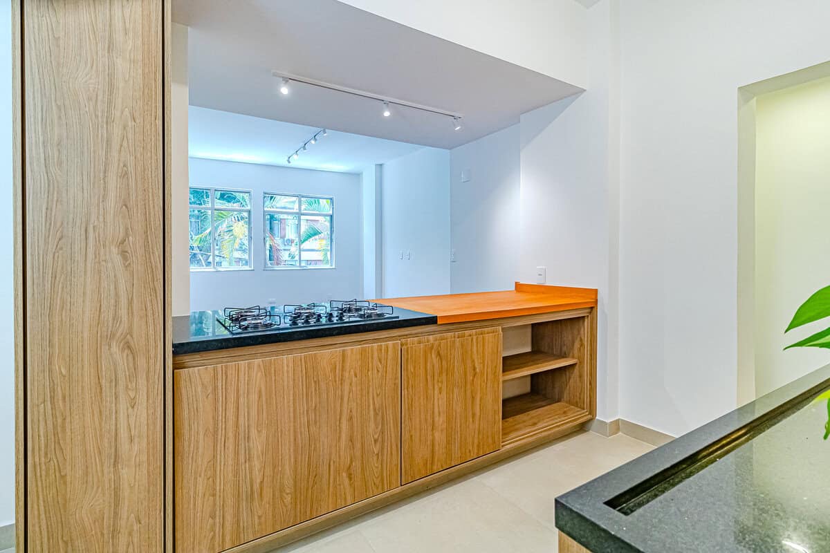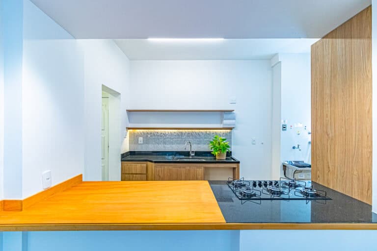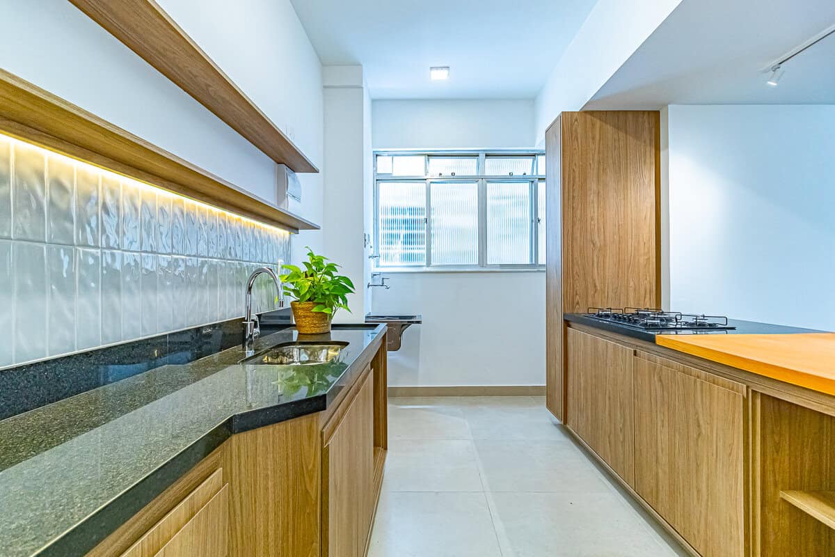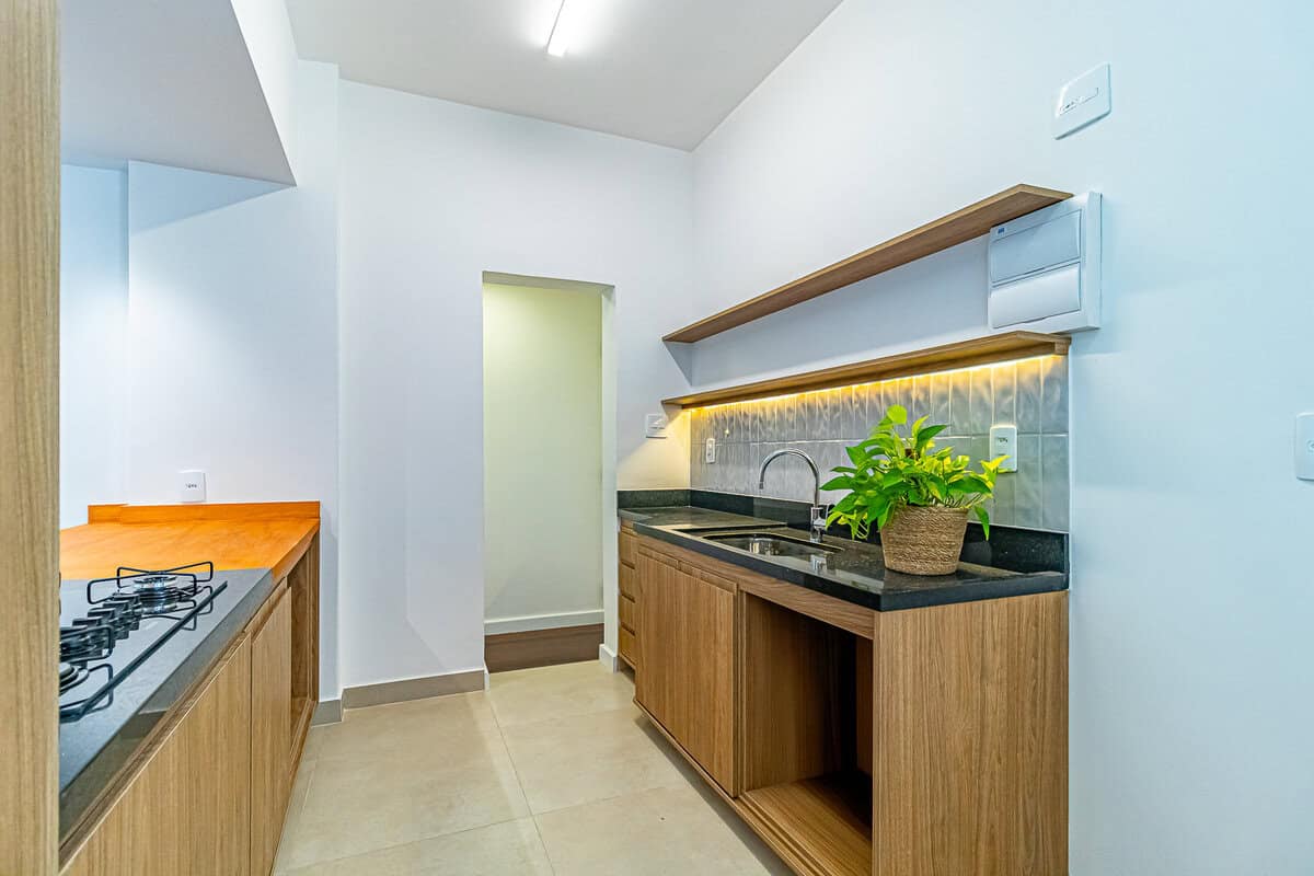 A cozinha é compacta, mas repleta de armários. Conta ainda com uma pequena área de serviço.