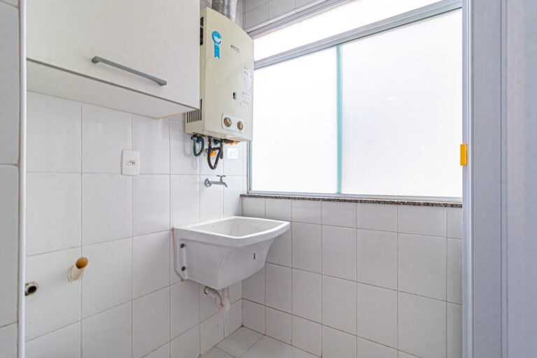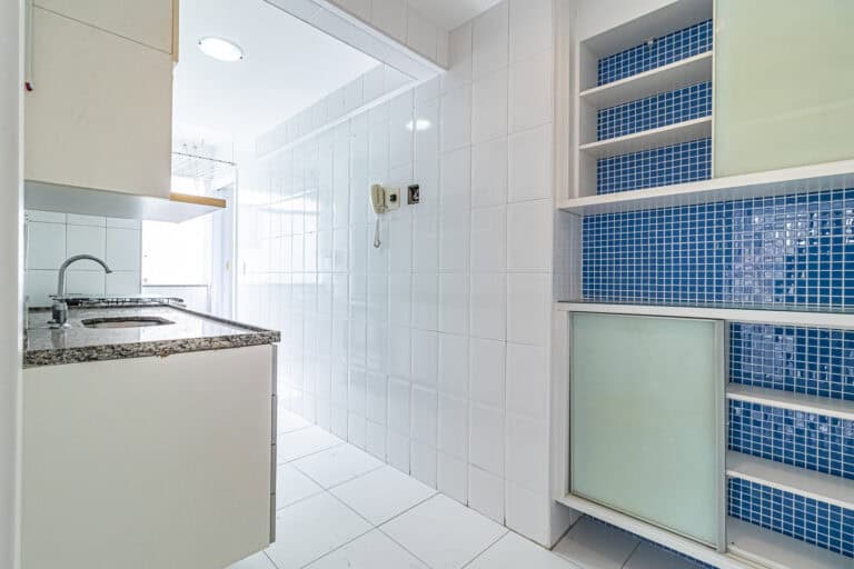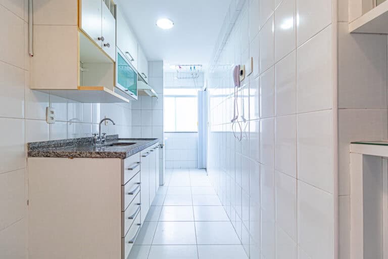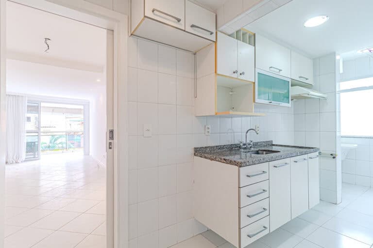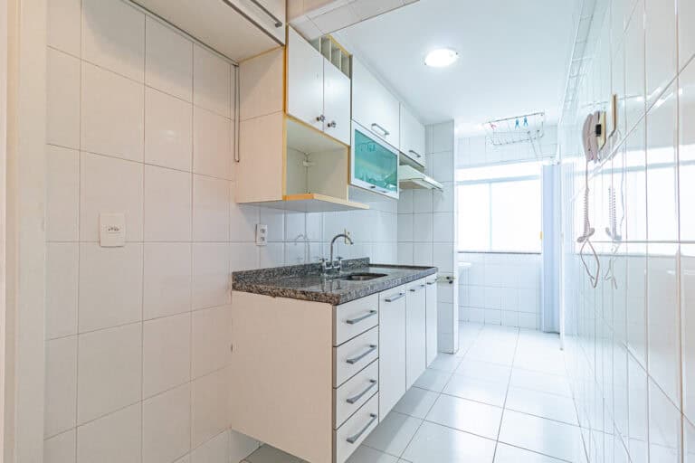 A cozinha é iluminada e repleta de armários, contando ainda com área e WC de serviço.