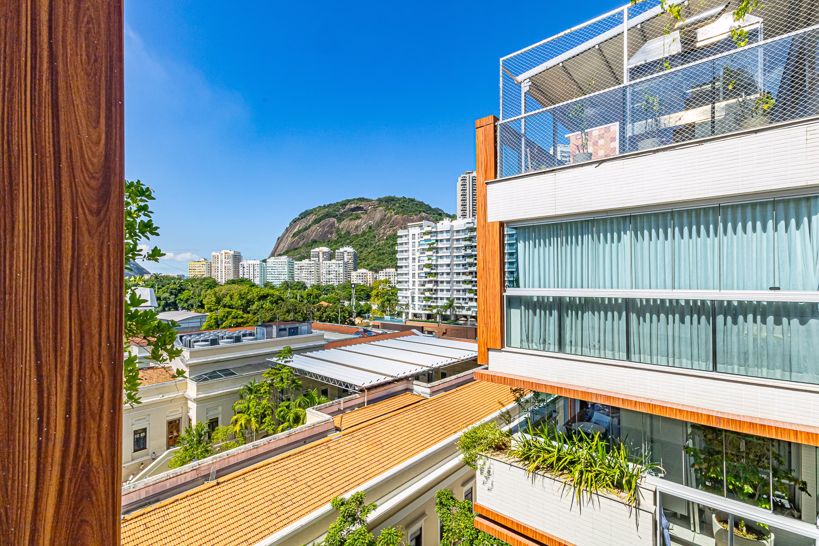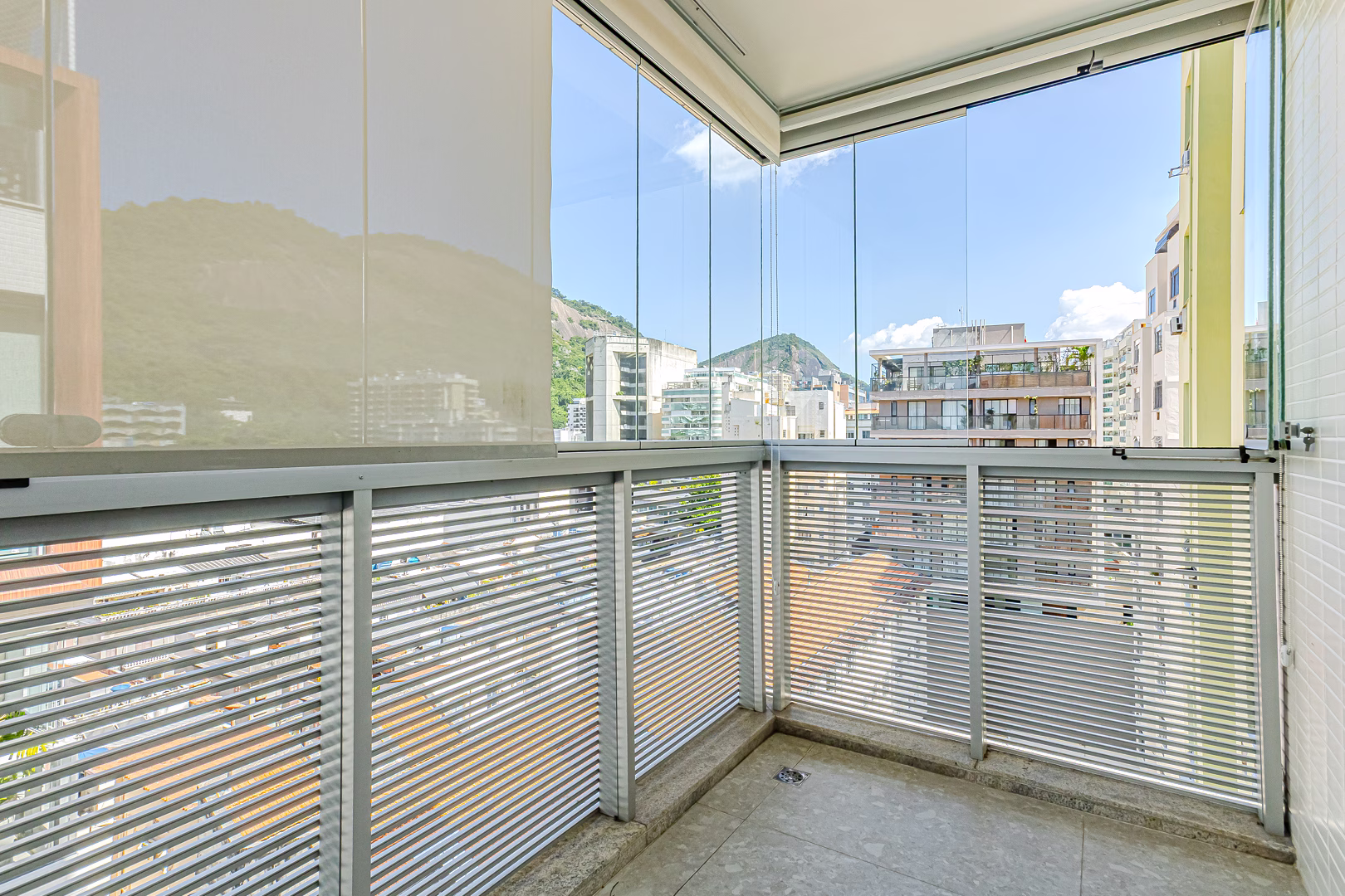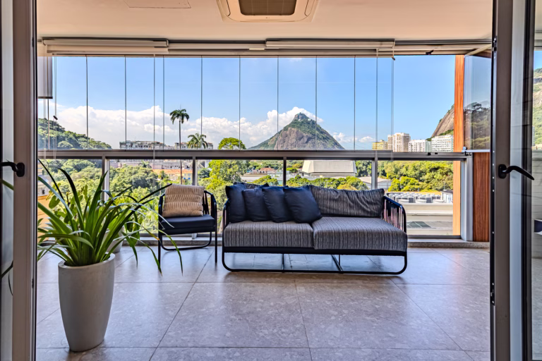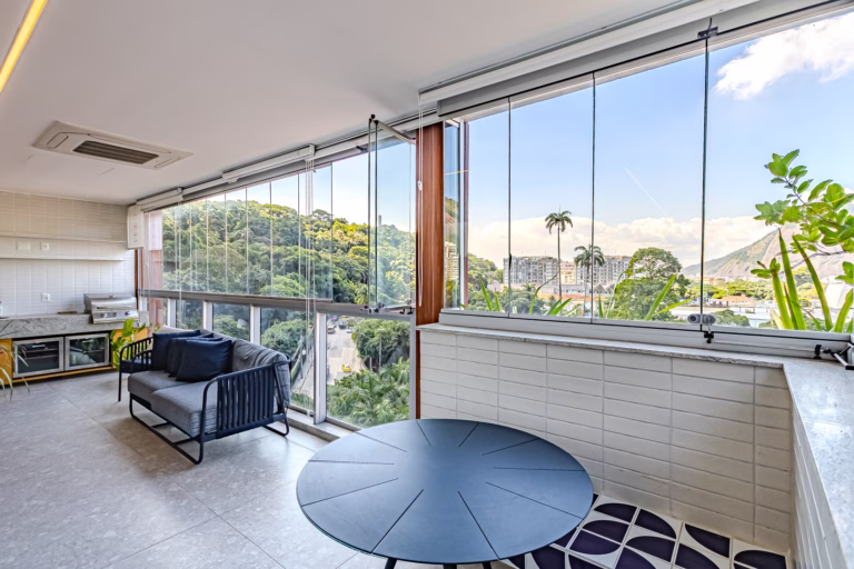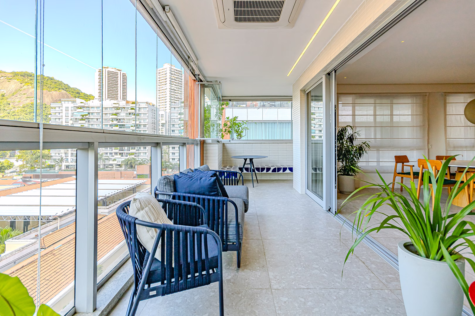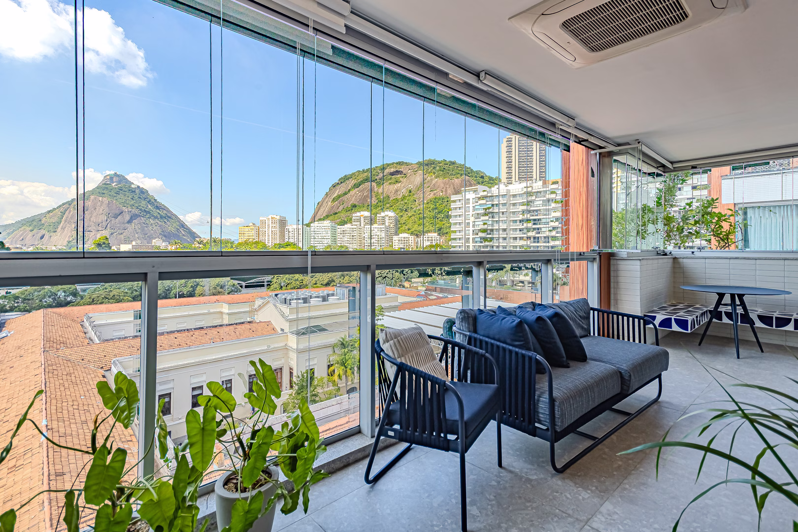 A sala é perfeita. Ampla, clara, linda e com uma vista exuberante para o Pão de Açúcar. Além disso é totalmente abraçada por uma deliciosa varanda gourmet com pele de vidro e aparelho de ar-condicionado tipo cassete (K7). Conta ainda com um lavabo de apoio.