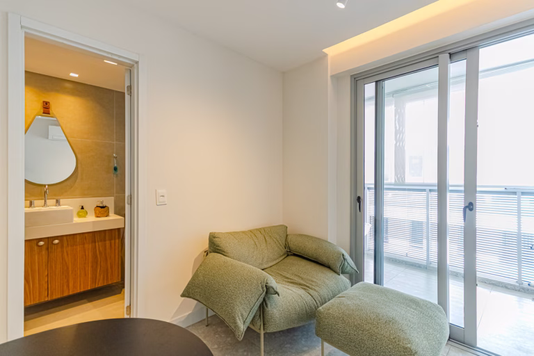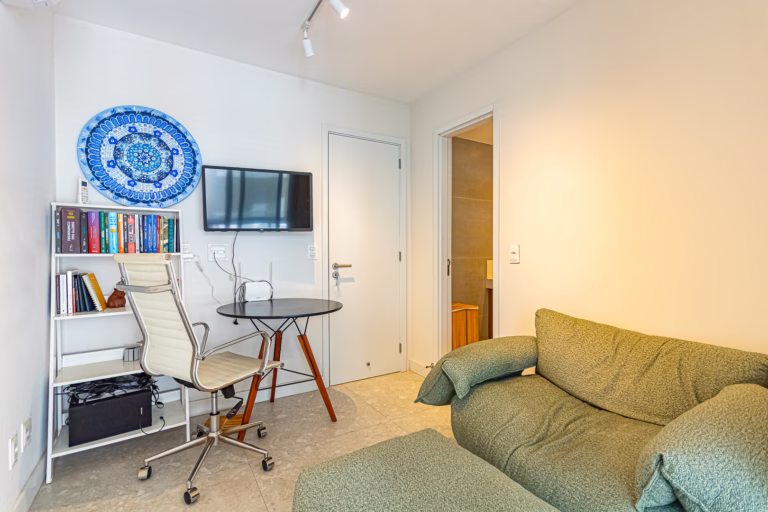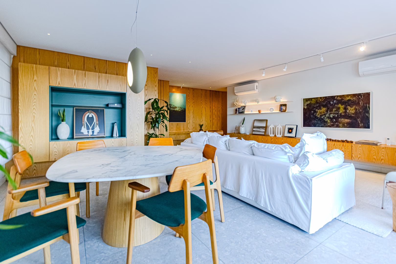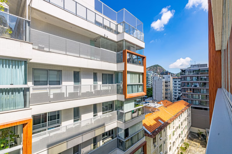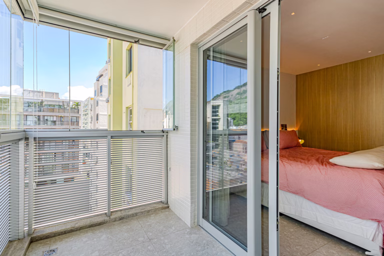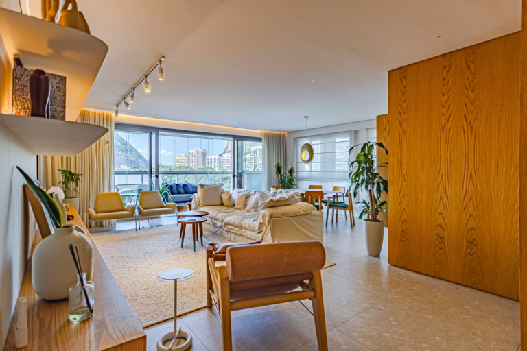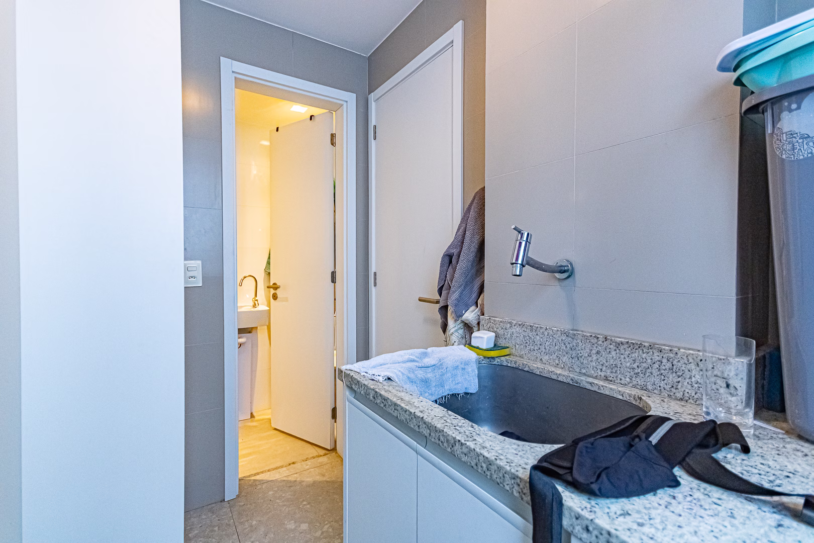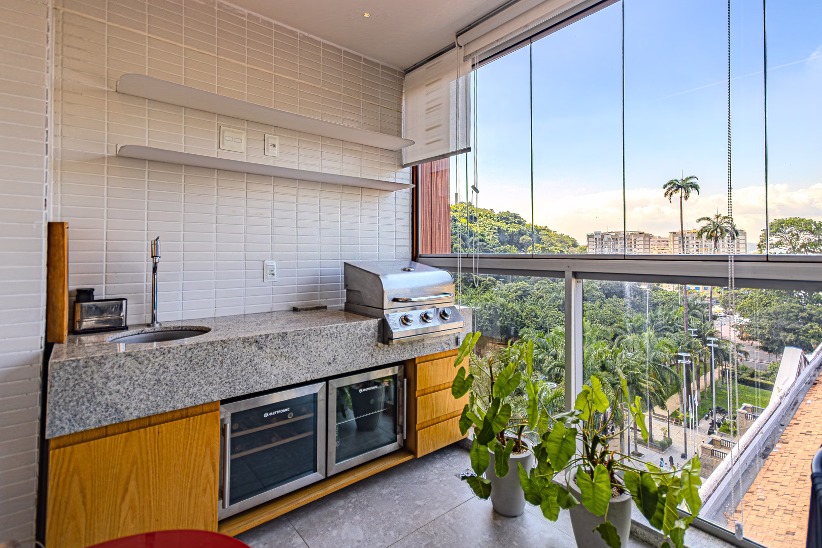 A sala é perfeita. Ampla, clara, linda e com uma vista exuberante para o Pão de Açúcar. Além disso é totalmente abraçada por uma deliciosa varanda gourmet com pele de vidro e aparelho de ar-condicionado tipo cassete (K7). Conta ainda com um lavabo de apoio.
