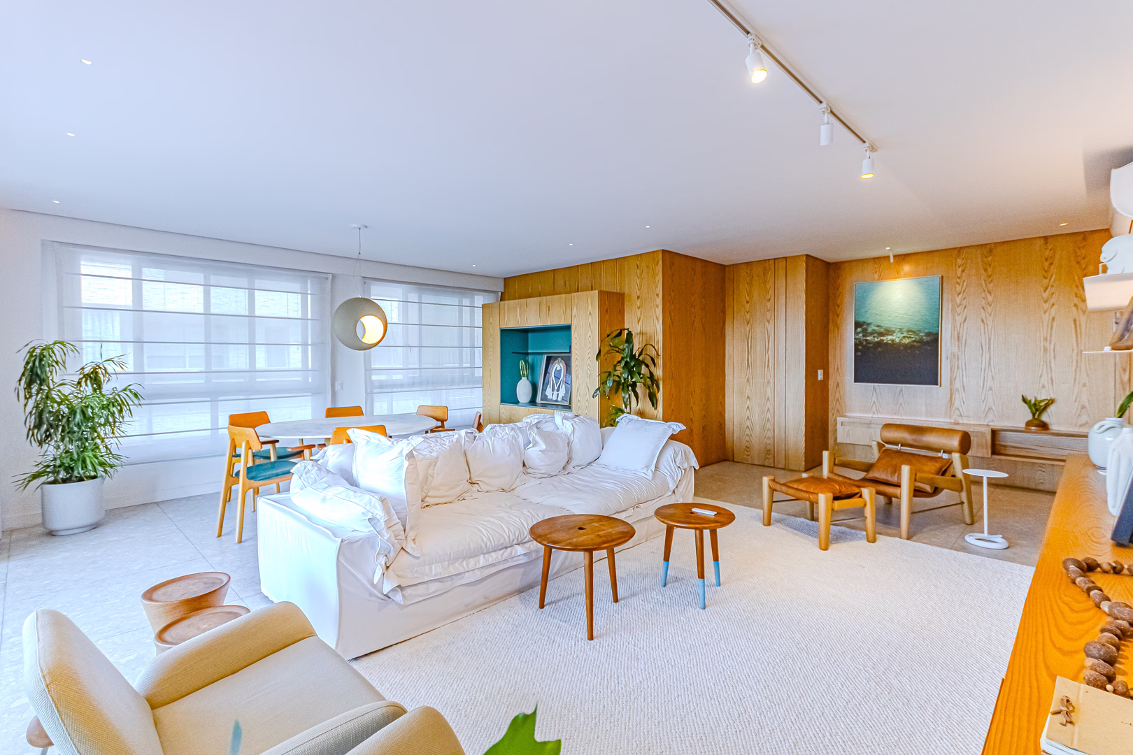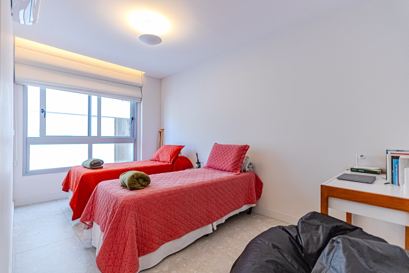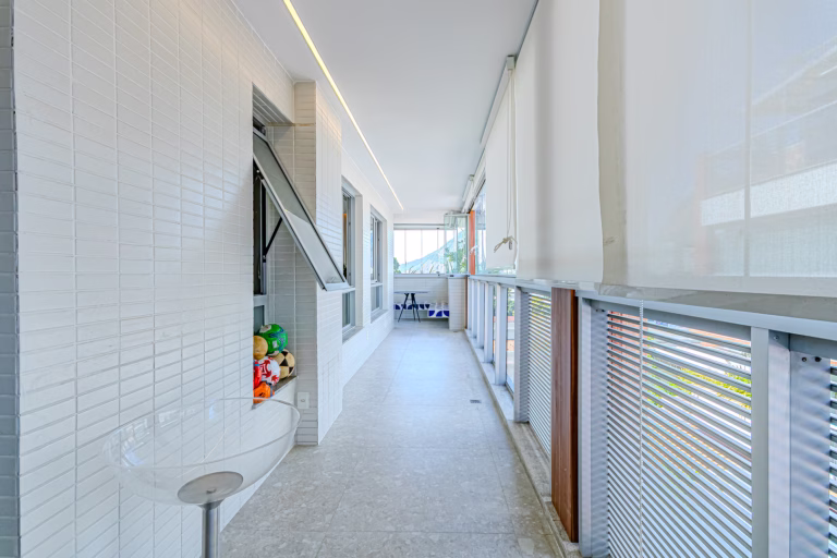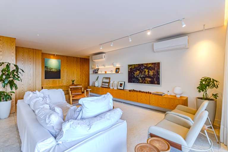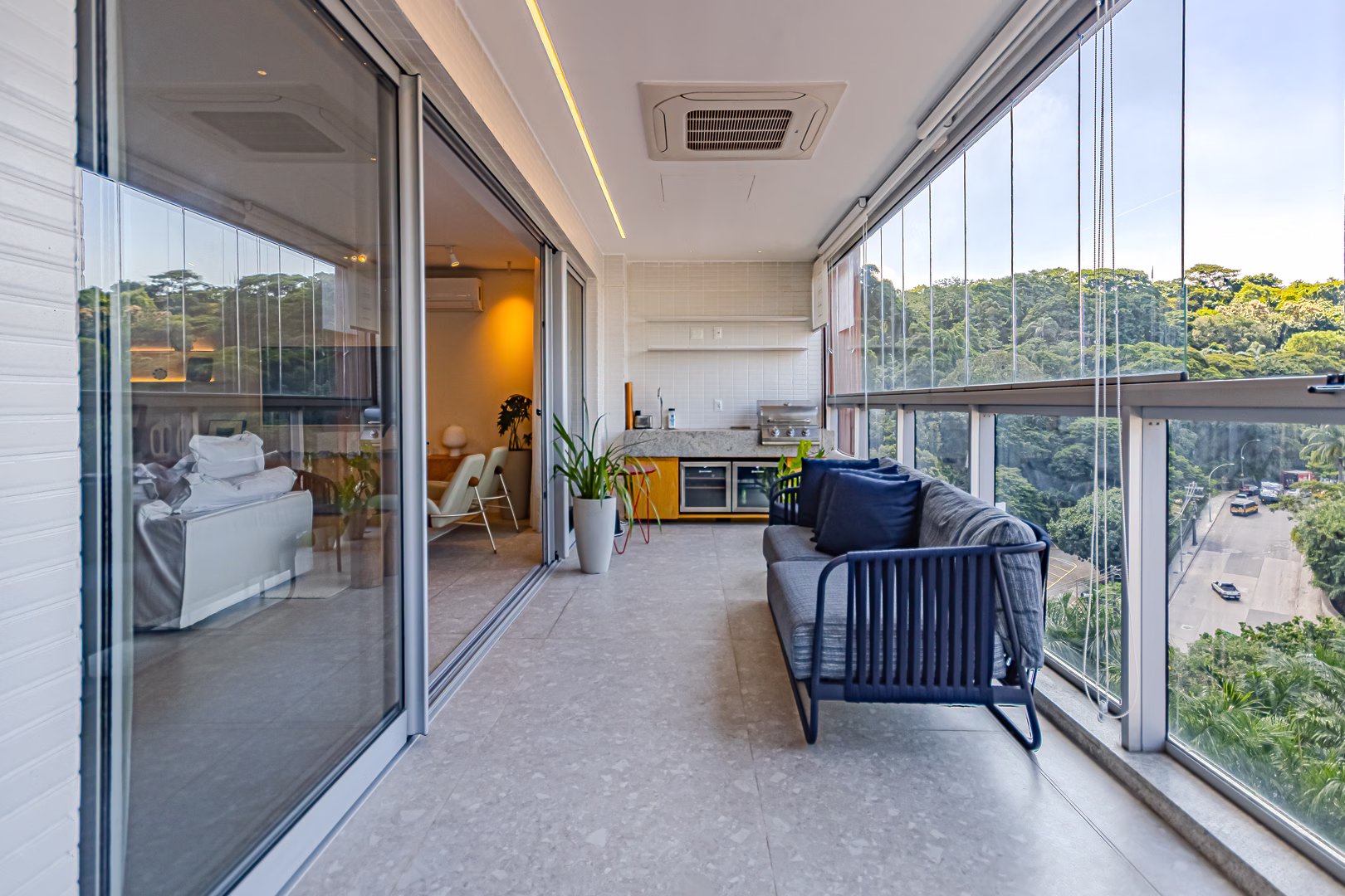 A área íntima é composta por 3 suítes, sendo que a suíte máster conta com closet e tem uma varanda privativa. Toda a marcenaria do imóvel é de primeira linha e os cômodos são climatizados com aparelhos de ar-condicionado tipo split.