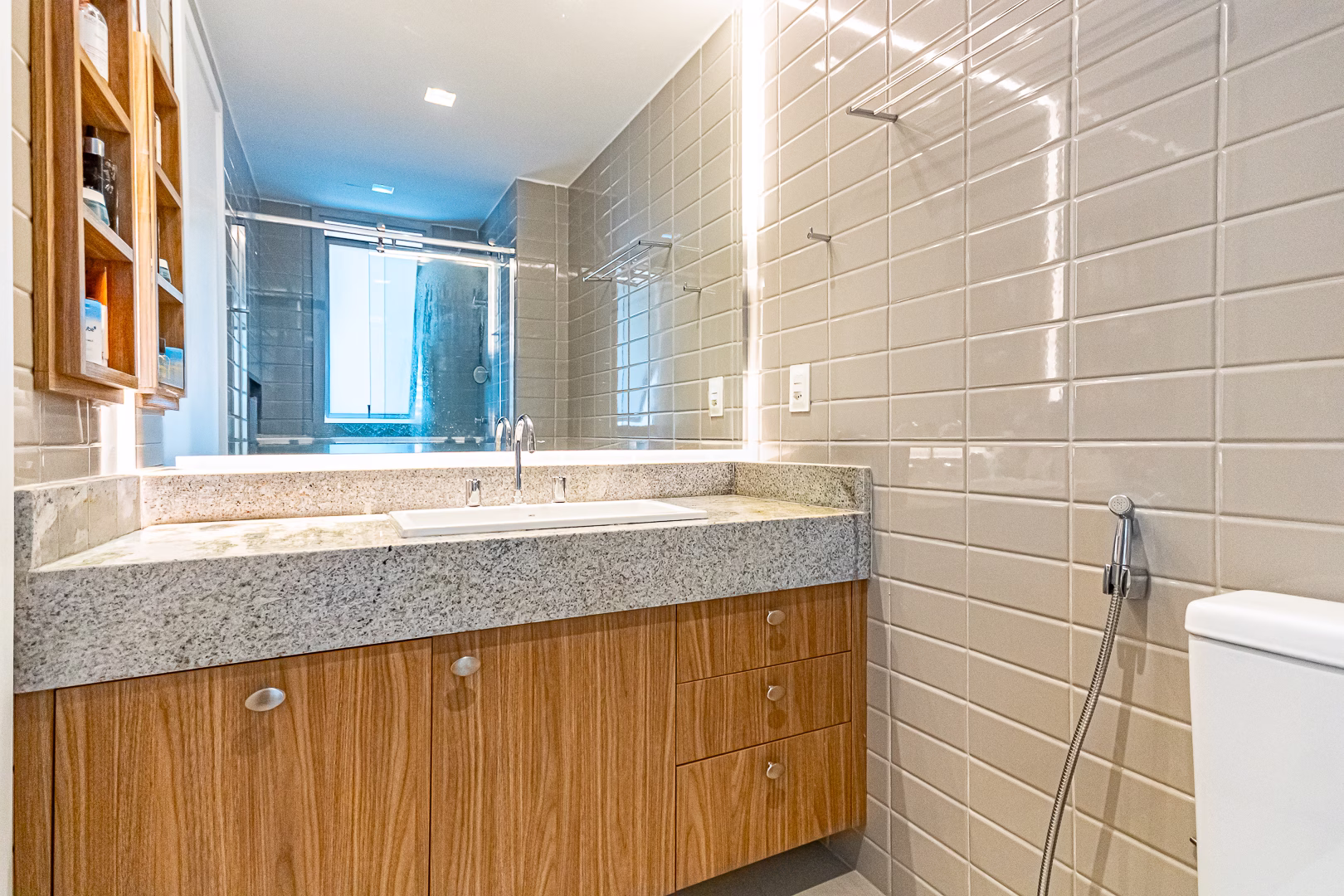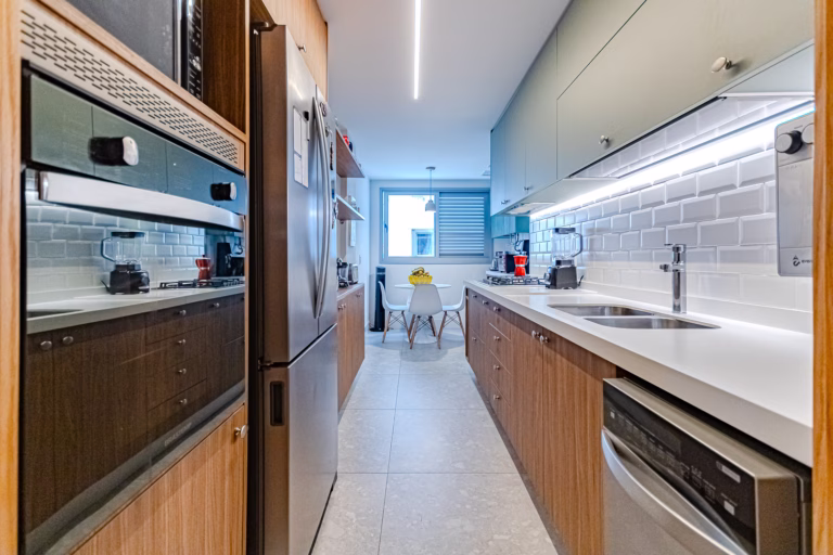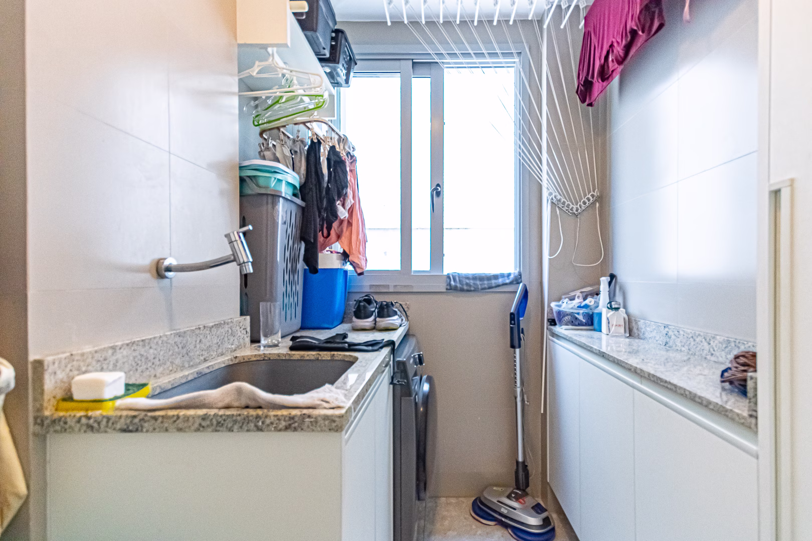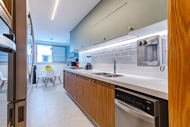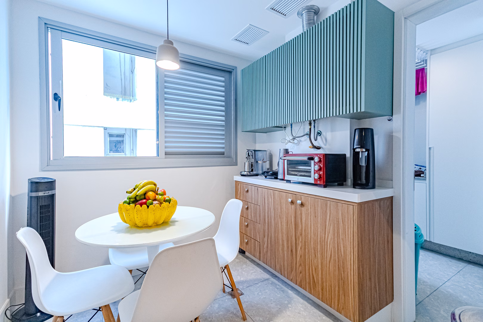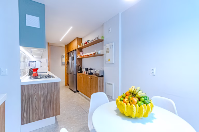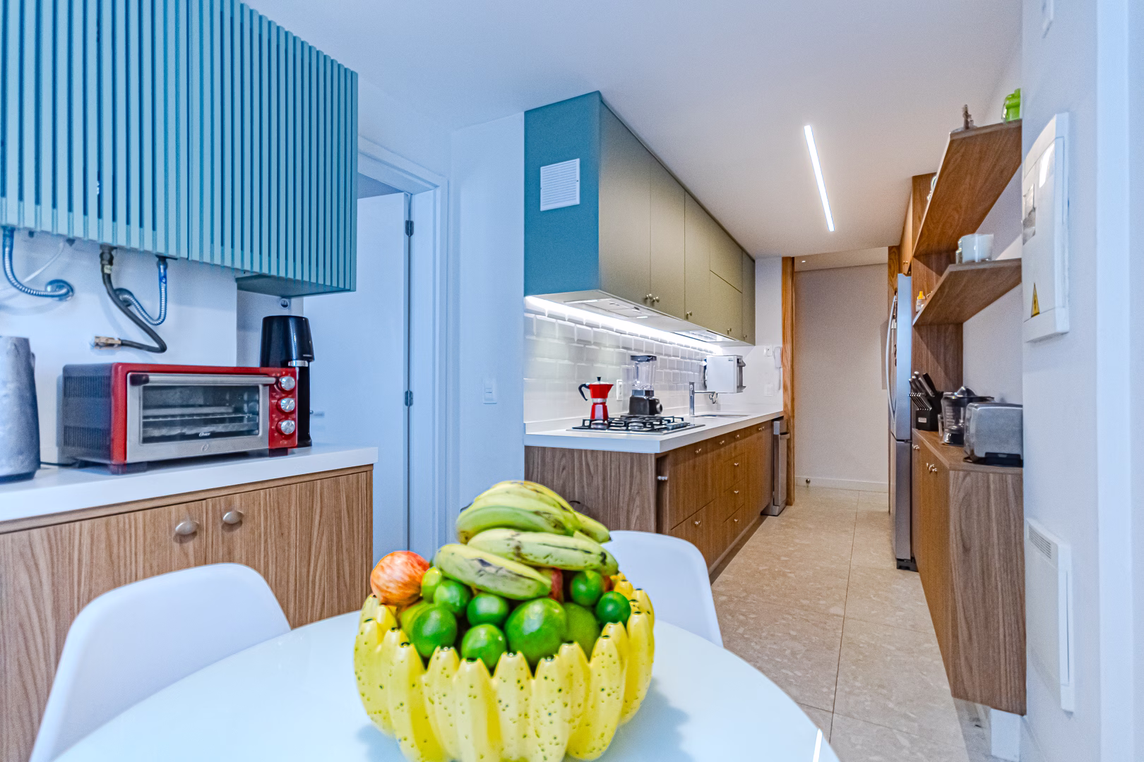 A cozinha também é ótima. Repleta de armários com tons de azul e madeira, deixando o ambiente muito aconchegante. A dependência foi transformada em área de serviço para que a cozinha pudesse ter uma copa com uma mesinha de 4 lugares, essencial no dia a dia. Conta ainda com um WC.