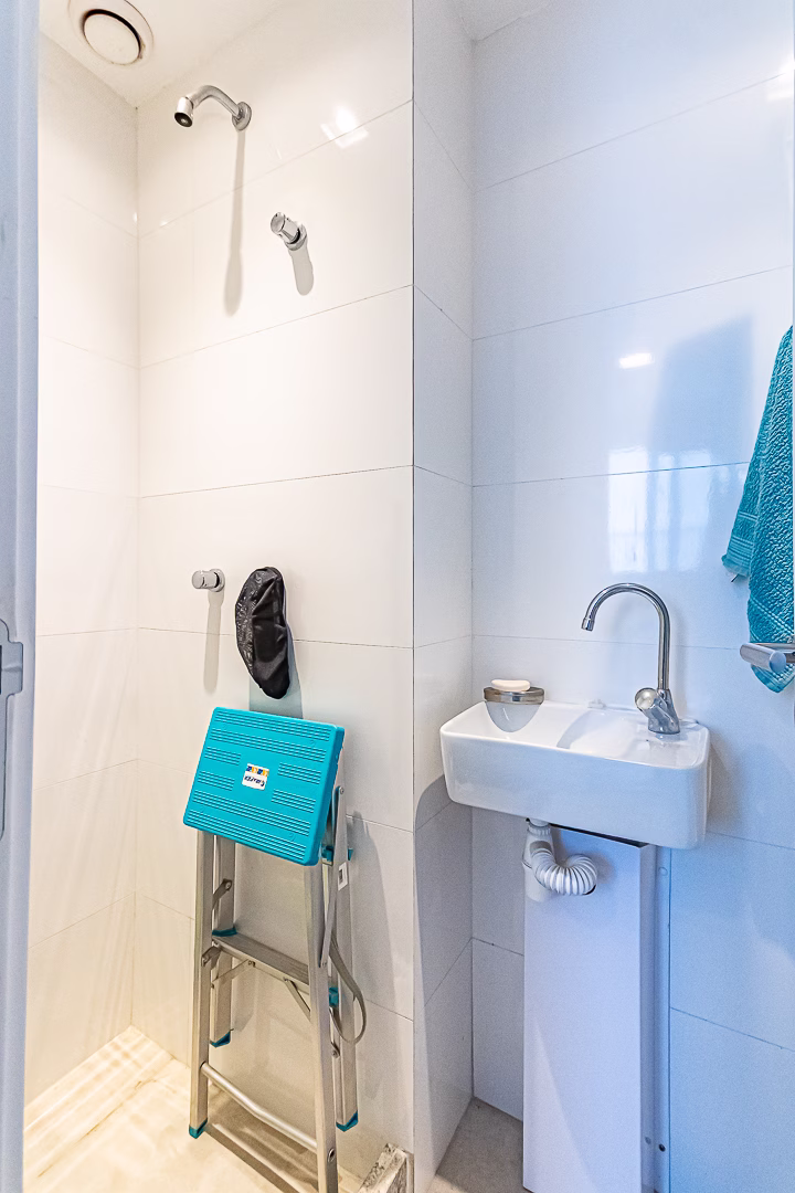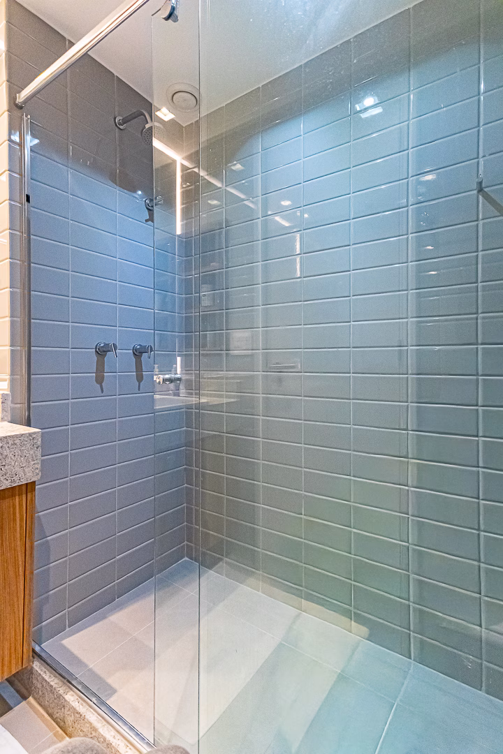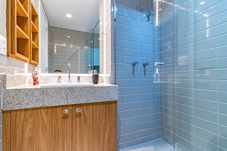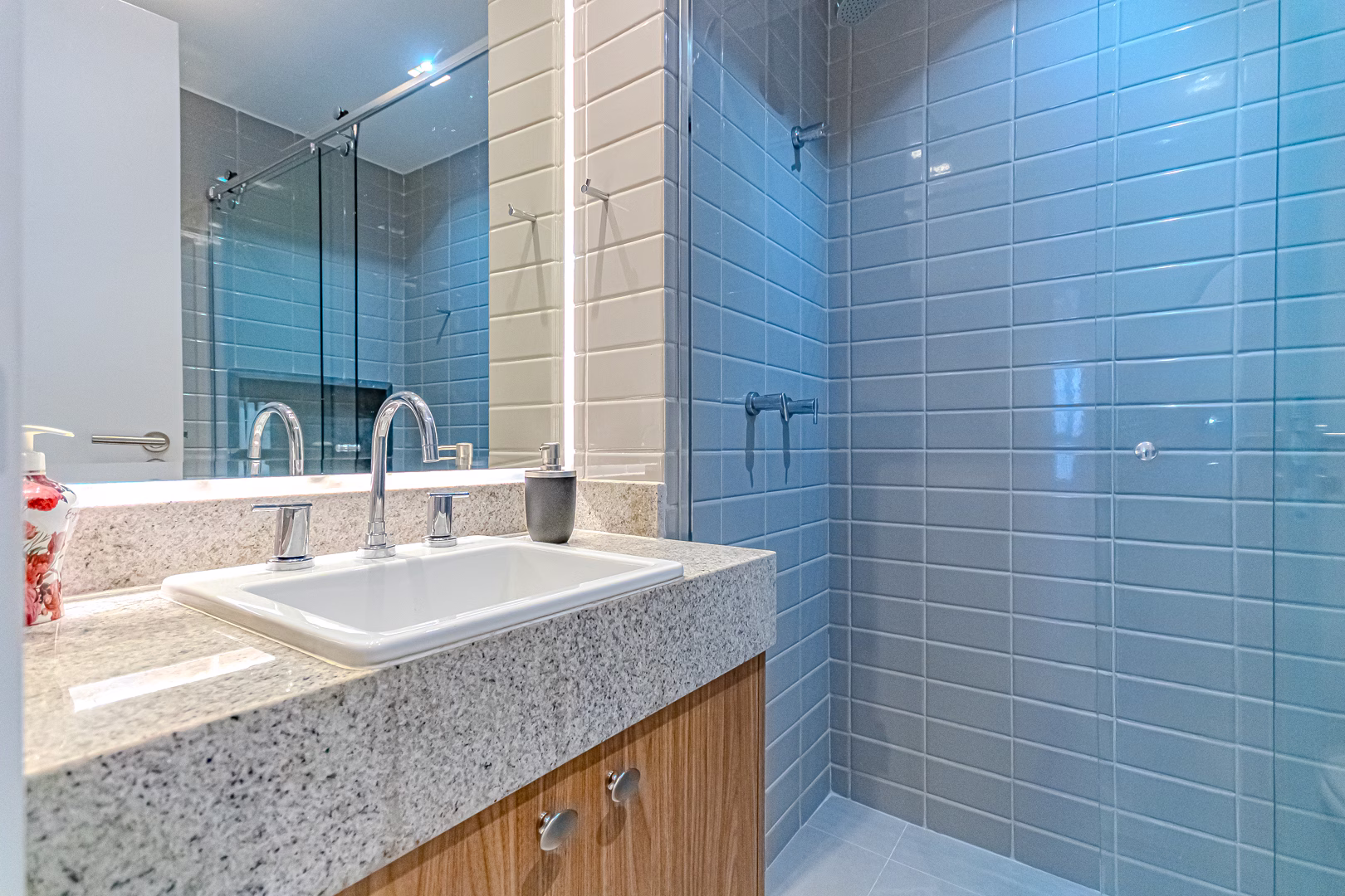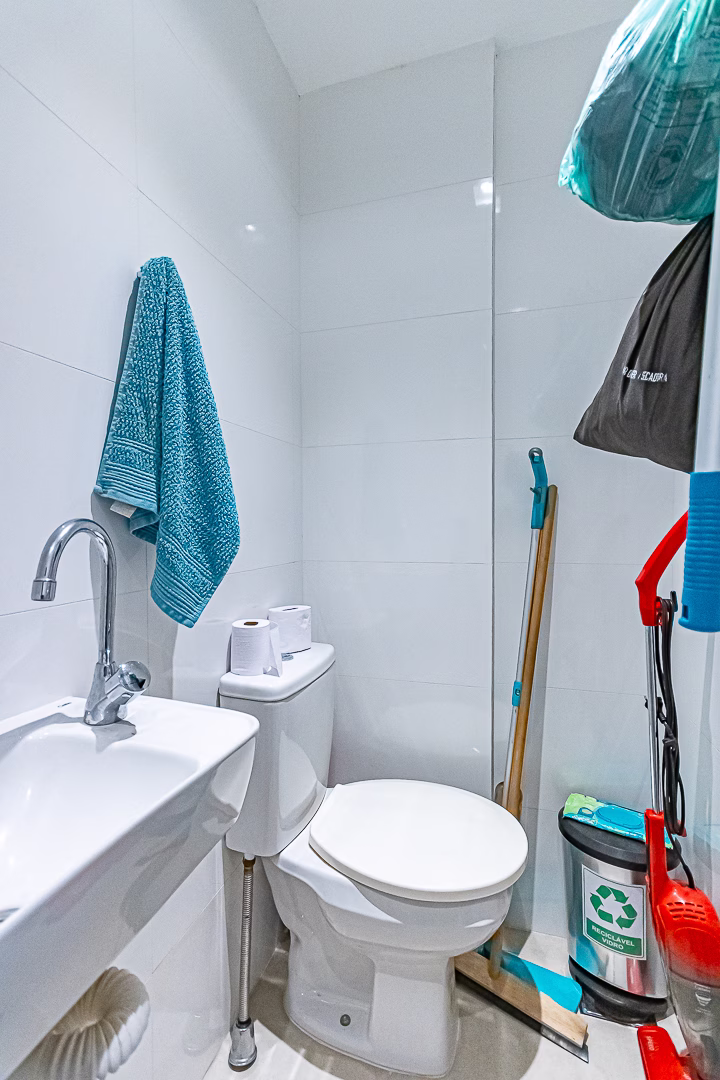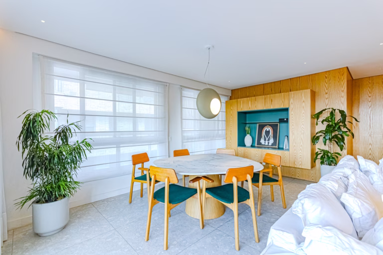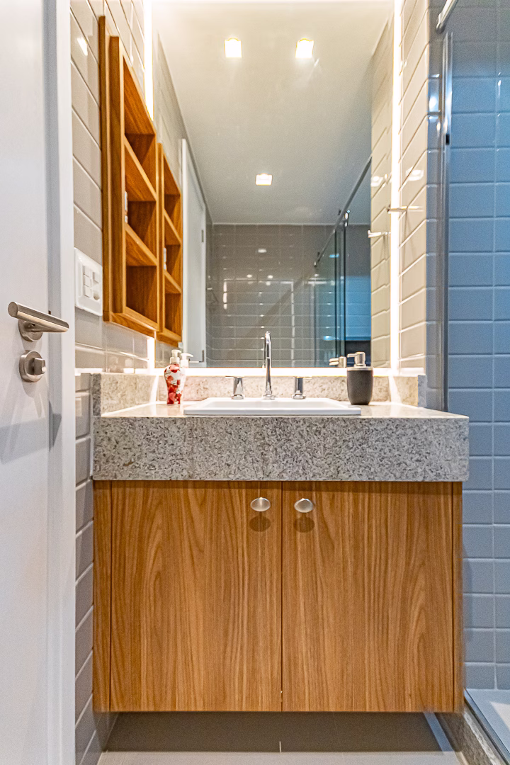 A cozinha também é ótima. Repleta de armários com tons de azul e madeira, deixando o ambiente muito aconchegante. A dependência foi transformada em área de serviço para que a cozinha pudesse ter uma copa com uma mesinha de 4 lugares, essencial no dia a dia. Conta ainda com um WC.