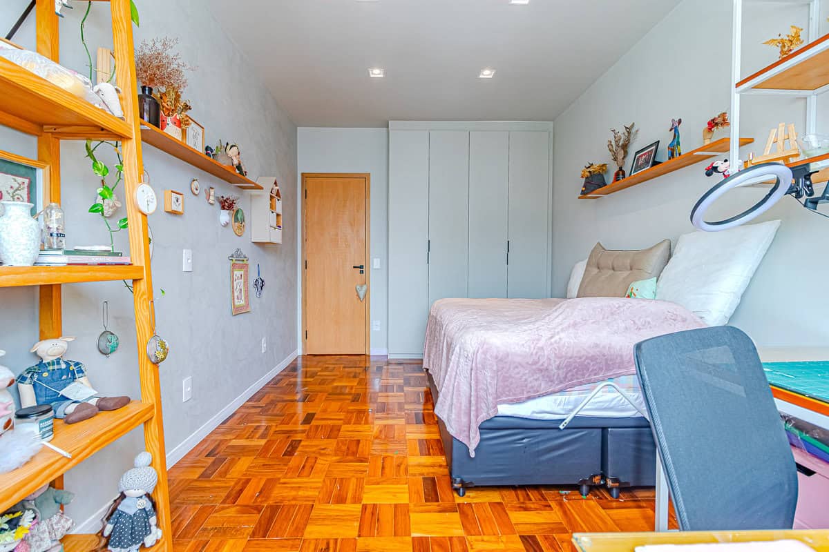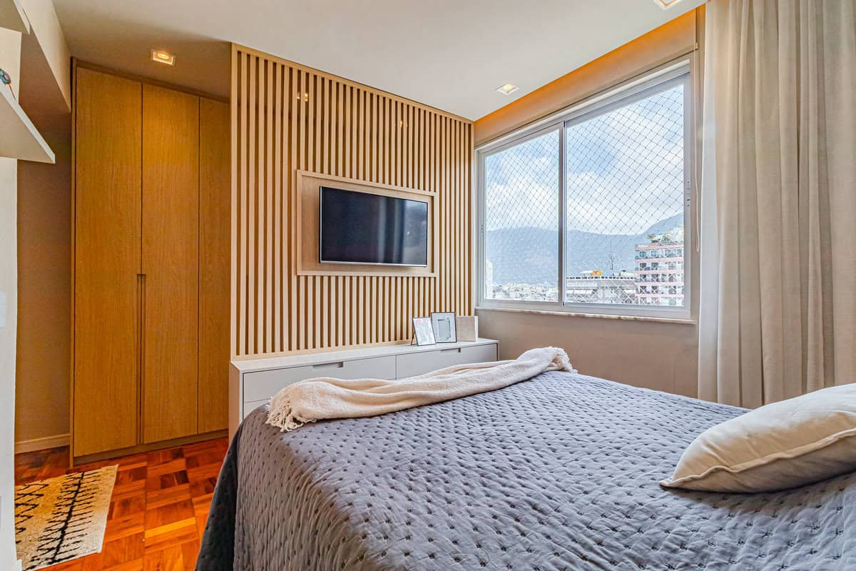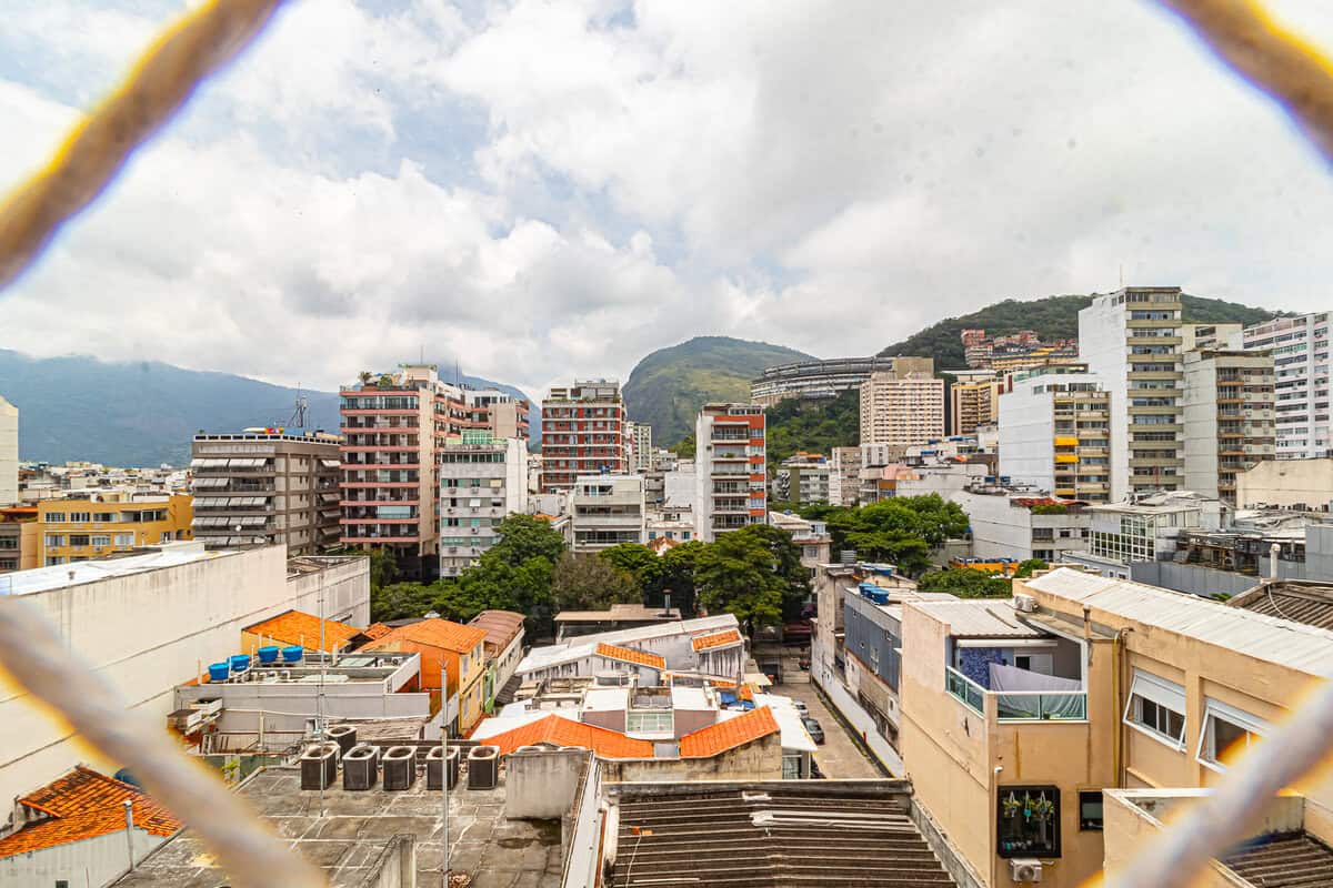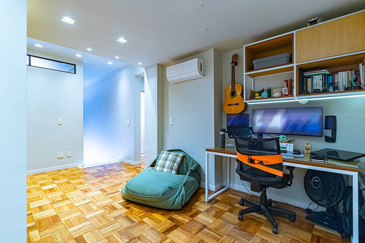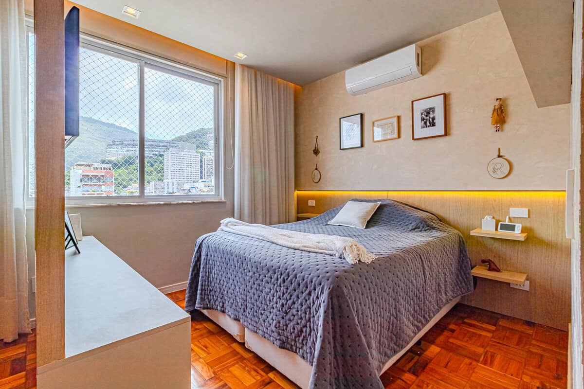 A área íntima, que fica toda no piso superior, é composta por 3 quartos, sendo 1 suíte, mais 1 banheiro social e 1 hall que funciona como escritório. A suíte master conta com closet e os 3 quartos têm a mesma vista da sala, voltada para o Cristo Redentor.