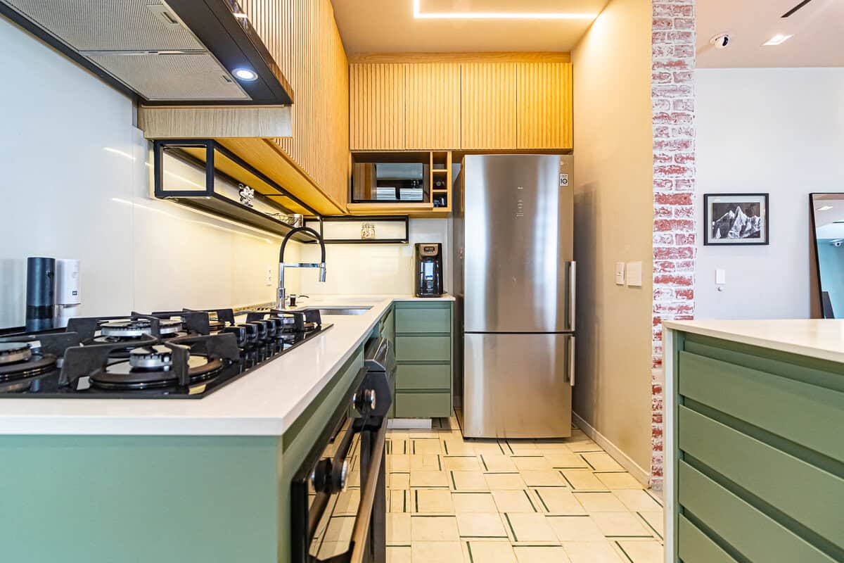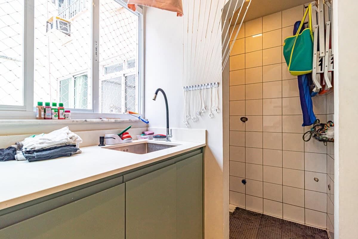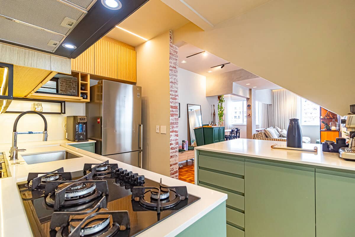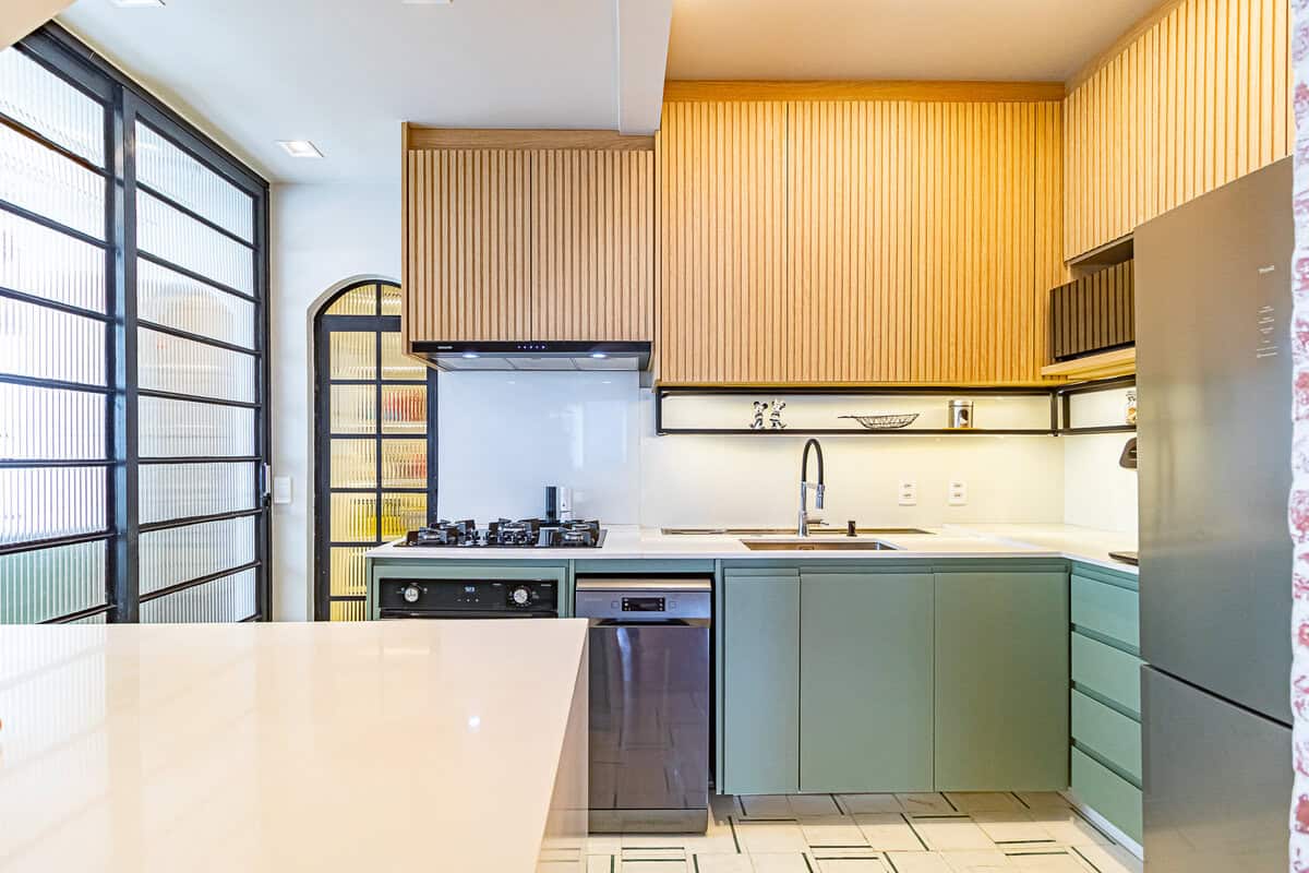 A cozinha é uma graça, com uma harmonia perfeita entre o piso, diferentes tons de madeira, revstimento das paredes e portas de serralheria. Conta ainda com despensa e área de serviço.