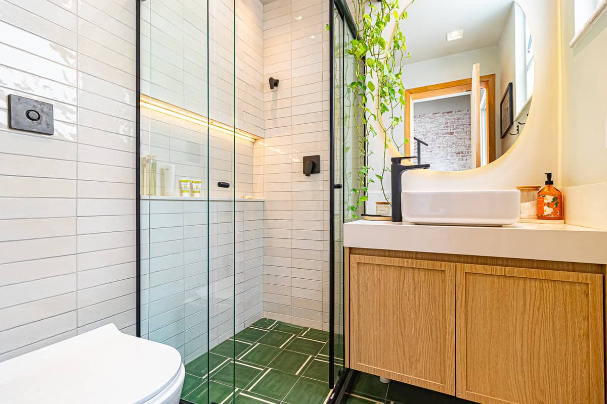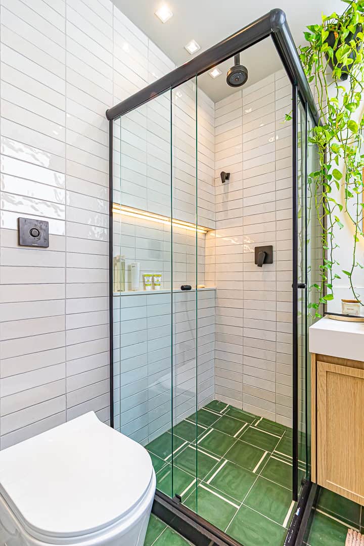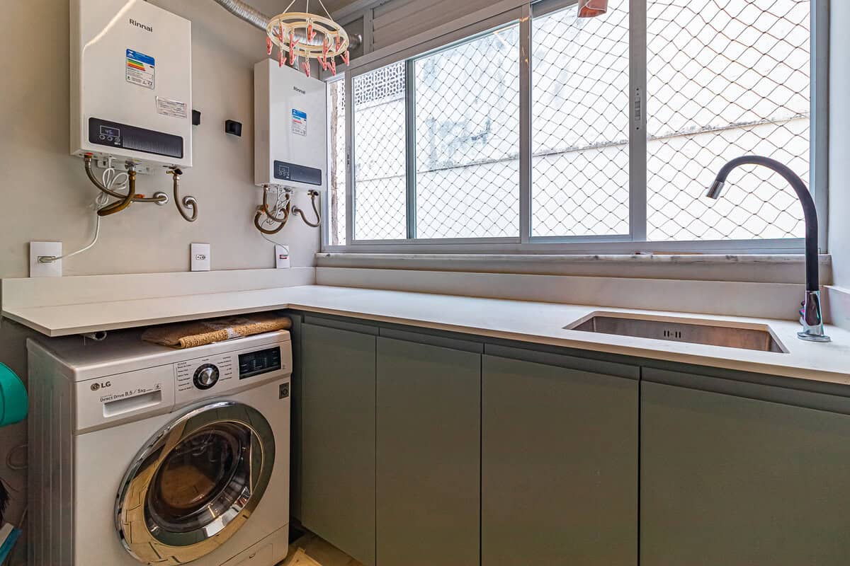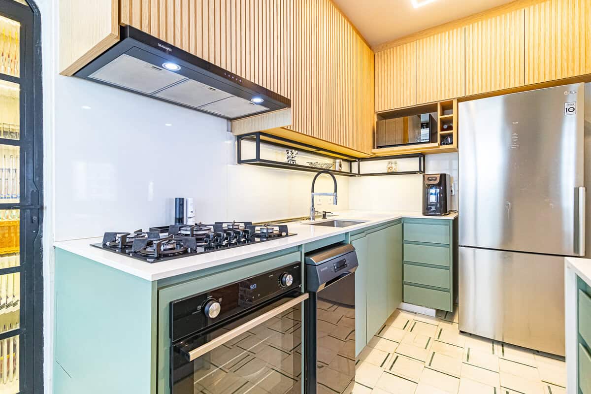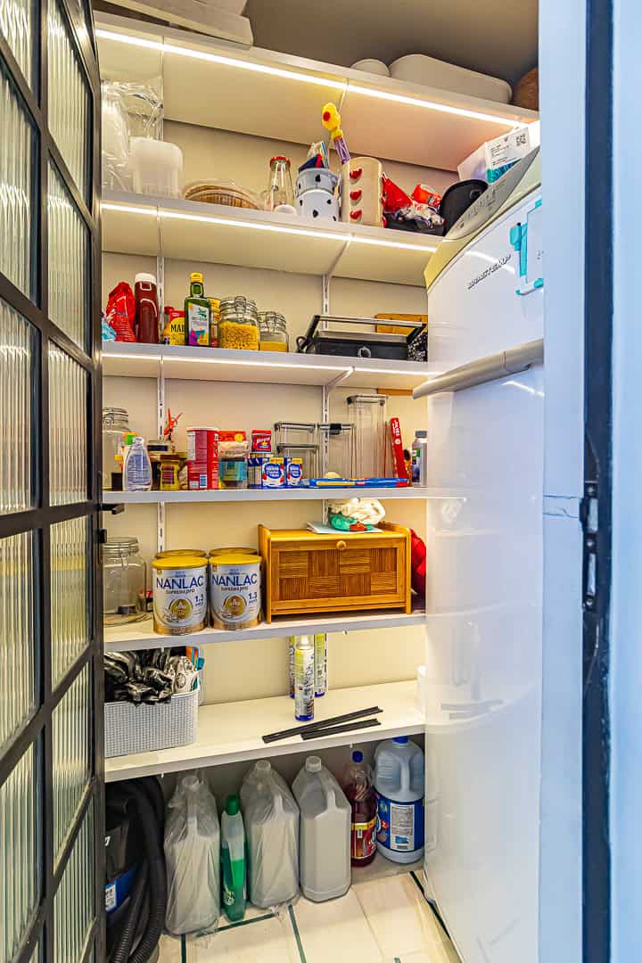 A cozinha é uma graça, com uma harmonia perfeita entre o piso, diferentes tons de madeira, revstimento das paredes e portas de serralheria. Conta ainda com despensa e área de serviço.