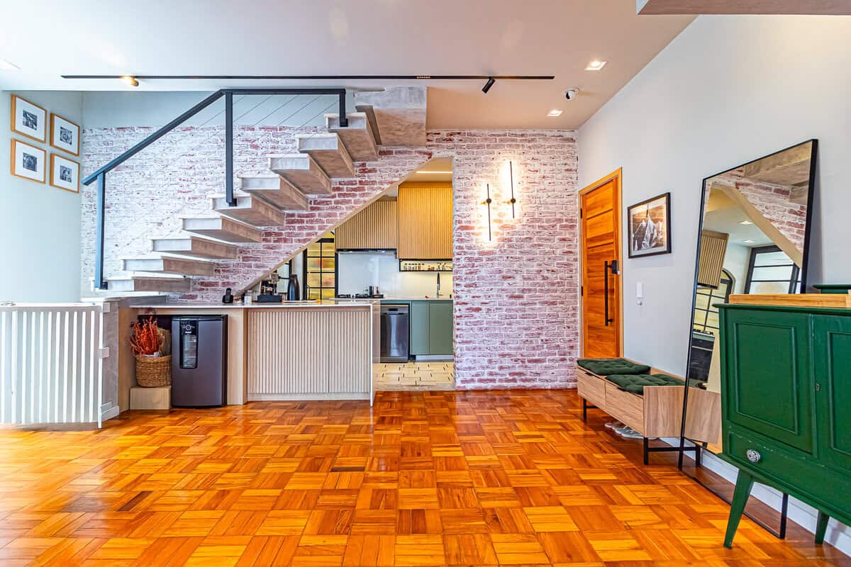 No 1º piso ficam a sala, banheiro social, cozinha e área de serviço.