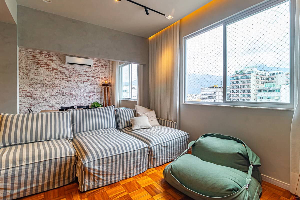 A sala é muito ampla e arejada, com janelas em paredes distintas, possibilitando maior circulação de ar. O piso de tacos, parede revestida com tijolinhos e a vista para o Cristo, completam o ambiente. Conta ainda com um banheiro social completo.