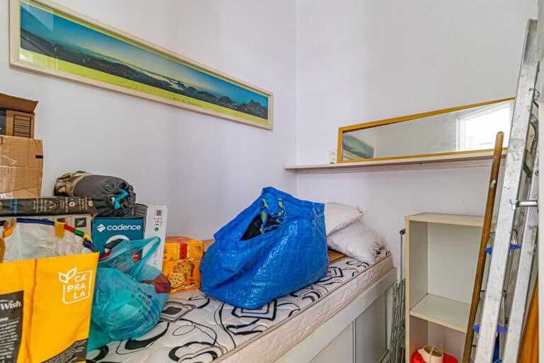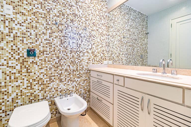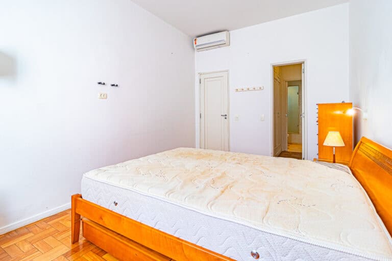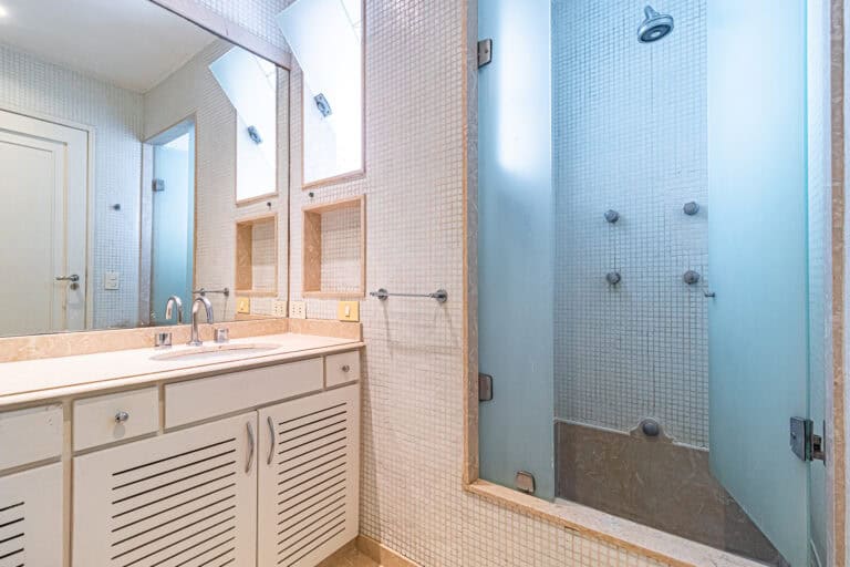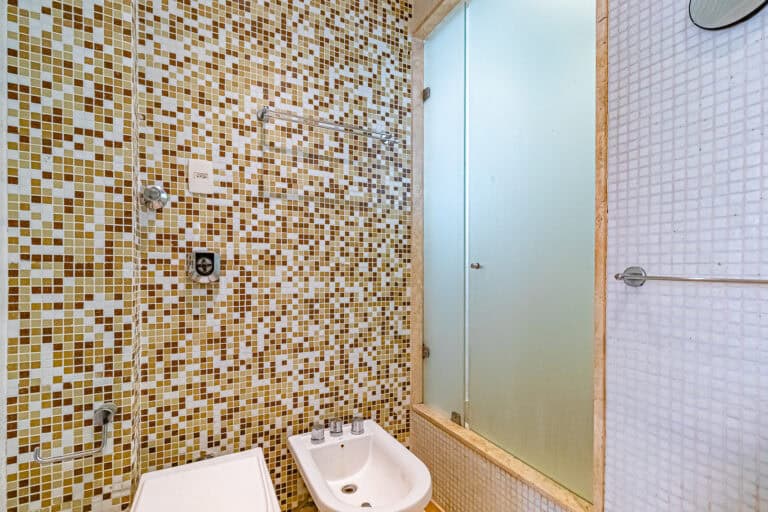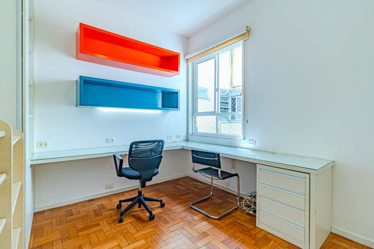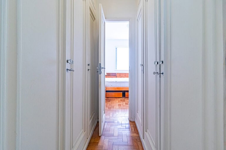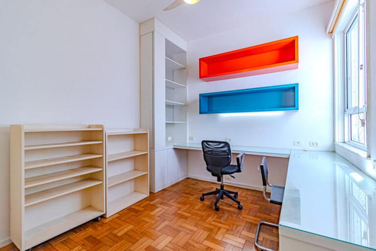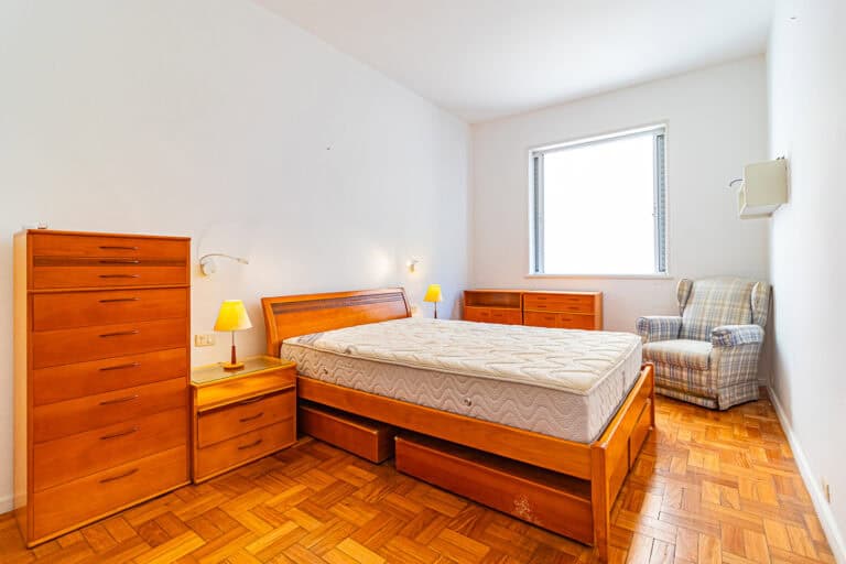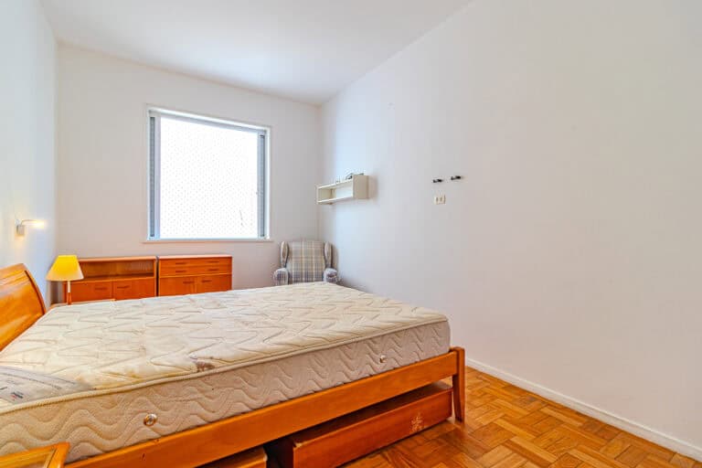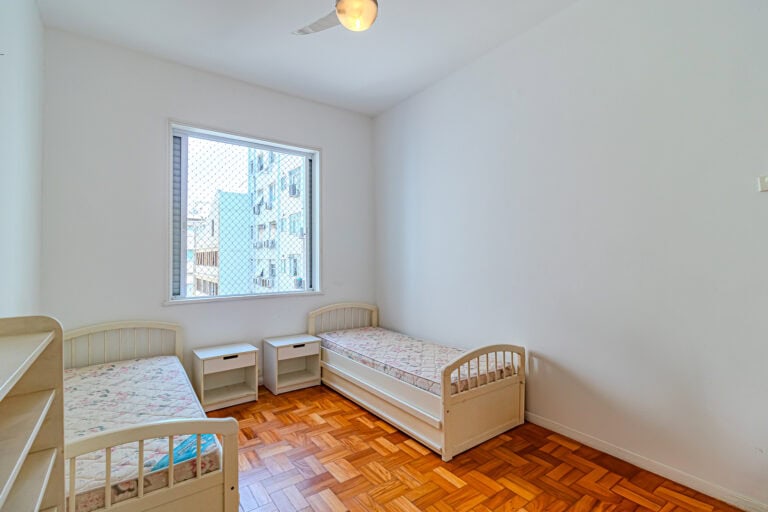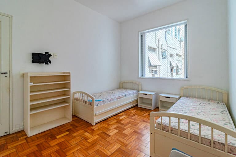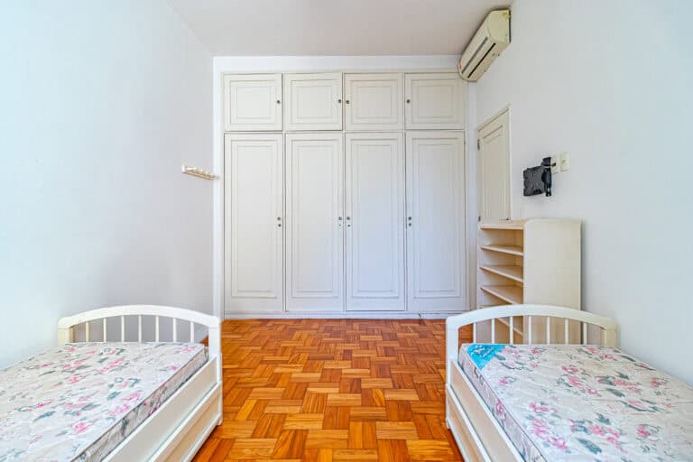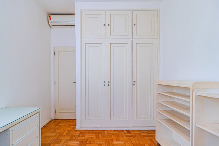 A área íntima fica nos fundos do apê. Apesar de não terem vista, os quartos são bem silenciosos. No total são 3 quartos, sendo 1 suíte com closet. Todos contam com armários e aparelhos de ar-condicionado tipo split. Os banheiros, tanto o da suíte, quanto o social, são ventilados naturalmente.