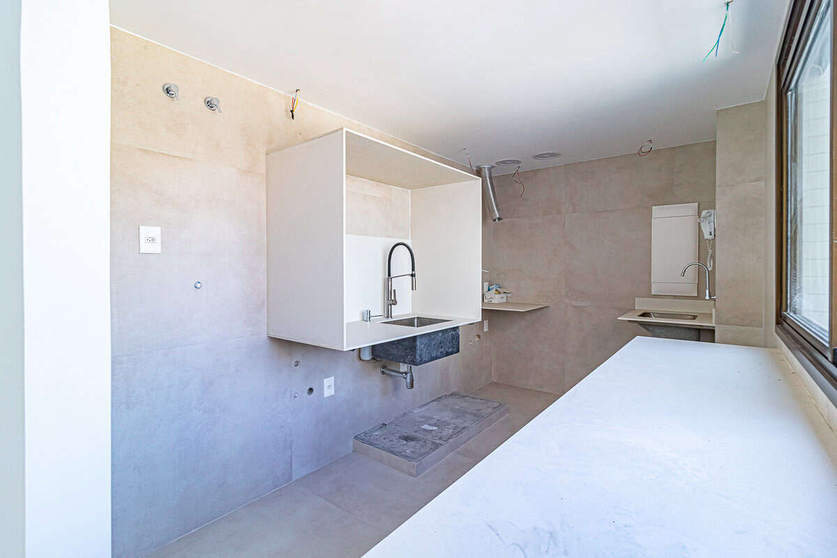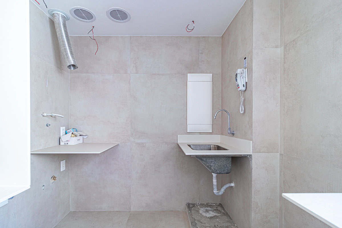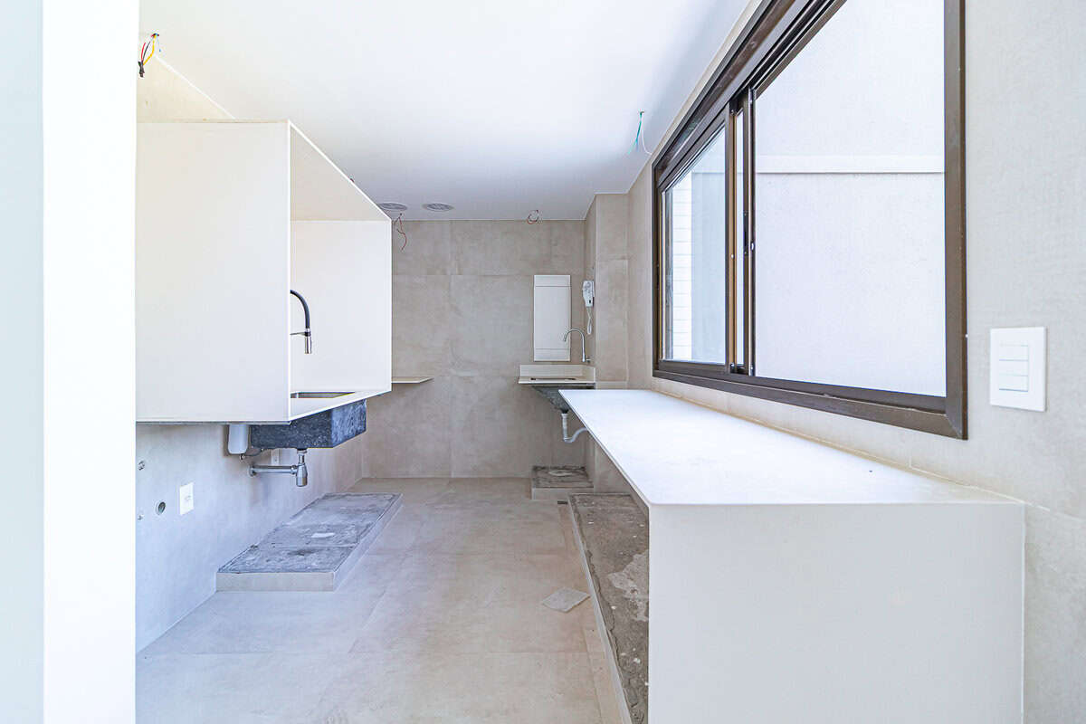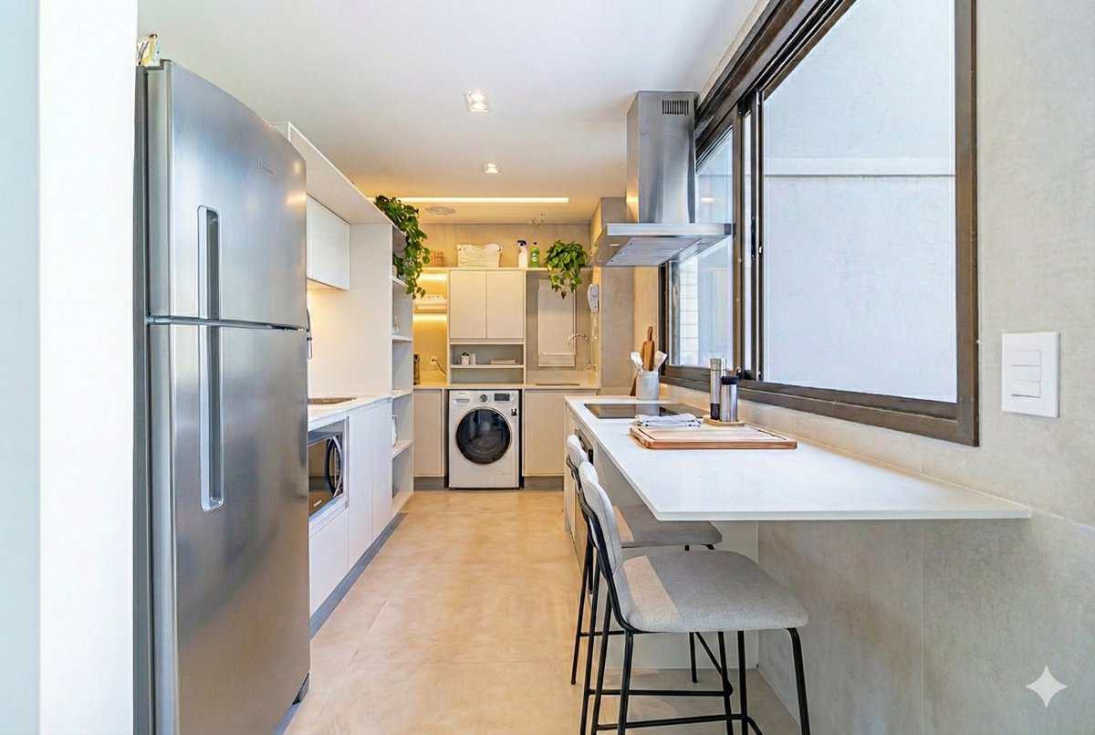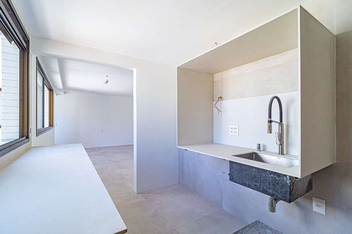 A cozinha, aberta para a sala, também é bastante iluminada. Conta com uma pequena área de serviço.