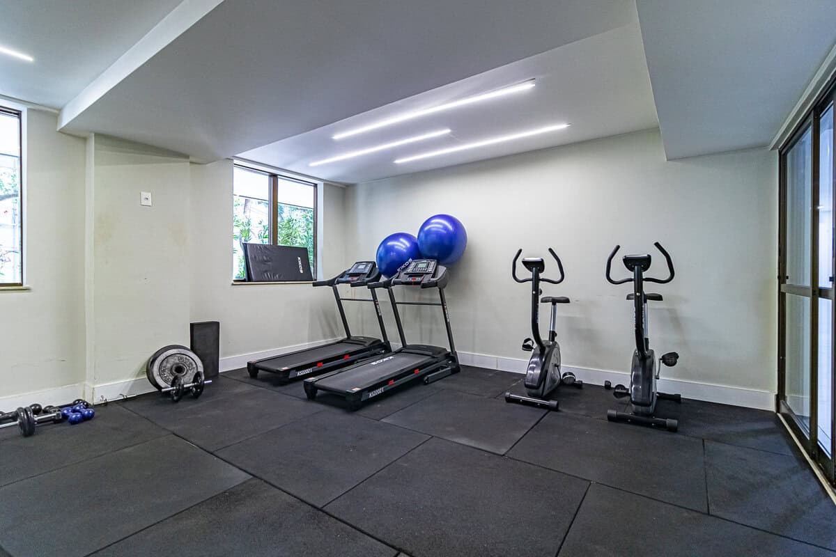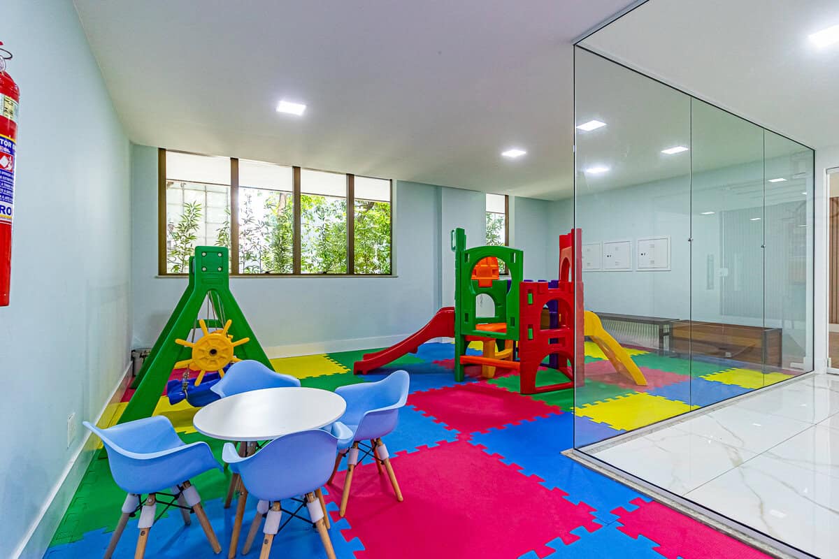 O prédio tem 2 piscinas, sauna, academia, salão de festas e playground.