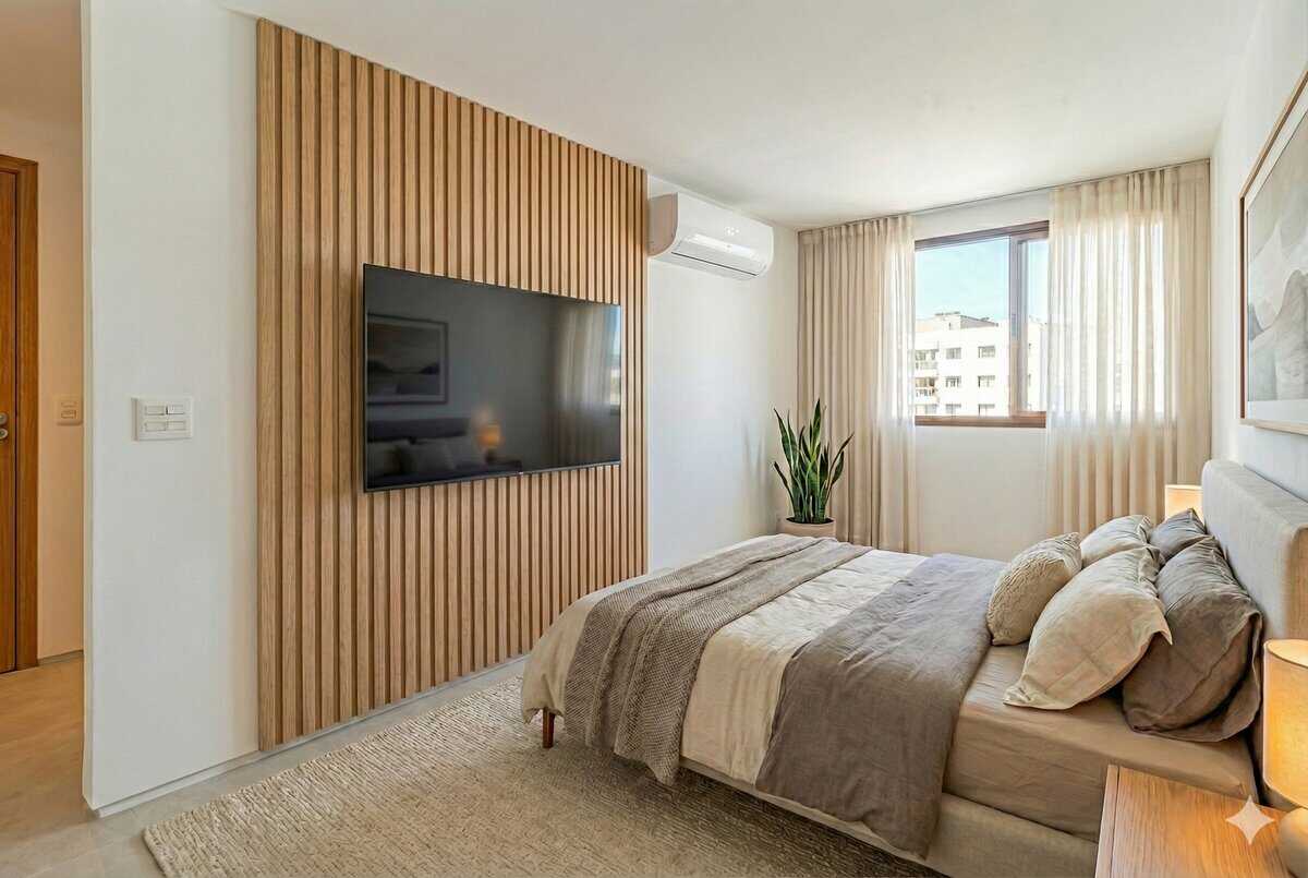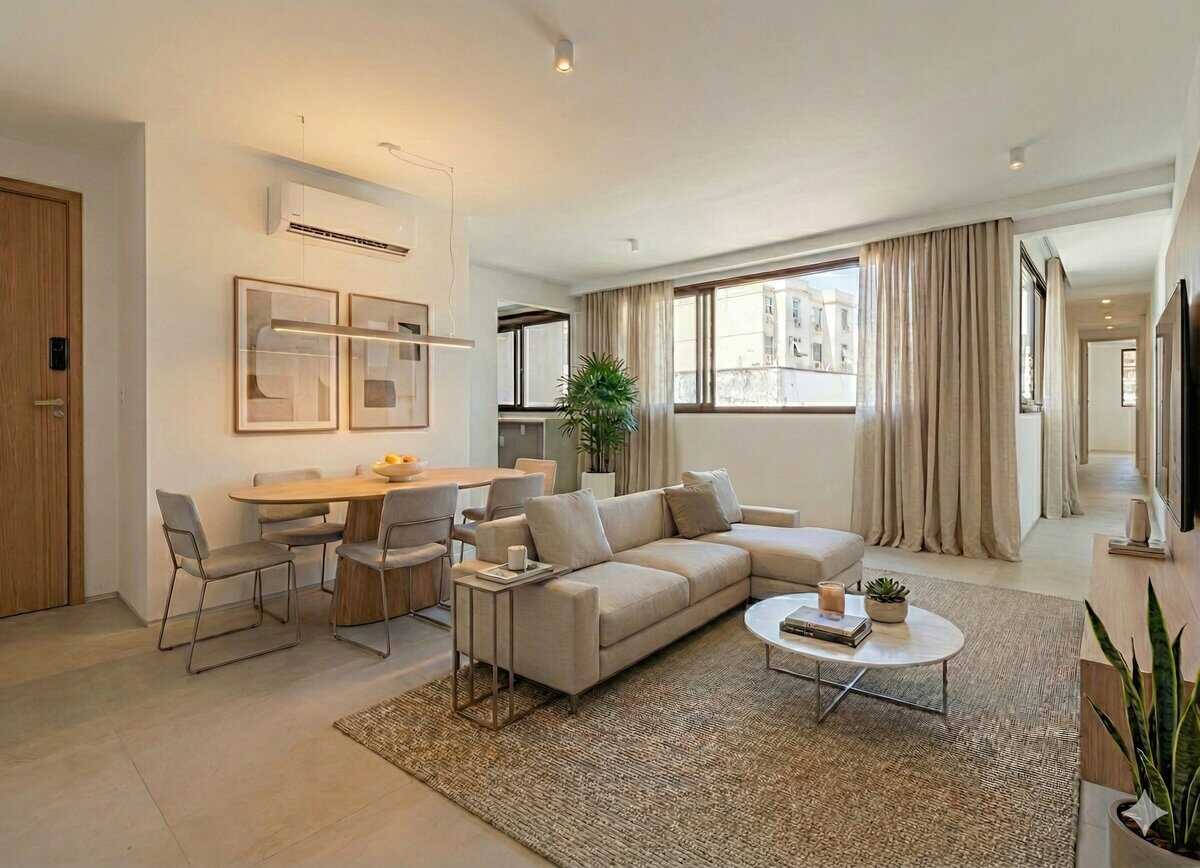 Como o está sem nenhuma mobília, criamos 3 imagens com ajuda da inteligência artificial, para que você consiga entender melhor a dimensão dos cômodos.