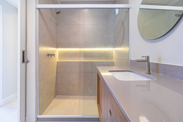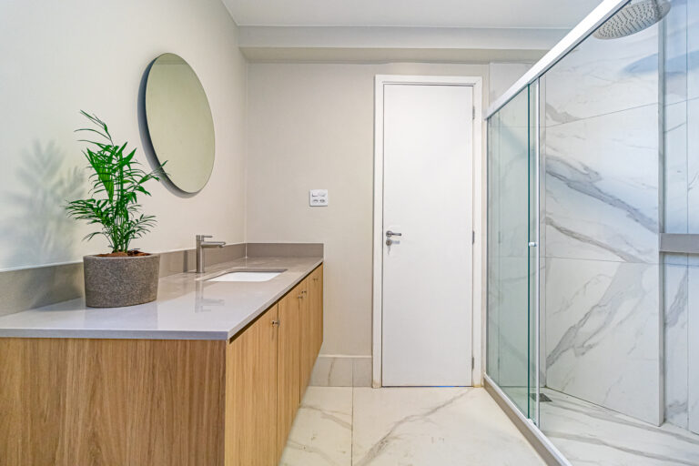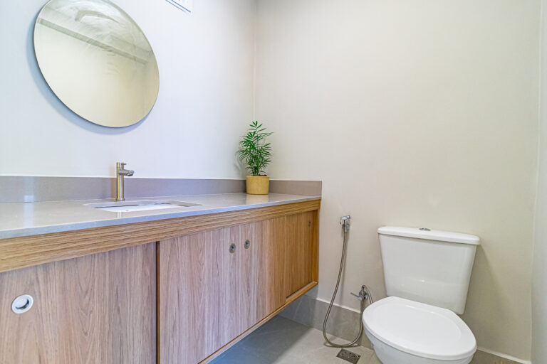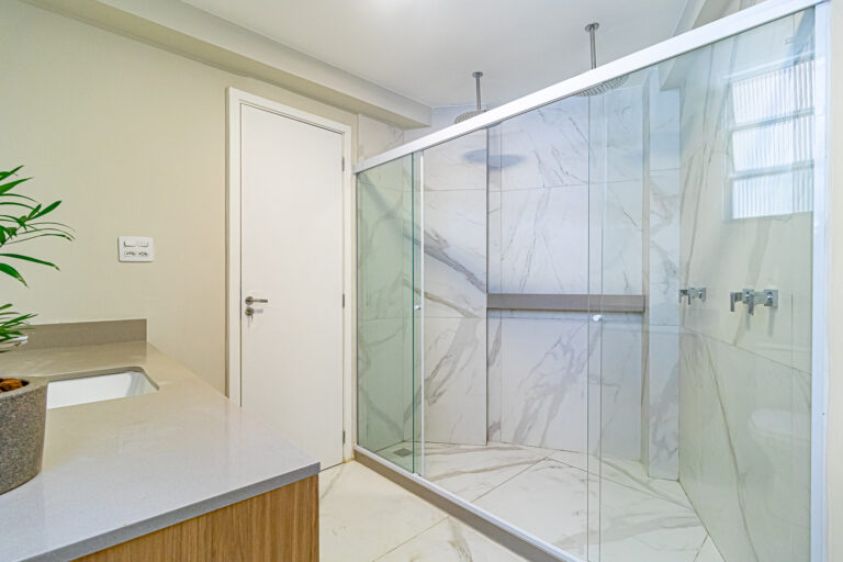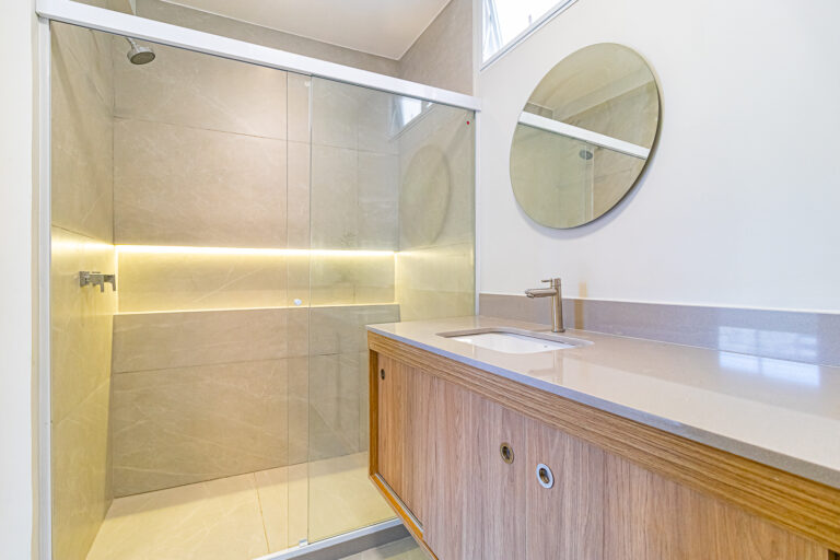 A área íntima conta com 3 quartos, sendo 1 suíte e mais 1 banheiro social. Os 2 banheiros são ventilados naturalmente e todos os cômodos têm a infraestrutura preparada para a instalação de aparelhos de ar-condicionado tipo split.