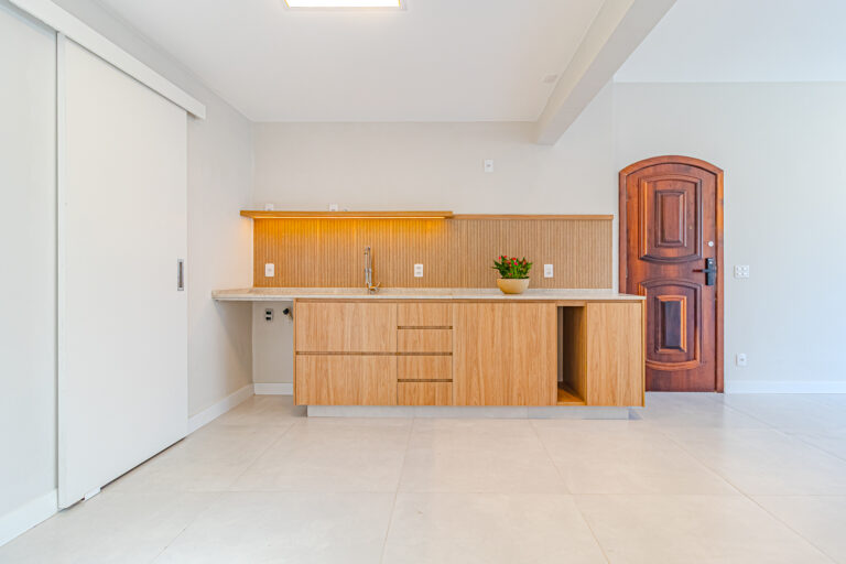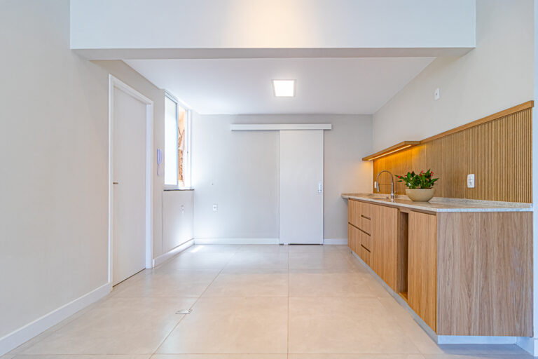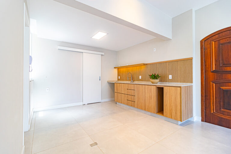 A sala e a cozinha formam um único e amplo ambiente, já que tanto a área de serviço quanto a despensa, ficam em ambientes separados, escondidas atrás das portas.