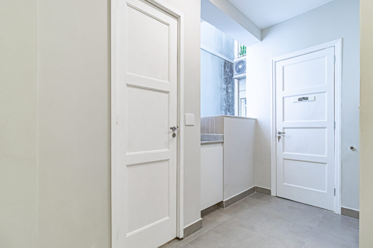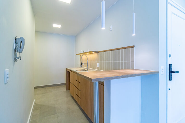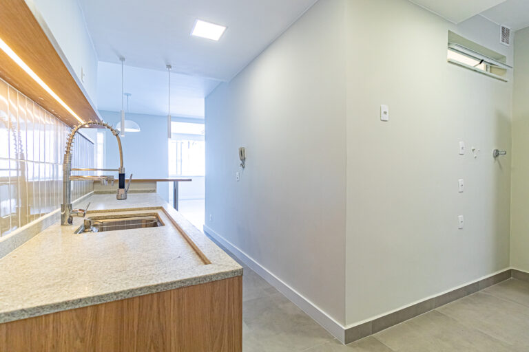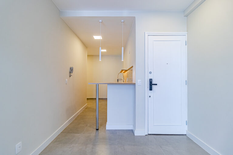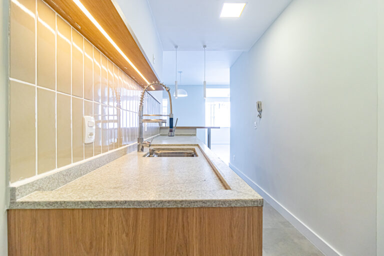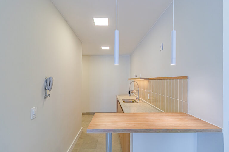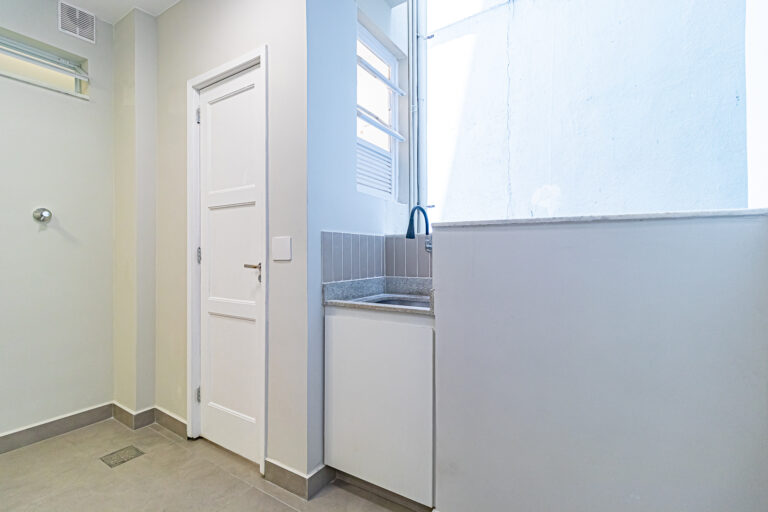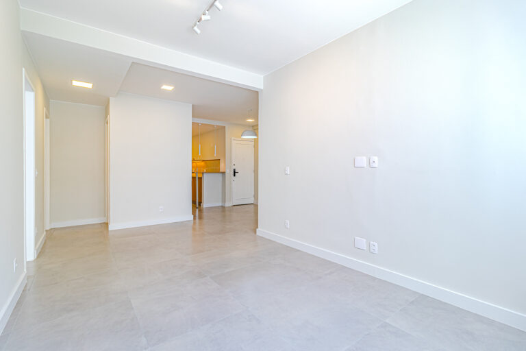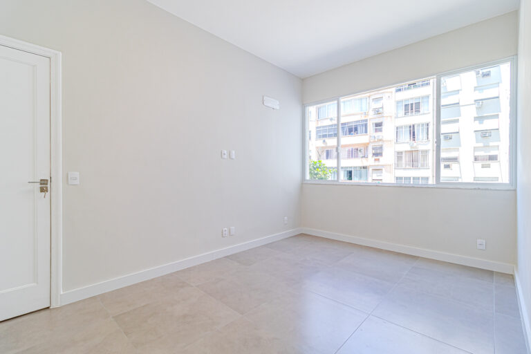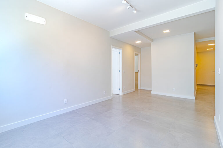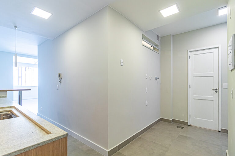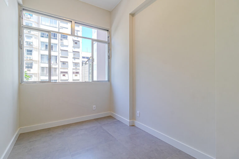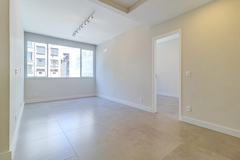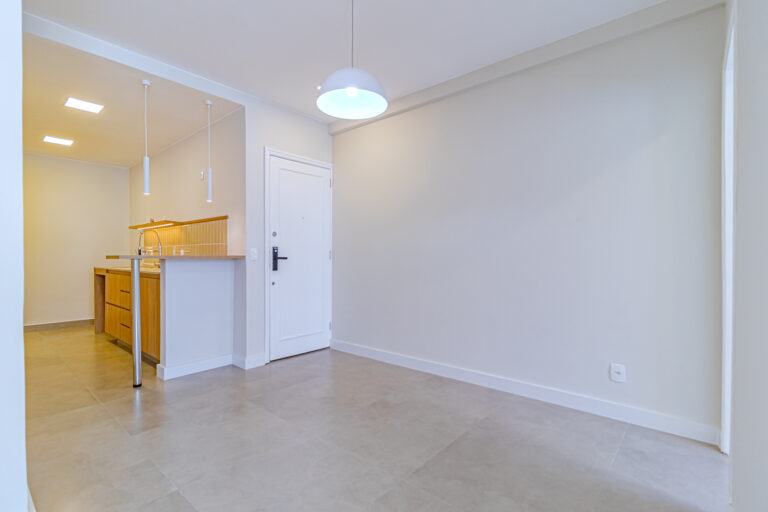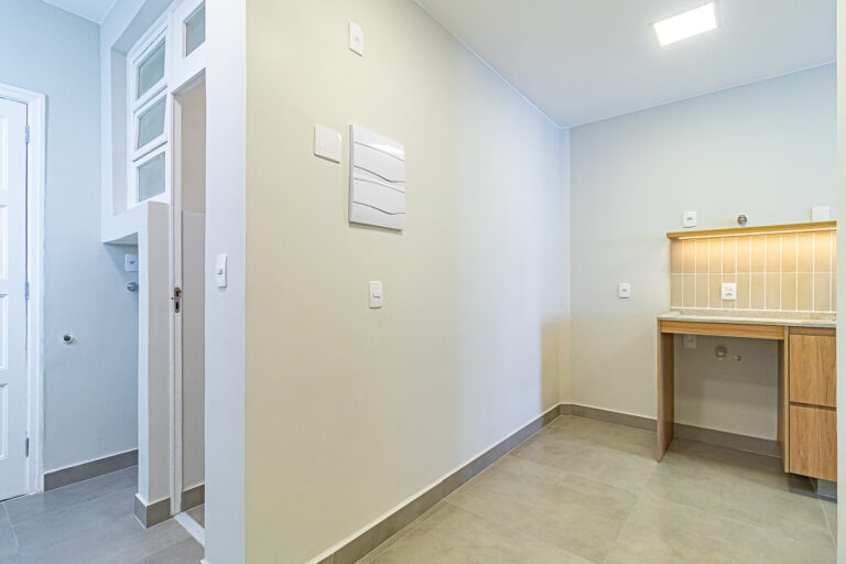 A sala é clara e bastante silenciosa, já que o apê é de fundos. Anexo a ela, há um quarto perfeito para ser usado como escritório, sala de TV ou para hóspedes.