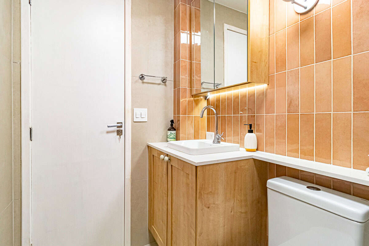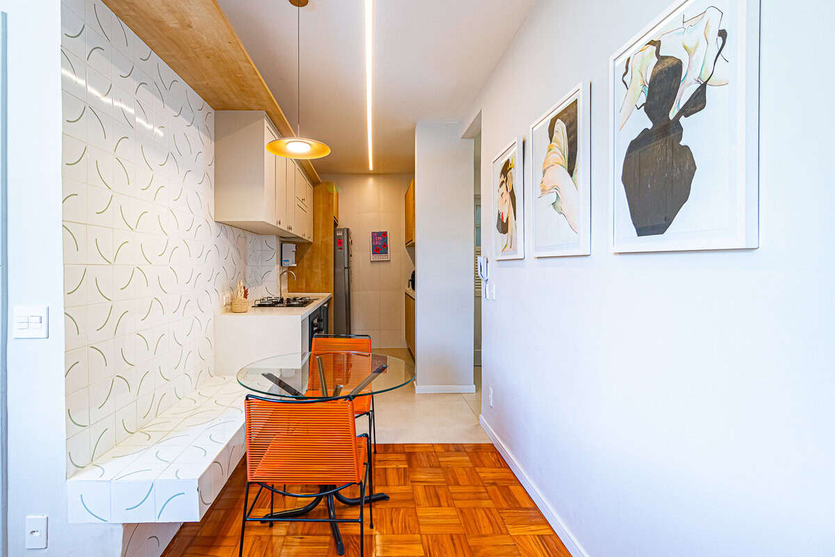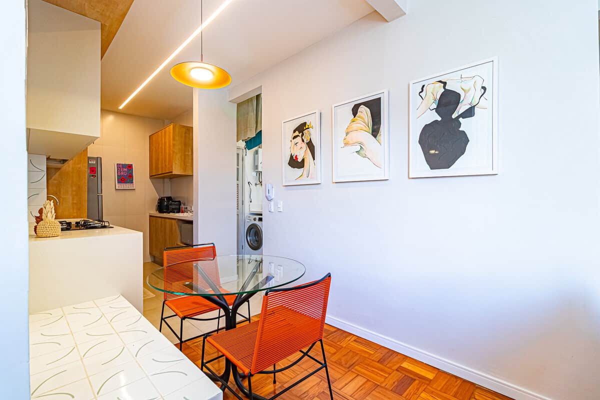 A sala e a cozinha, praticamente formam um único ambiente. Amplo, claro e aconchegante – iluminado pelo sol da manhã. Conta ainda com um lavabo de apoio.