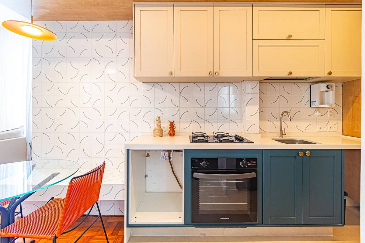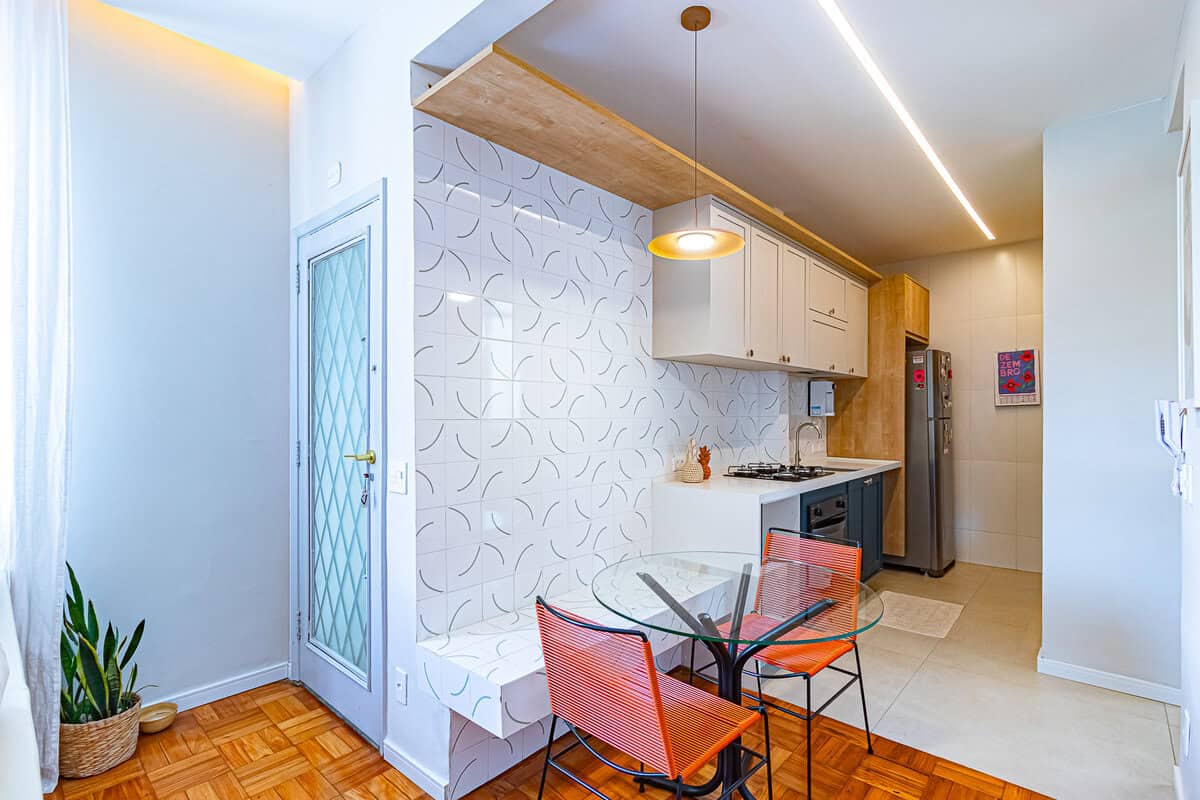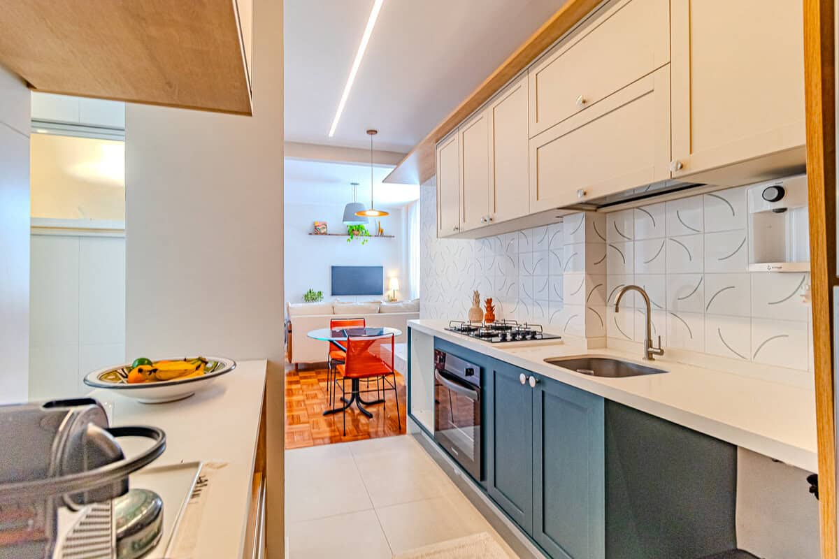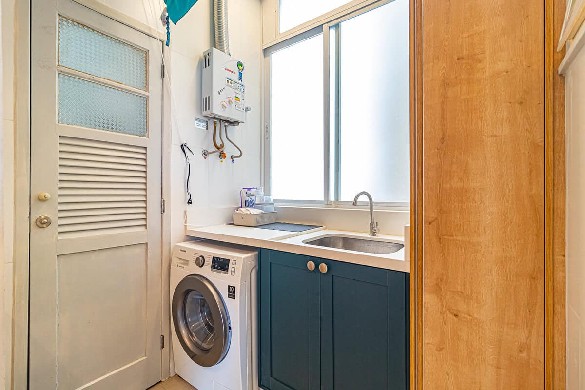 A cozinha é um charme. Tem uma bela marcenaria planejada e é muito arejada, pois fica entre as janelas da sala e área de serviço.