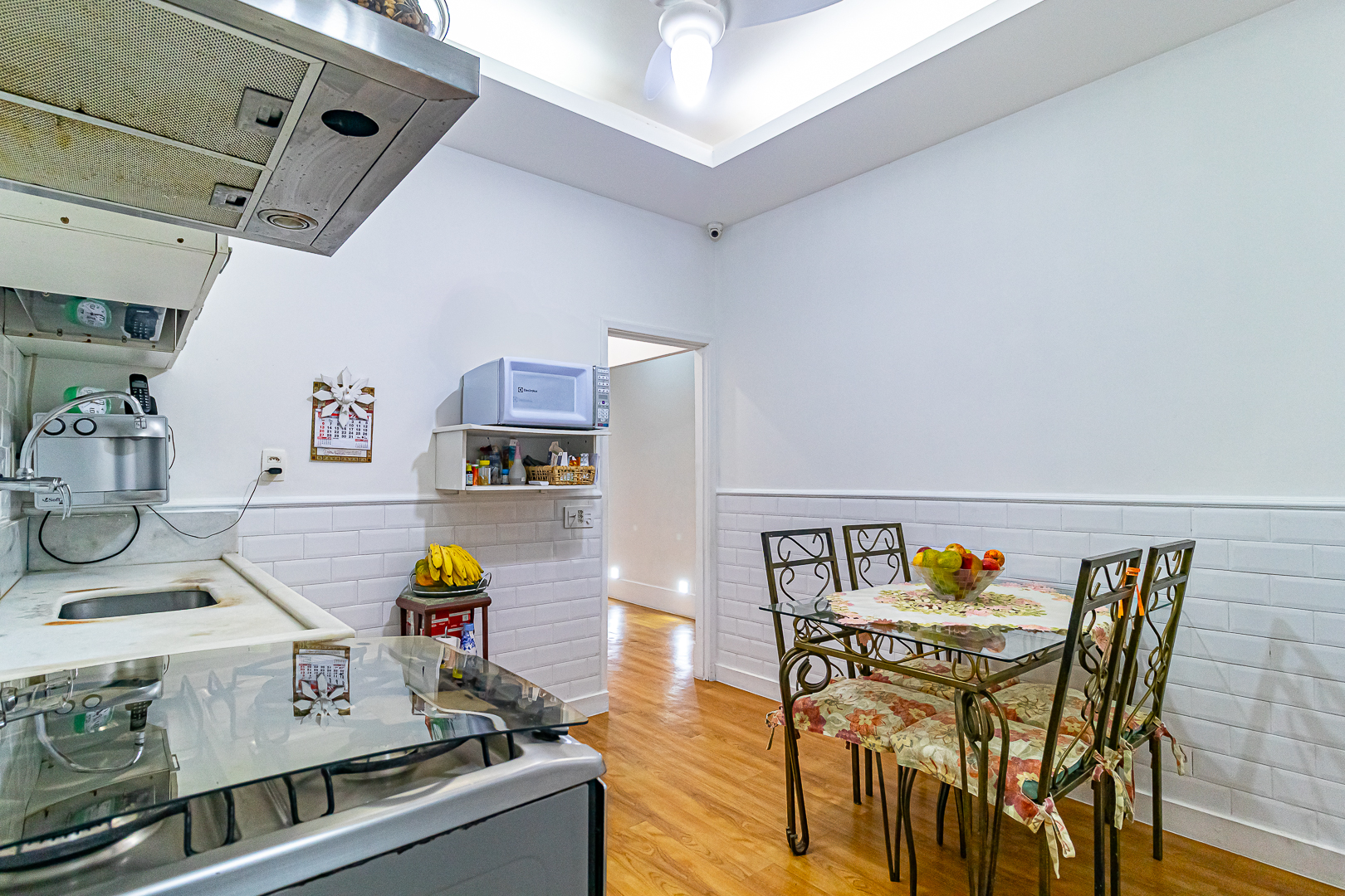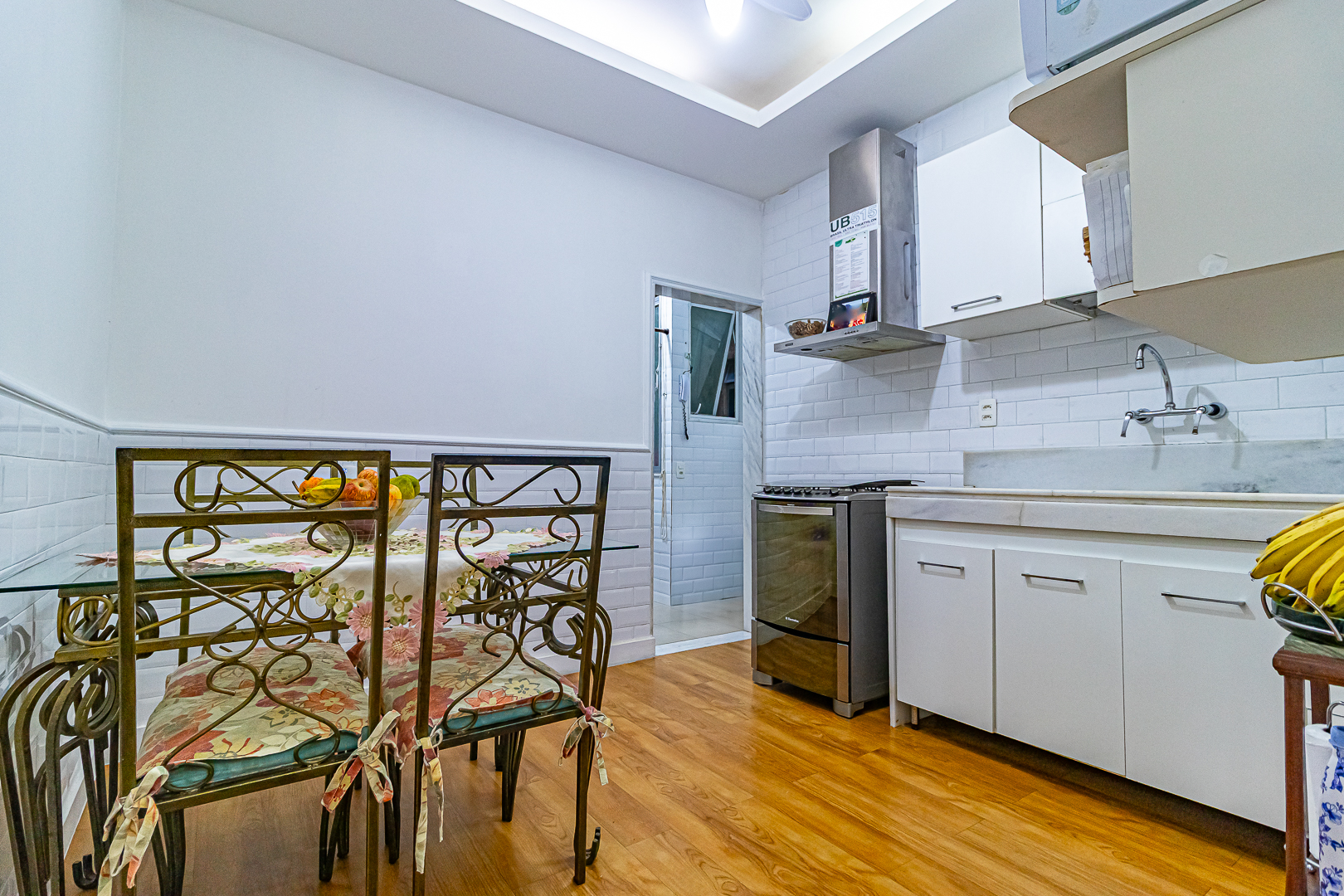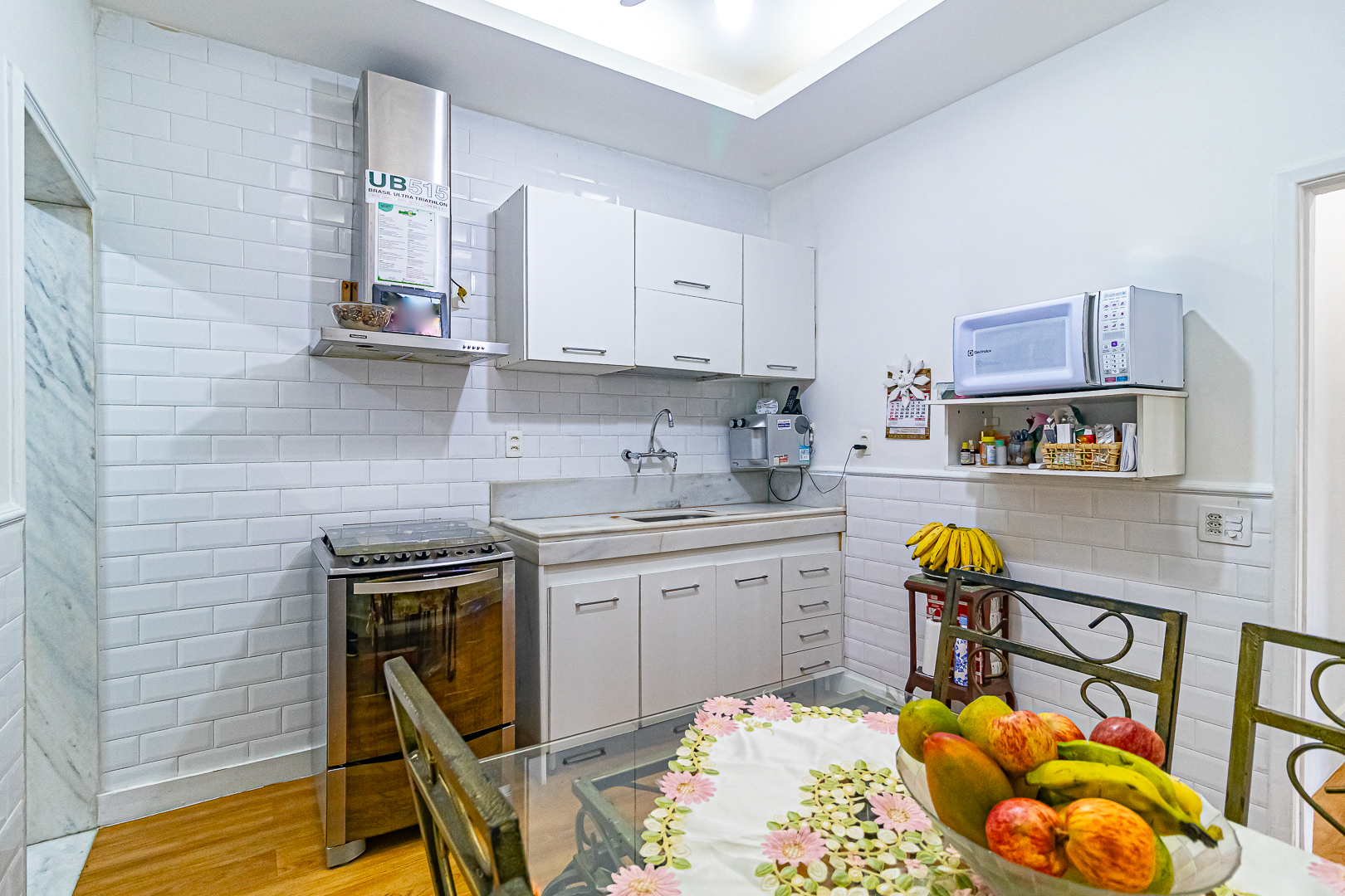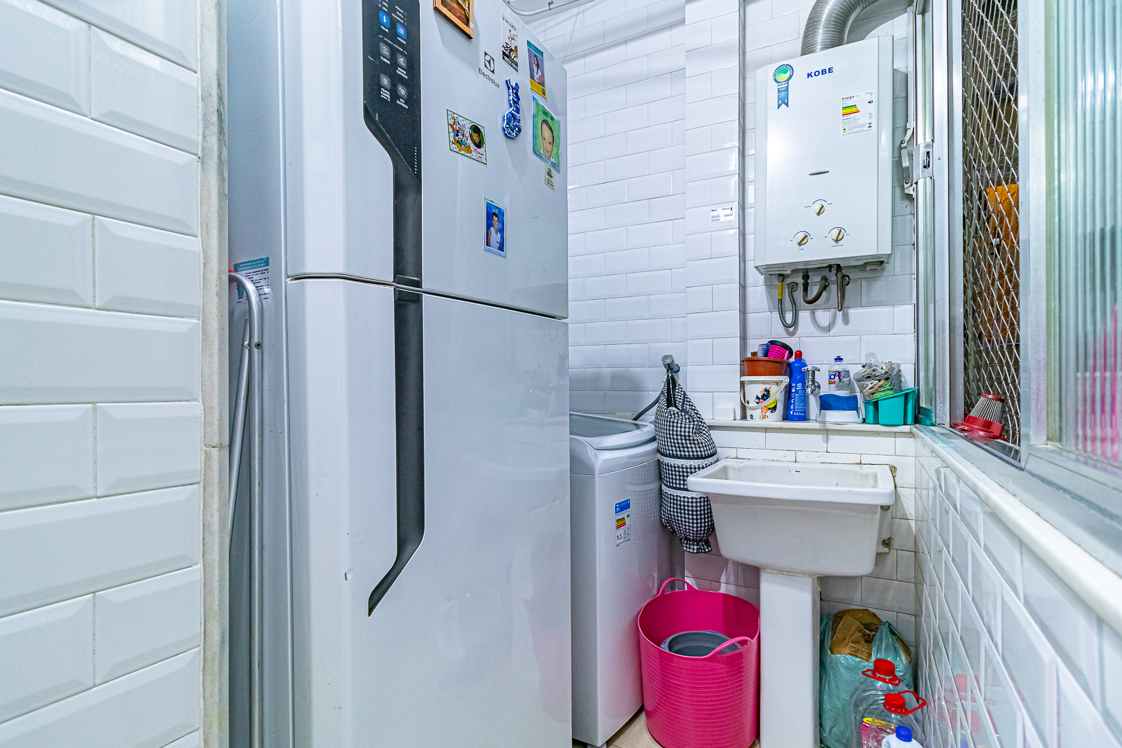 A cozinha até que é bastante espaçosa para um apartamento com esta metragem e conta ainda com área, dependência e WC de serviço.