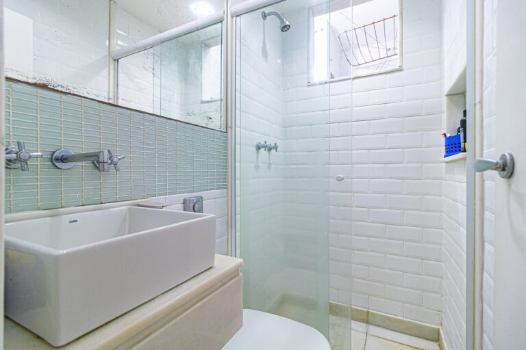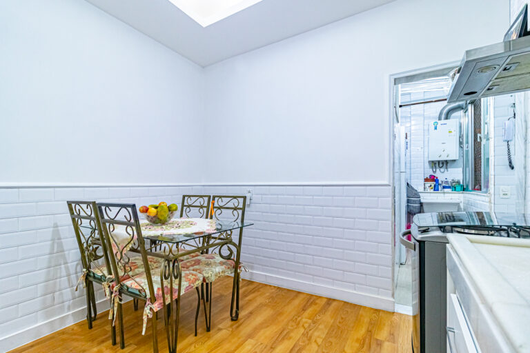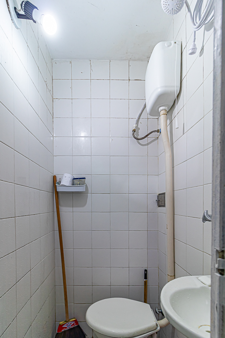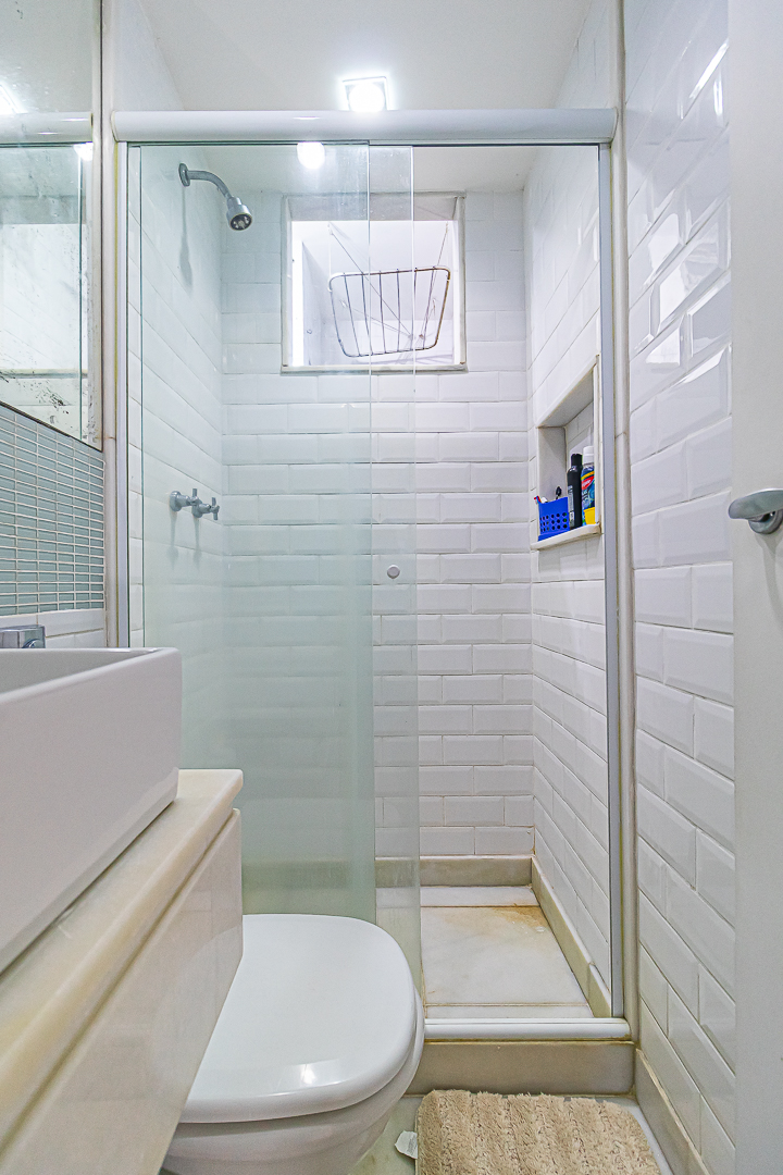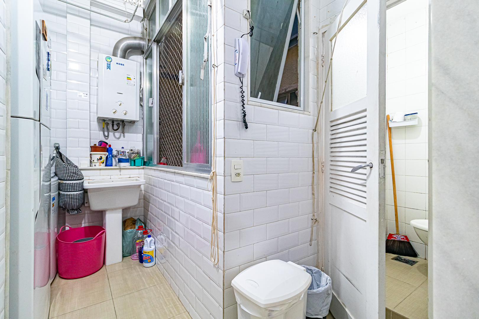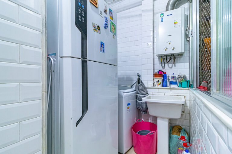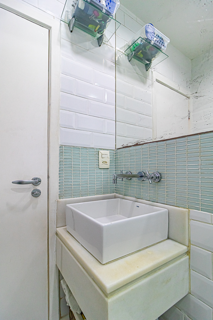 A cozinha até que é bastante espaçosa para um apartamento com esta metragem e conta ainda com área, dependência e WC de serviço.