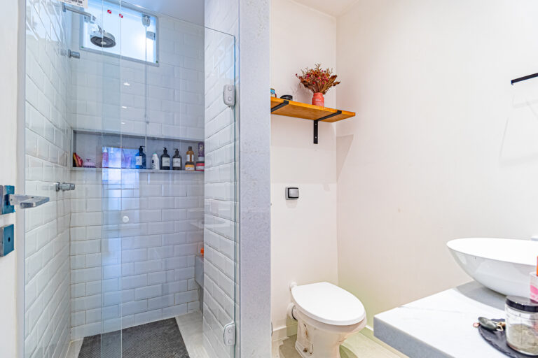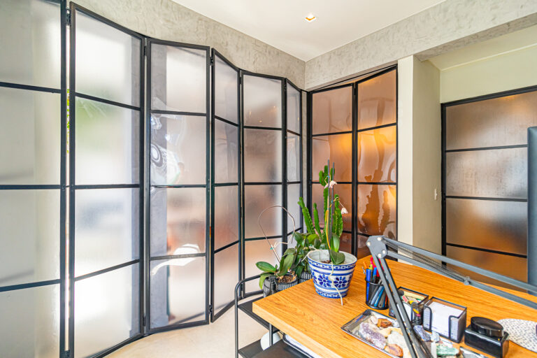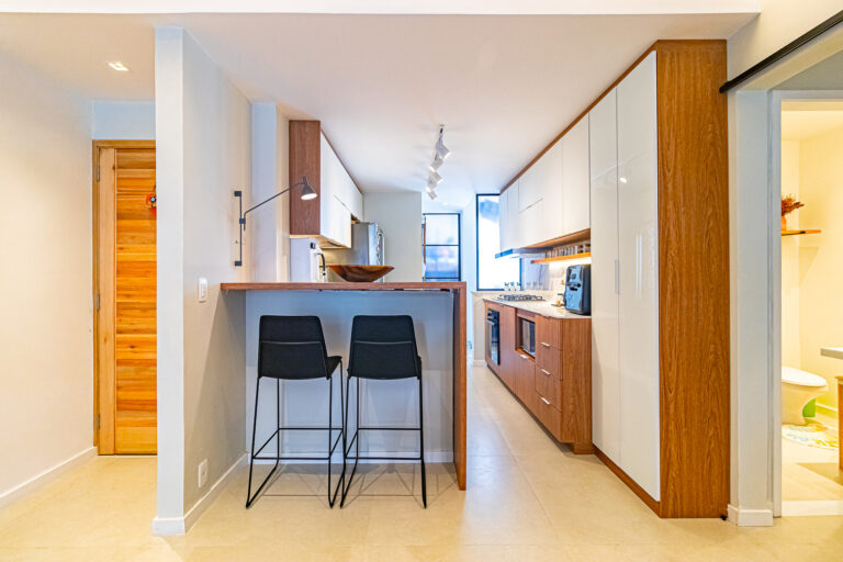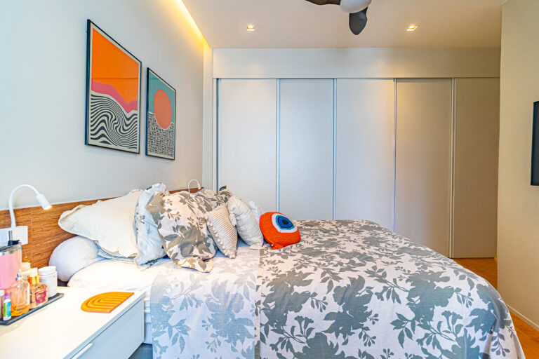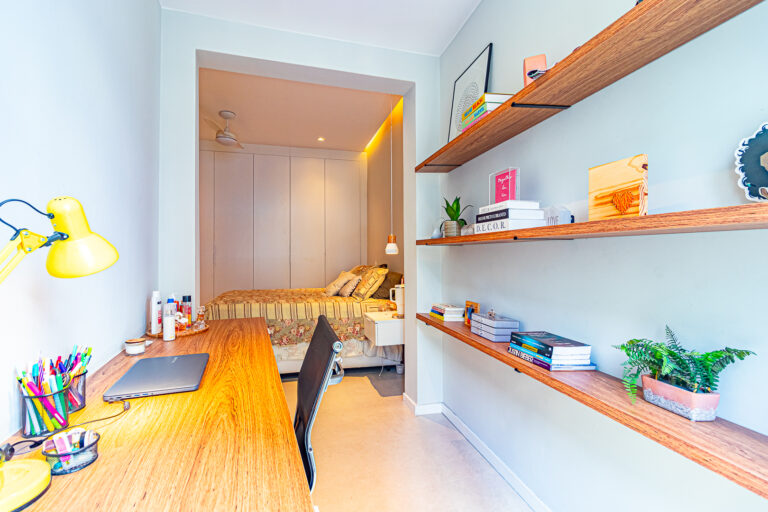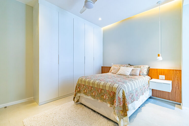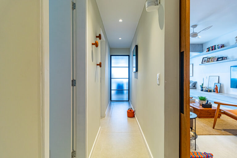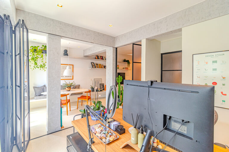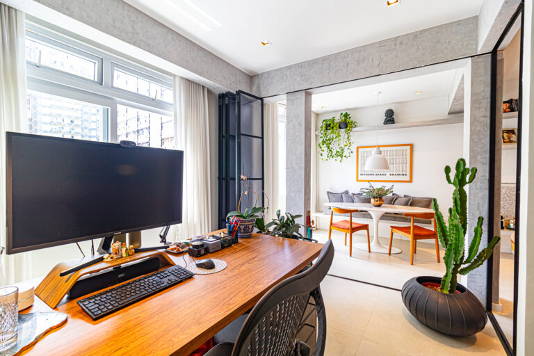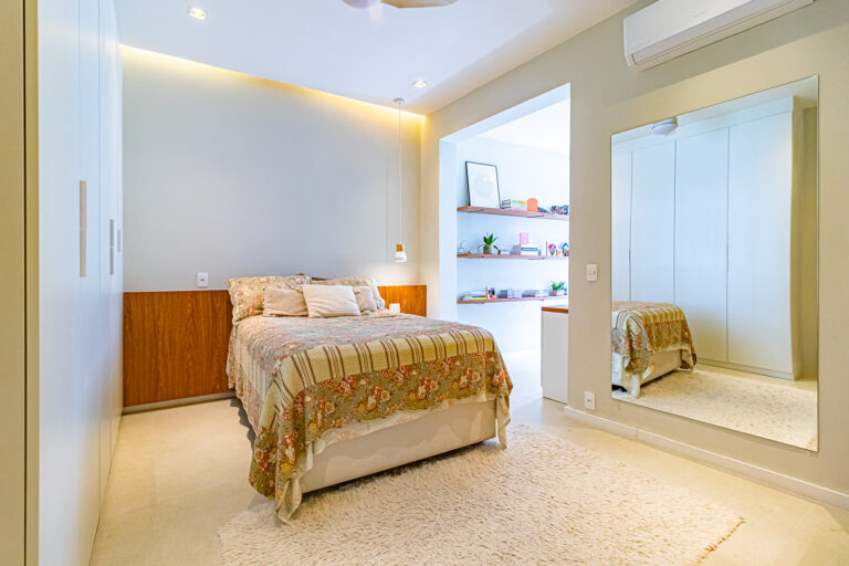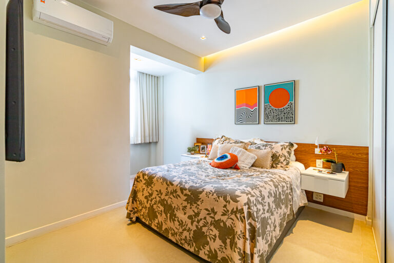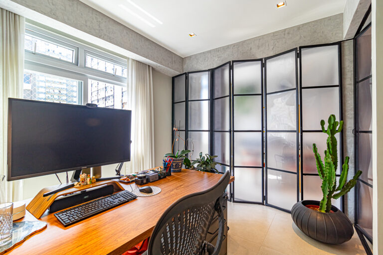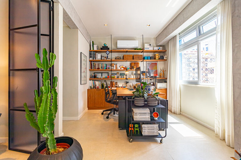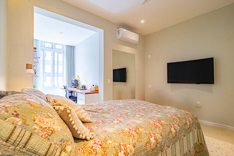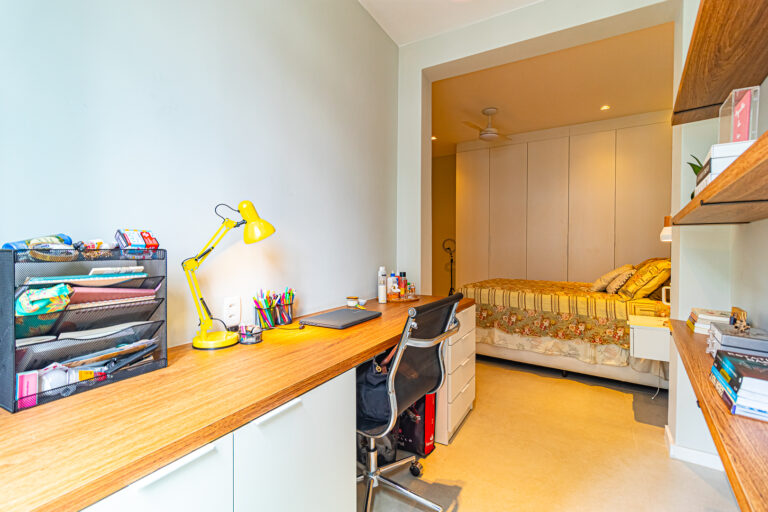 A área íntima conta com 2 quartos, sendo 1 suíte, já que o 3º quarto foi convertido em escritório. A suíte é espaçosa e tem um ótimo cantinho para trabalhar. Os 2 banheiros (suíte e social) são ventilados e todos os cômodos contam com marcenaria planejada e aparelhos de ar-condicionado tipo split.