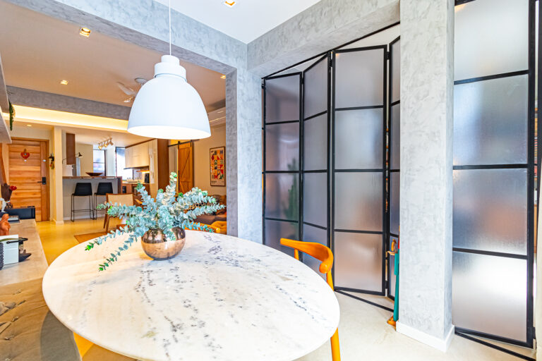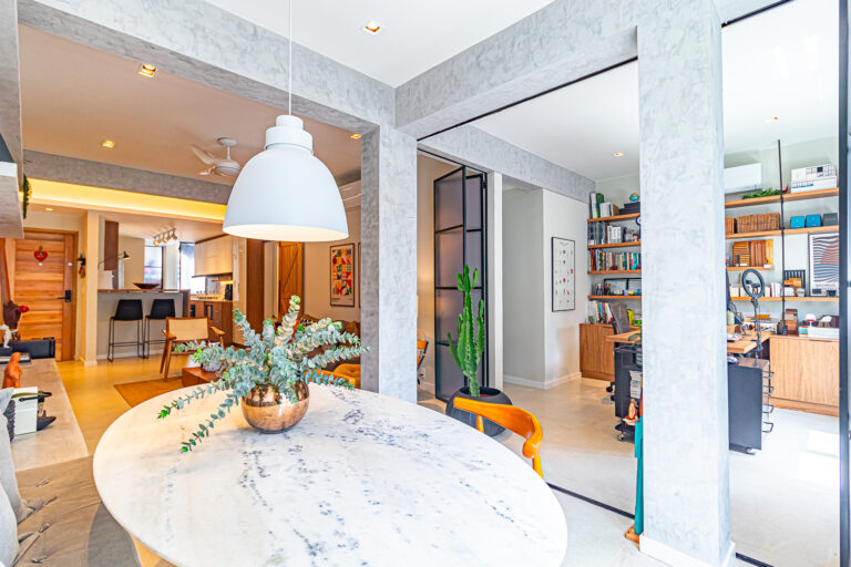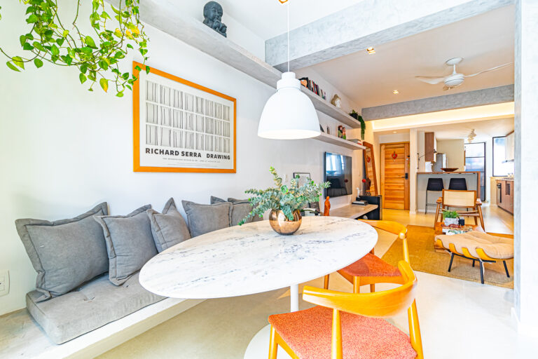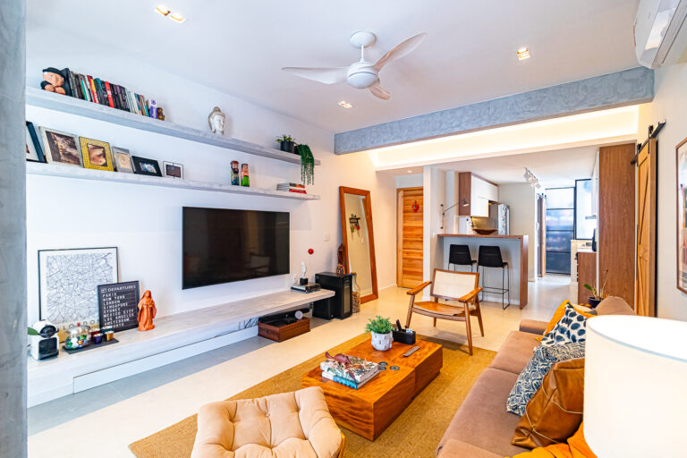 A sala é ampla e clara e a integração com a cozinha e o 3º quarto, deixou o ambiente incrível!