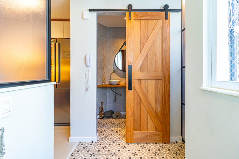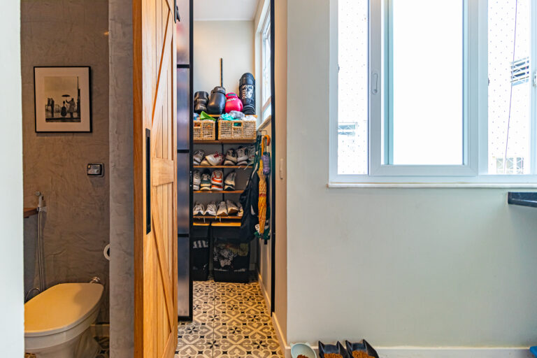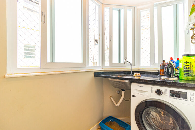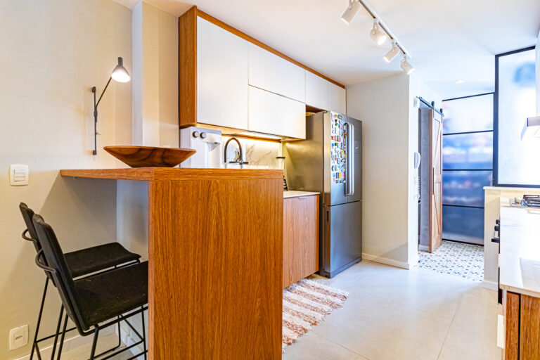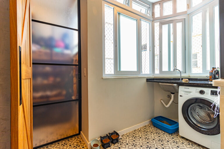 A cozinha é uma graça. Além de ser super charmosa, tem área de serviço e despensa separadas e o WC foi transformado em um lavabo.