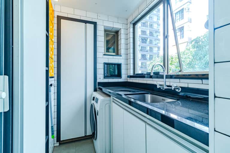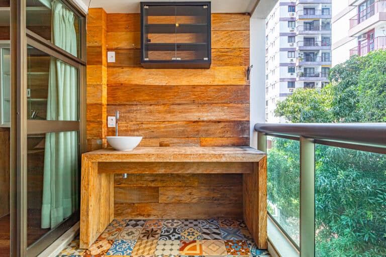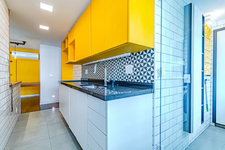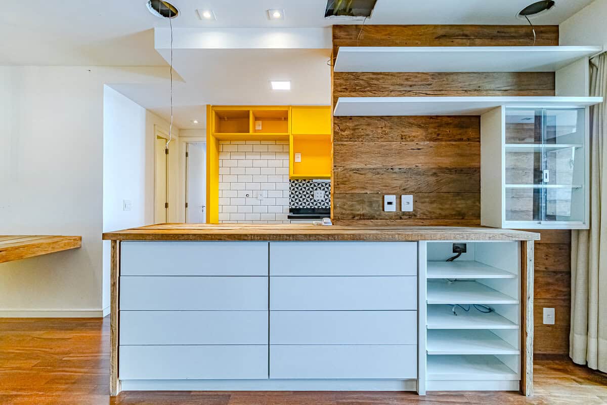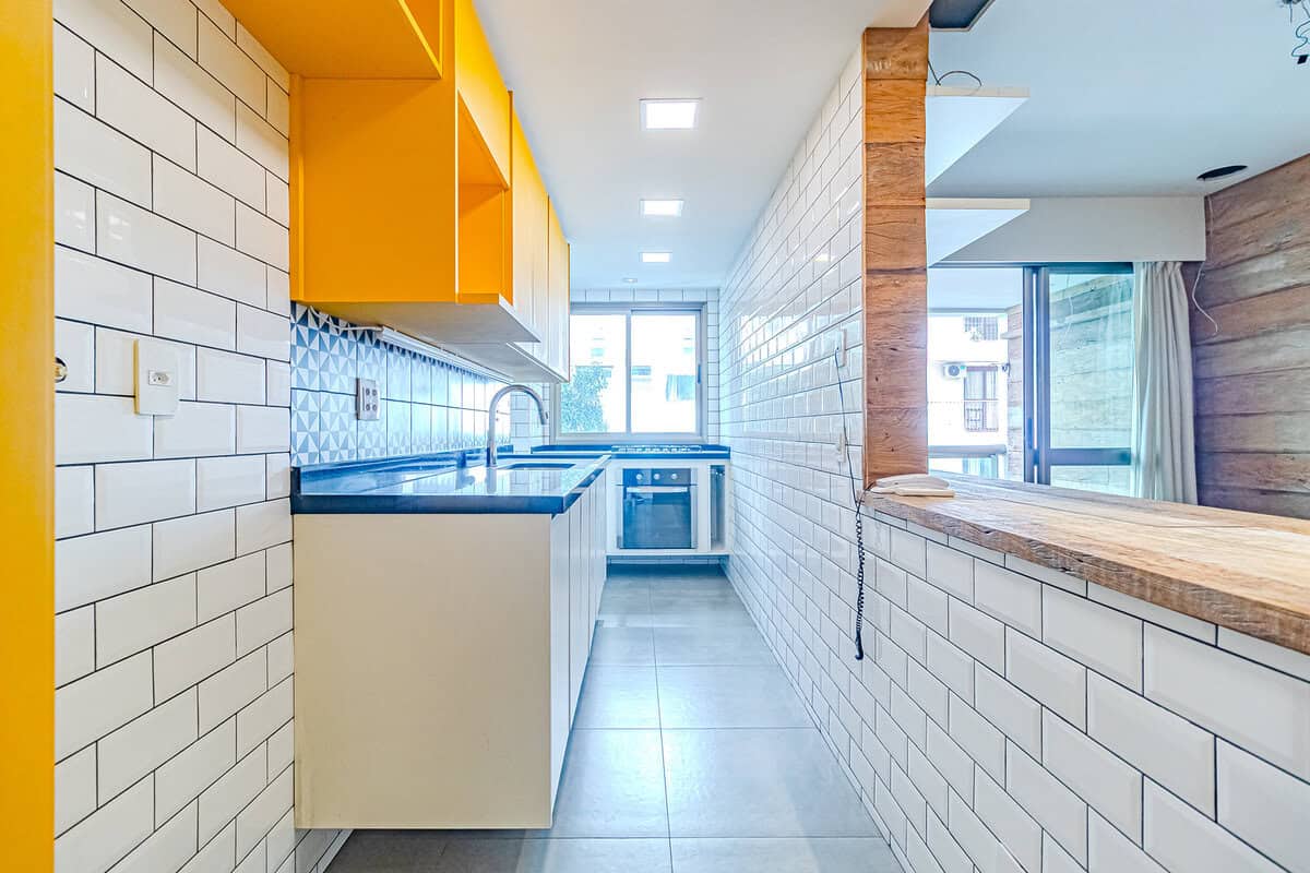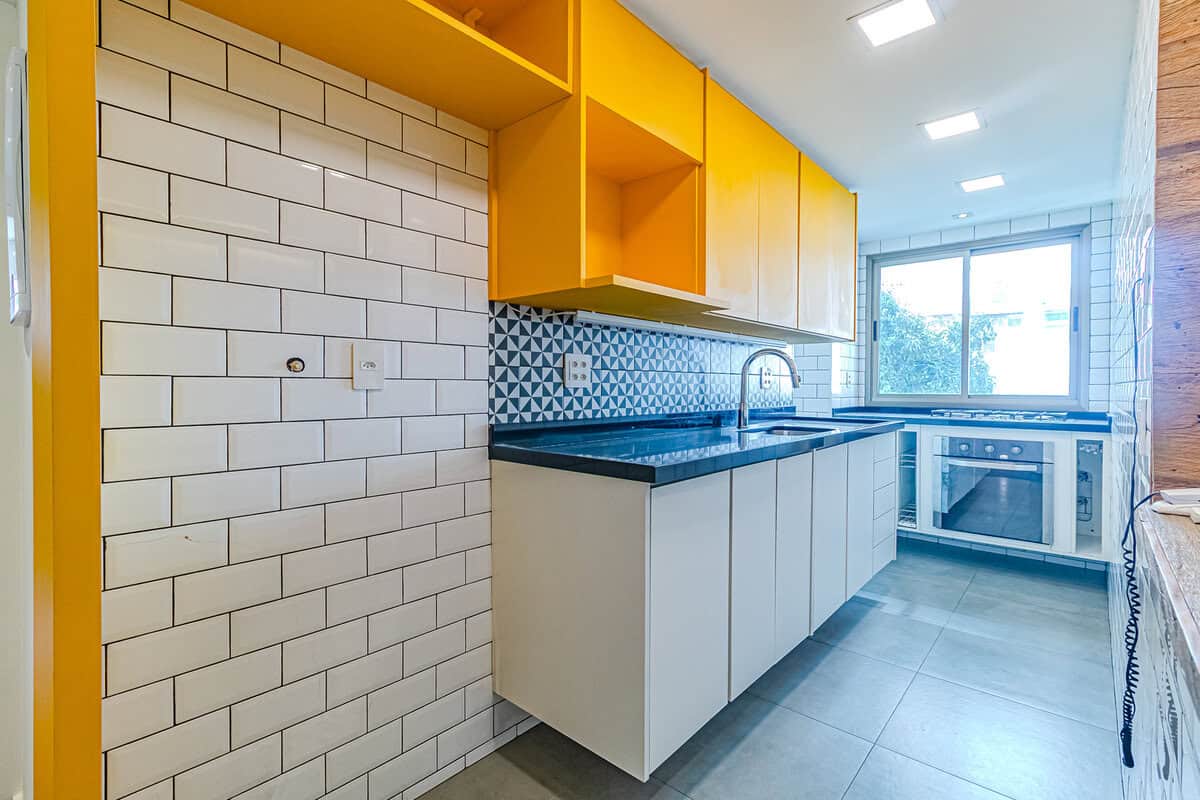 A cozinha também é linda! Como é aberta para a sala, traz maior amplidão ao ambiente. Um detalhe que me chamou bastante atenção, foi o fogão embaixo da janela, onde você pode cozinhar vendo as árvores da frente. Conta ainda com área de serviço separada.