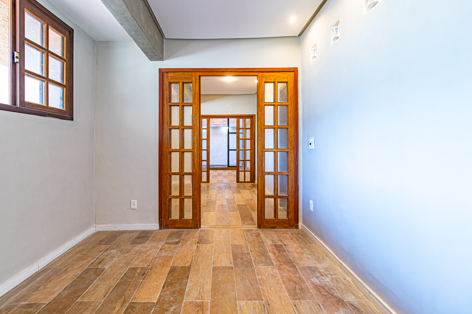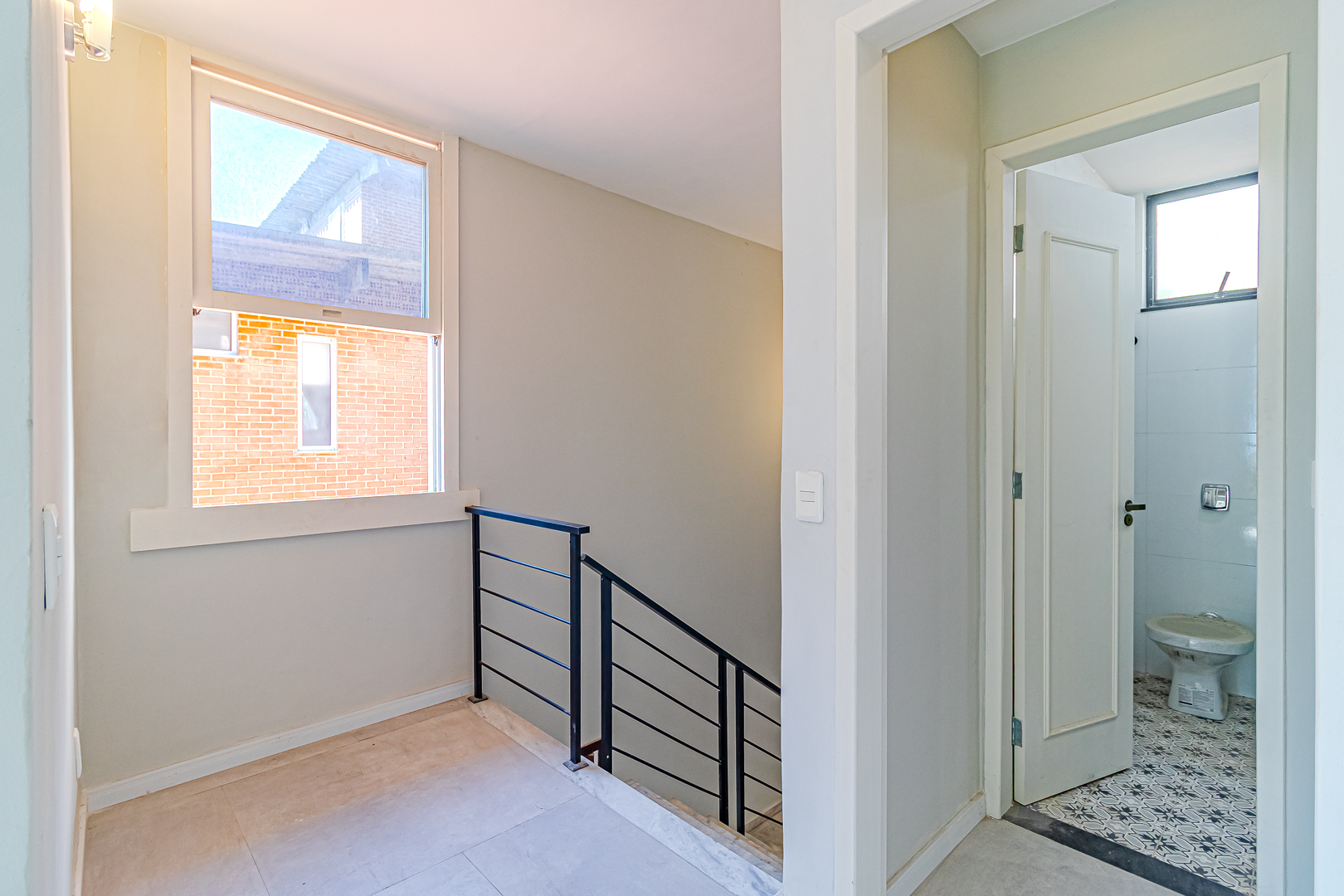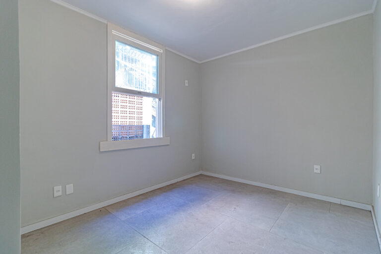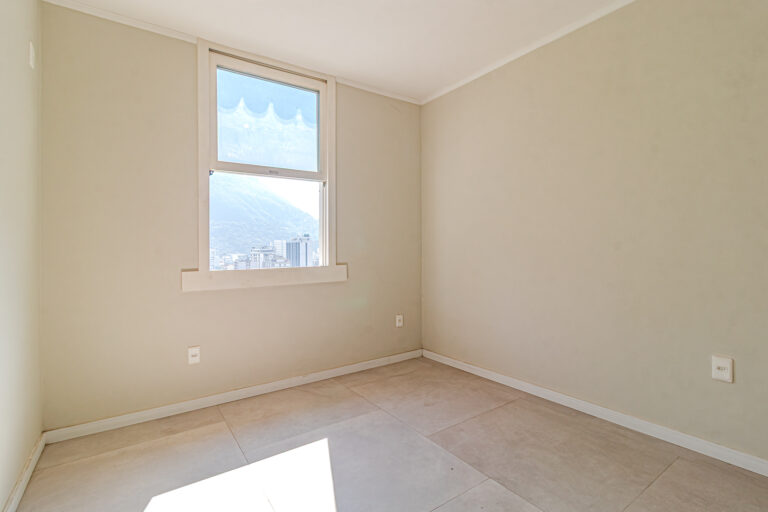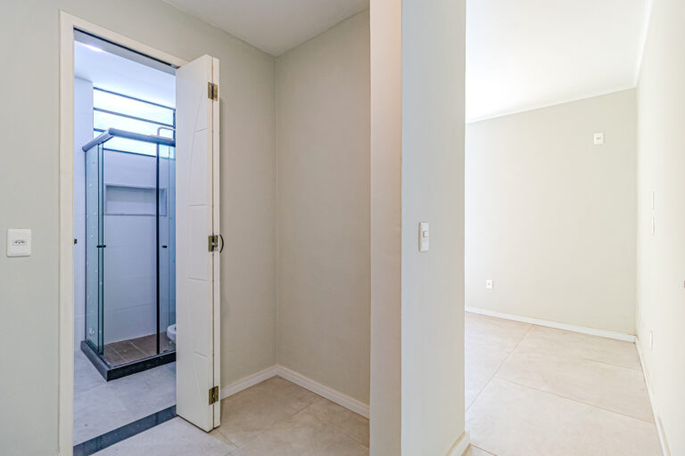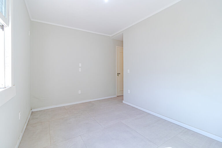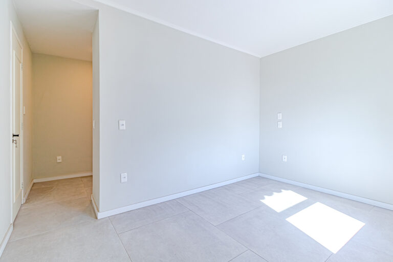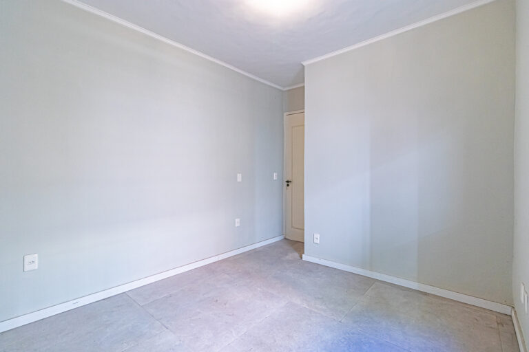 No andar de cima ficam 3 quartos, sendo 1 suíte. Dois deles são de frente, com a mesma vista da sala. Na suíte foi projetado um espaço para montar um closet.