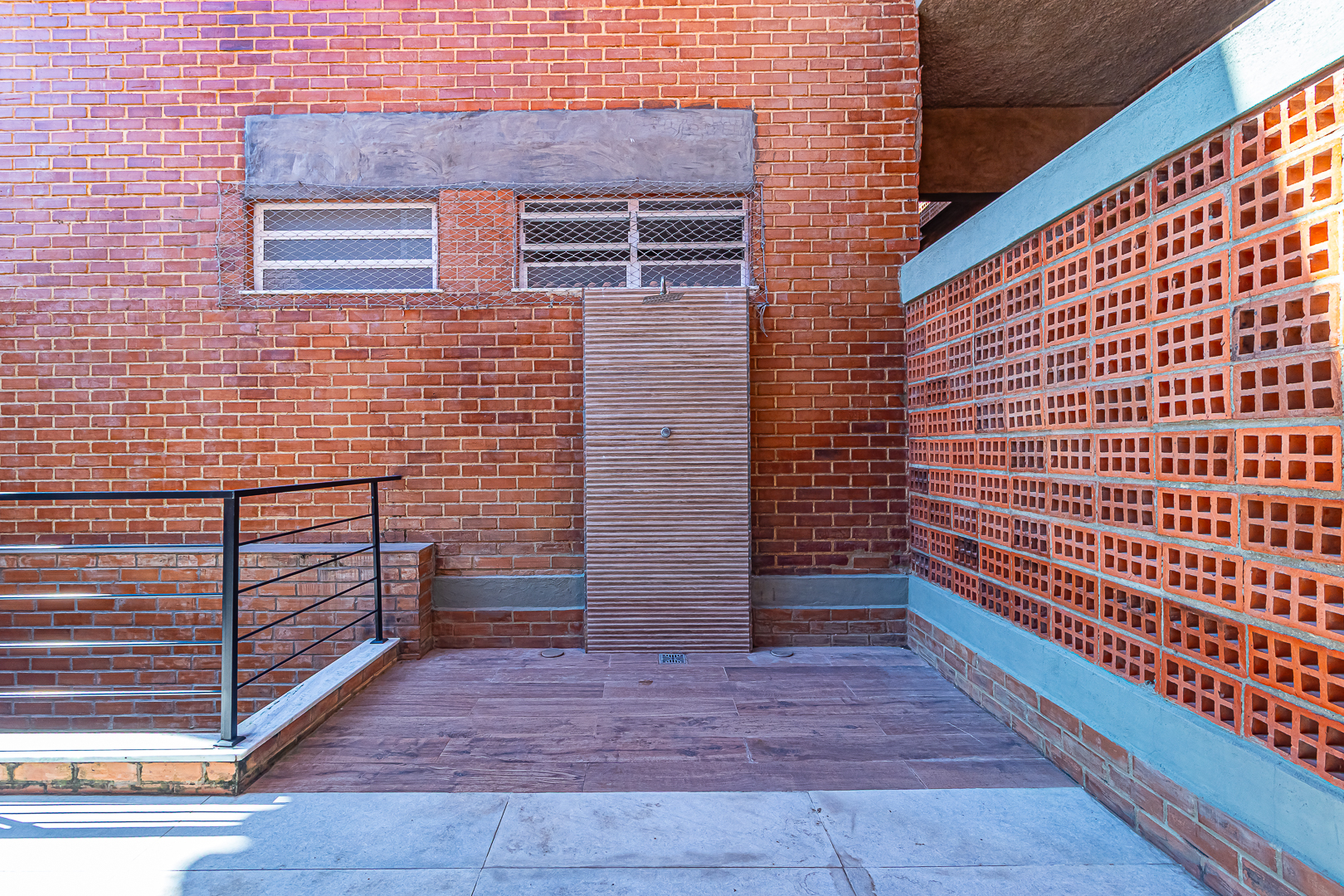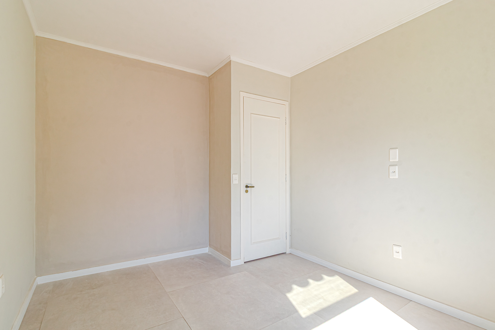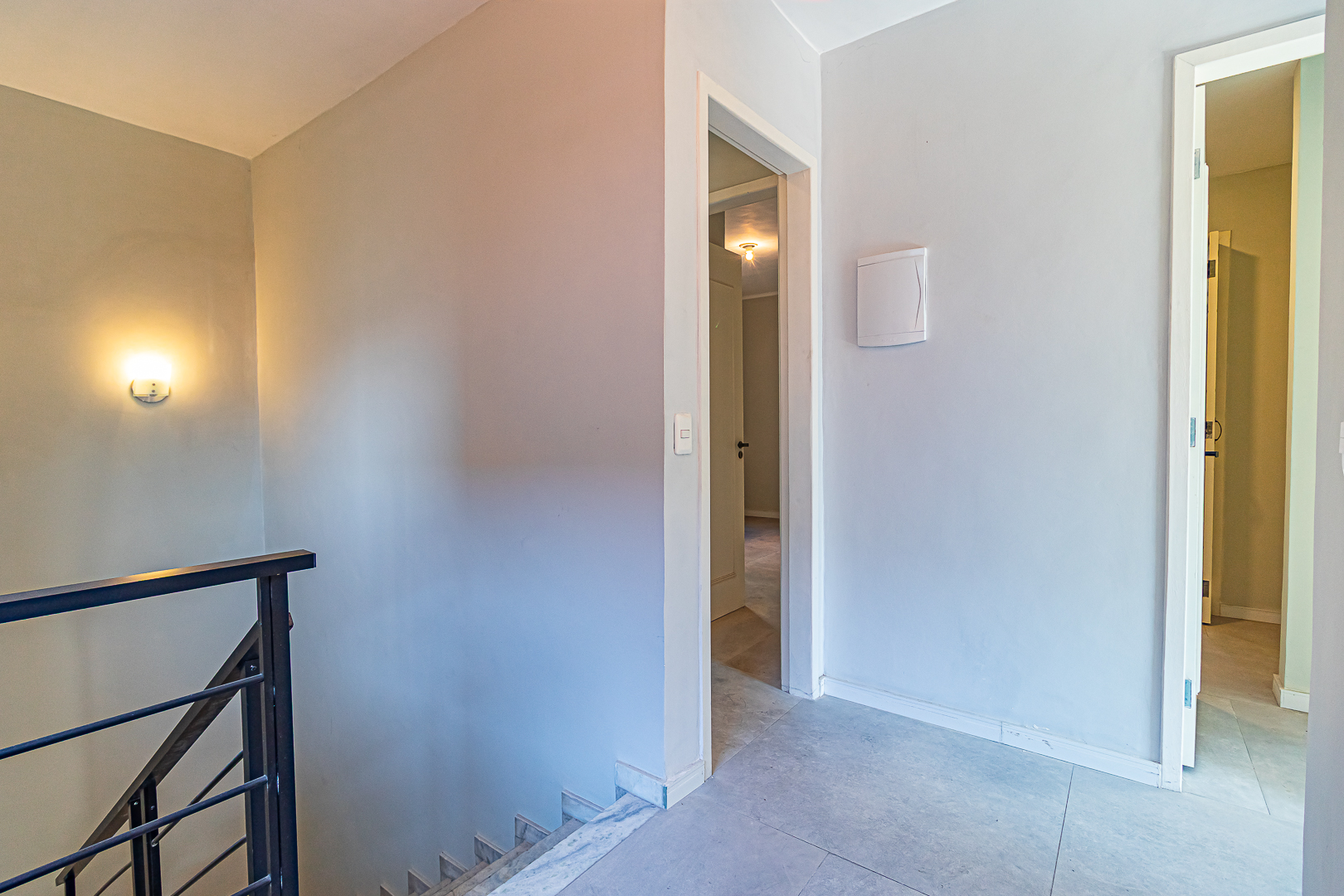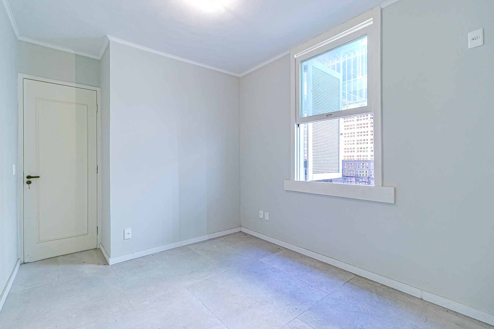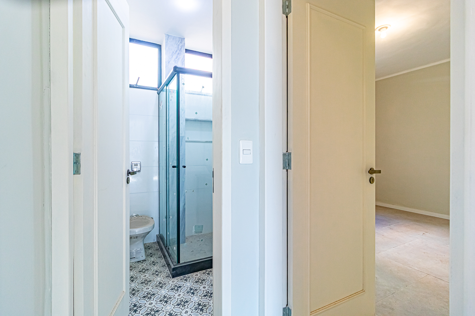 No andar de cima ficam 3 quartos, sendo 1 suíte. Dois deles são de frente, com a mesma vista da sala. Na suíte foi projetado um espaço para montar um closet.