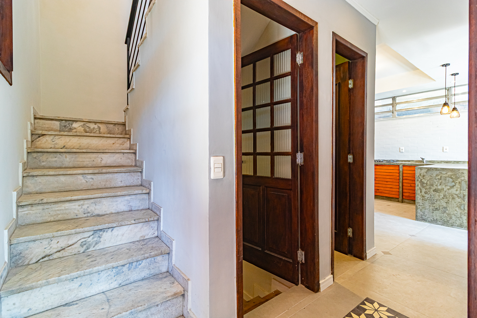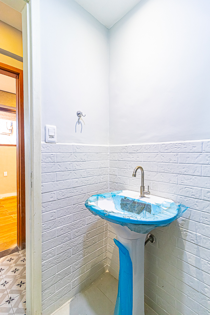 A casa tem 3 pavimentos e é acessada pelo do meio, onde ficam a sala, quintal, cozinha e um lavabo.