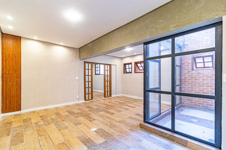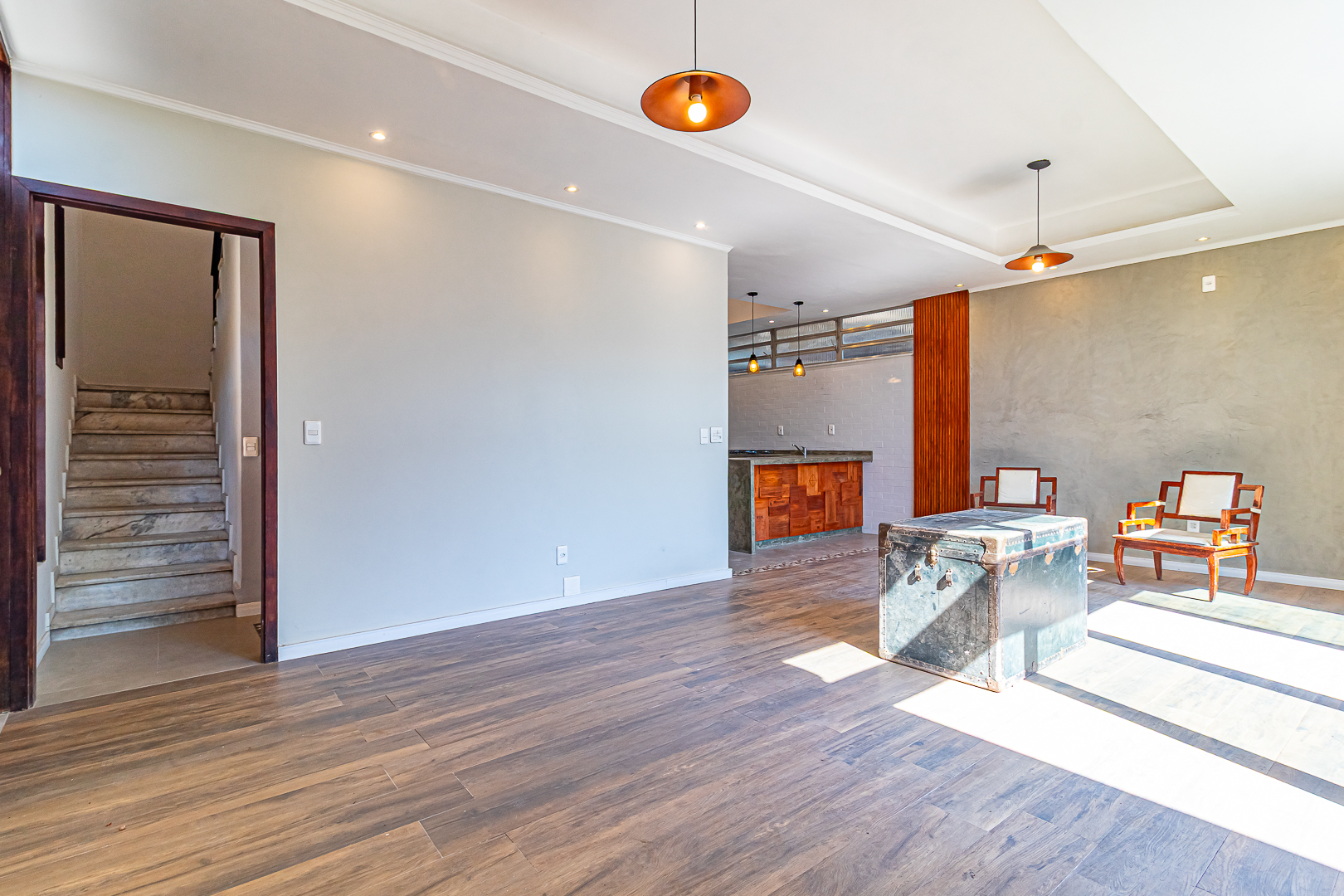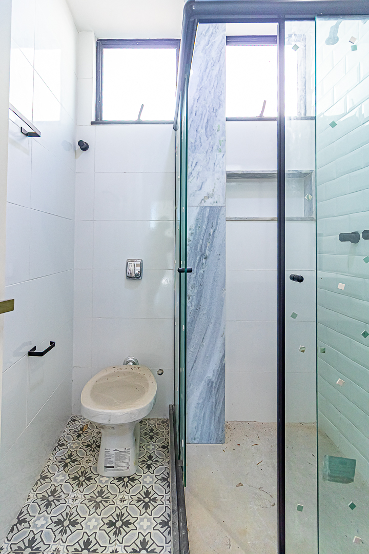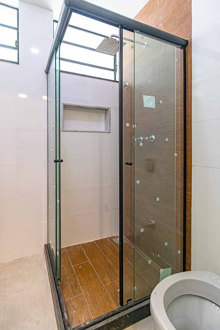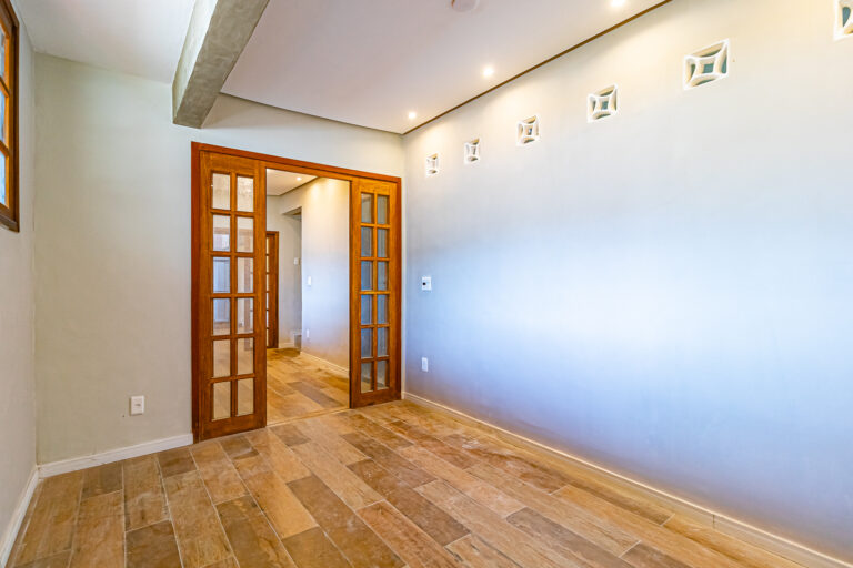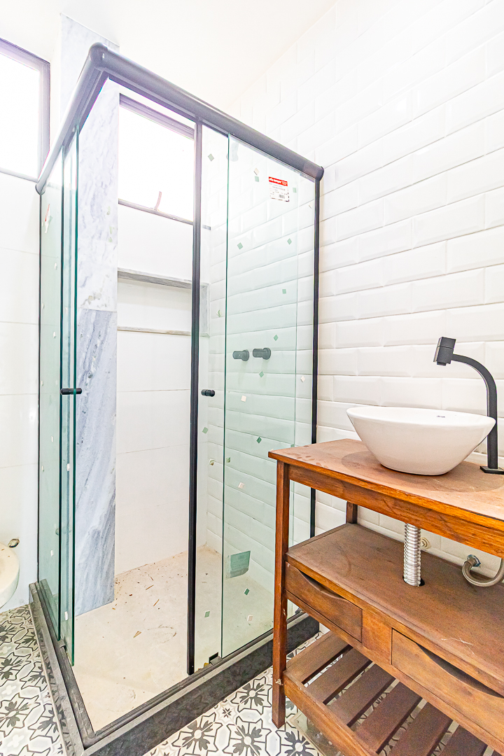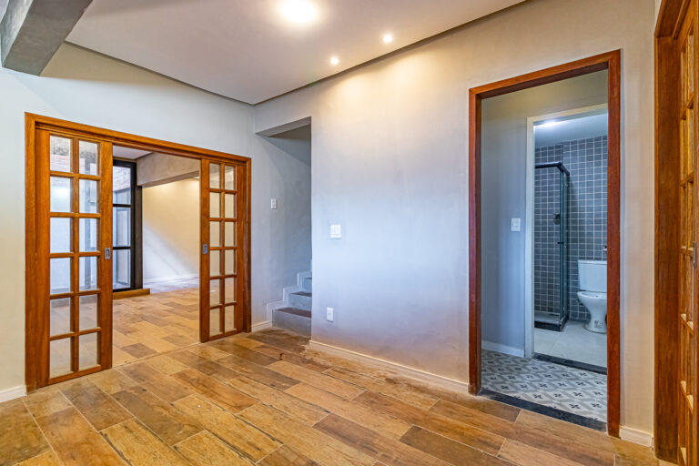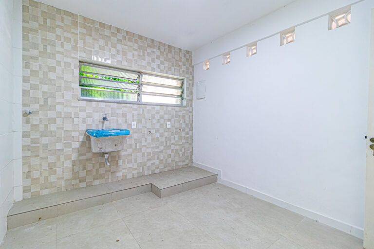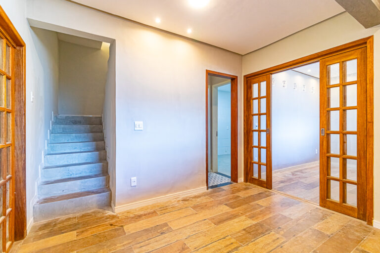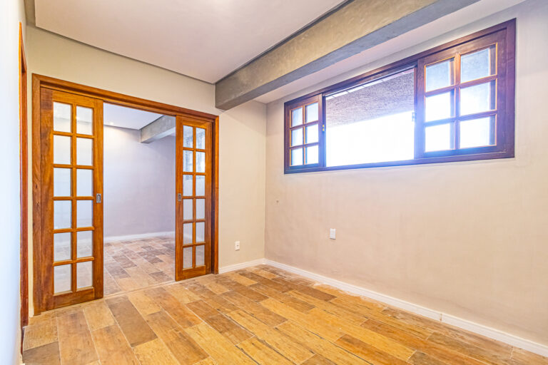 Já no piso de baixo, há um enorme salão com jardim de inverno, um quarto que pode ser usado como escritório ou quarto de hóspedes. Neste pavimento ficam também uma ampla área de serviço e outro banheiro completo.