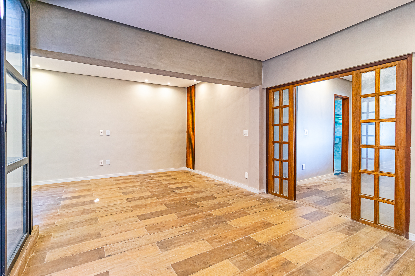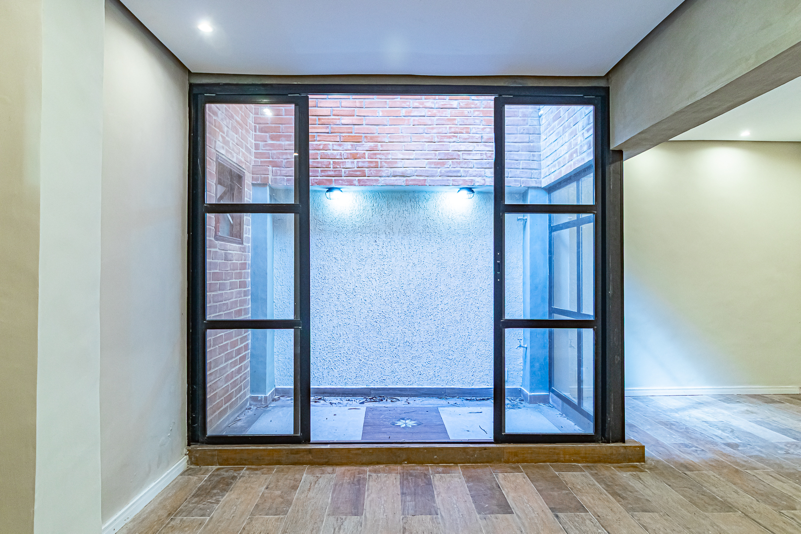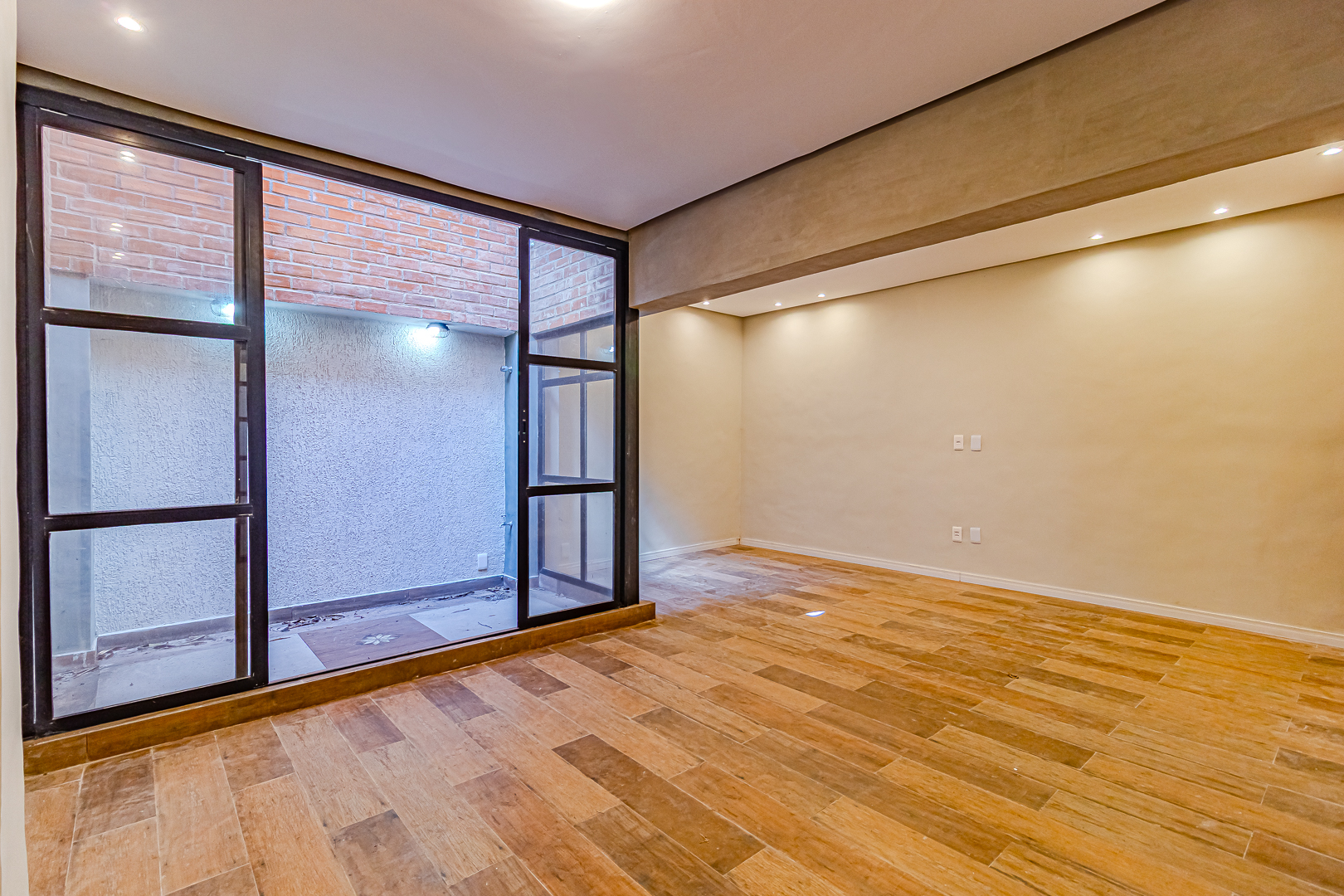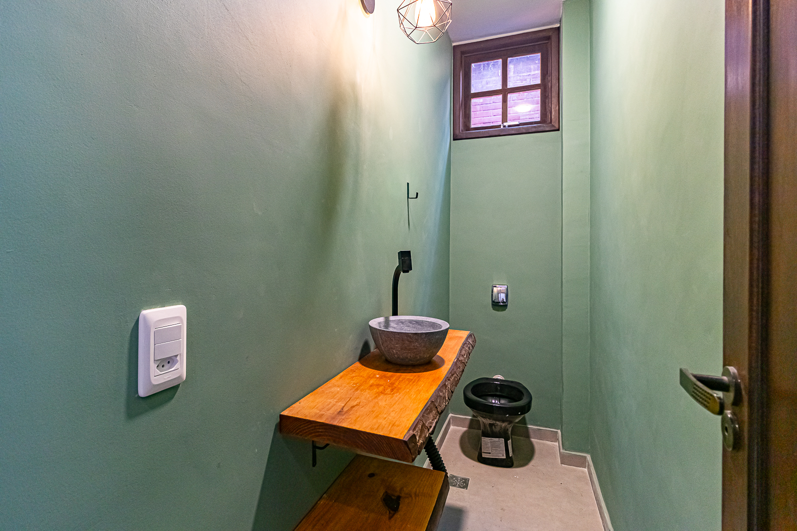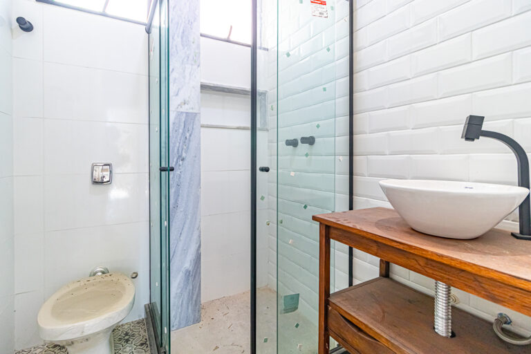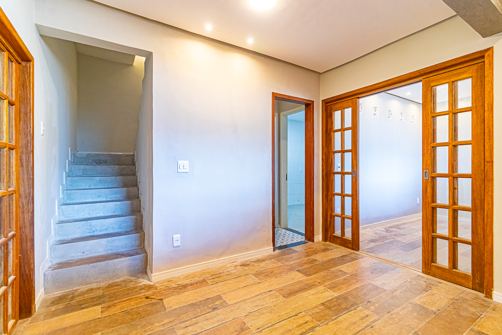 Já no piso de baixo, há um enorme salão com jardim de inverno, um quarto que pode ser usado como escritório ou quarto de hóspedes. Neste pavimento ficam também uma ampla área de serviço e outro banheiro completo.