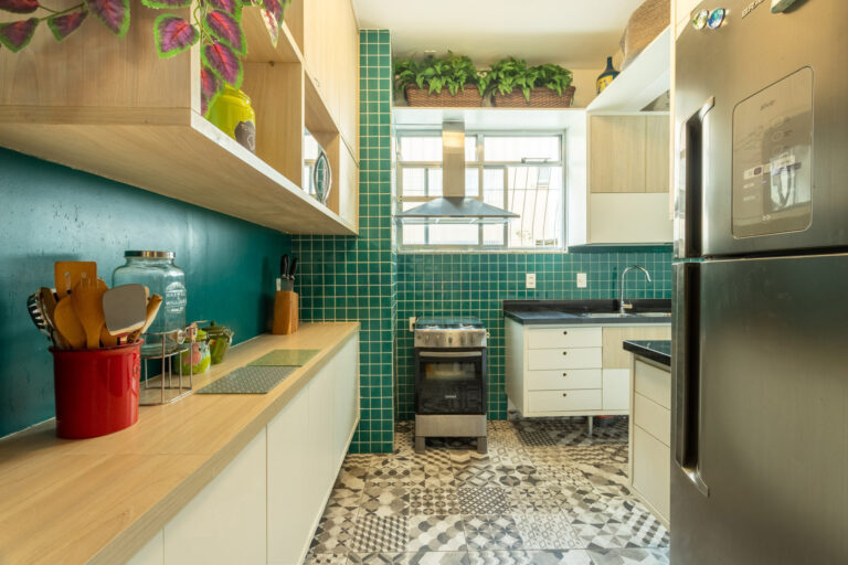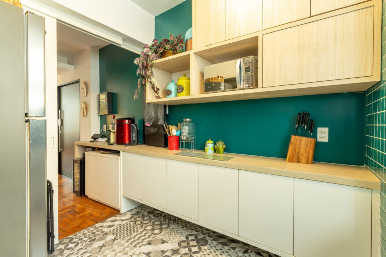 A cozinha é bastante iluminada e repleta de armários. Conta ainda com uma pequena área de serviço.