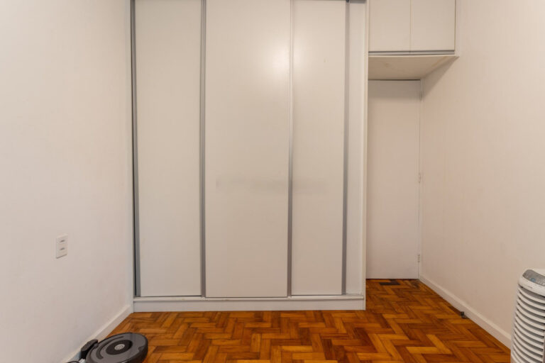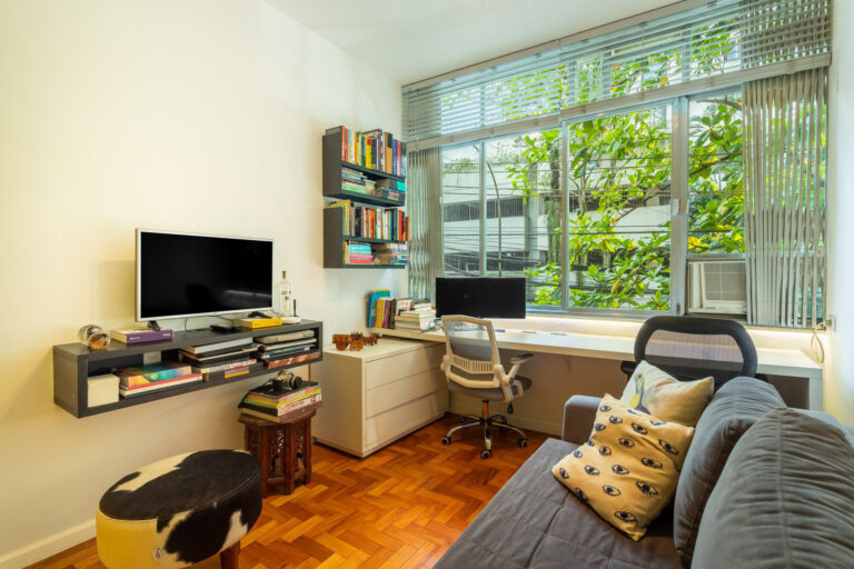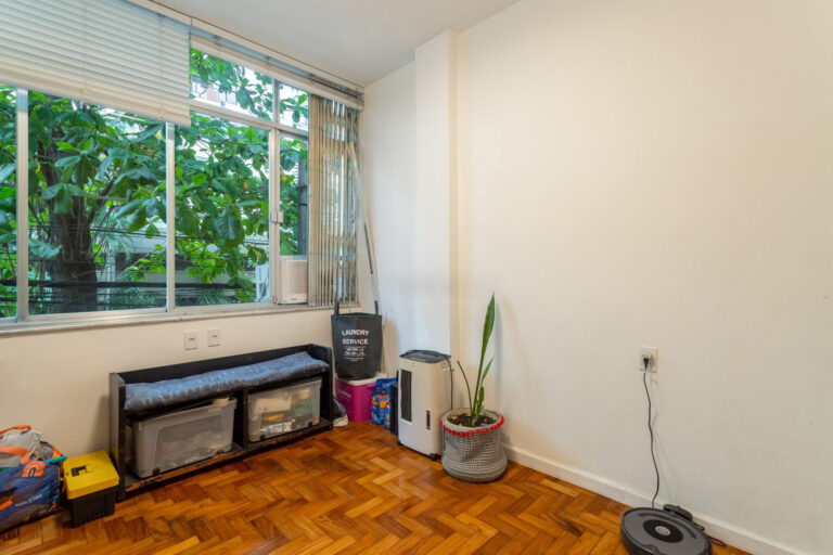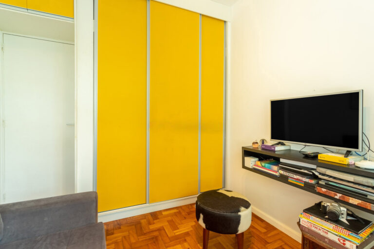 A área íntima tem 3 quartos, sendo 1 suíte e mais 1 banheiro social. Todos os quartos contam com marcenaria planejada e, a suíte, assim como a sala, tem aparelho de ar-condicionado tipo split.