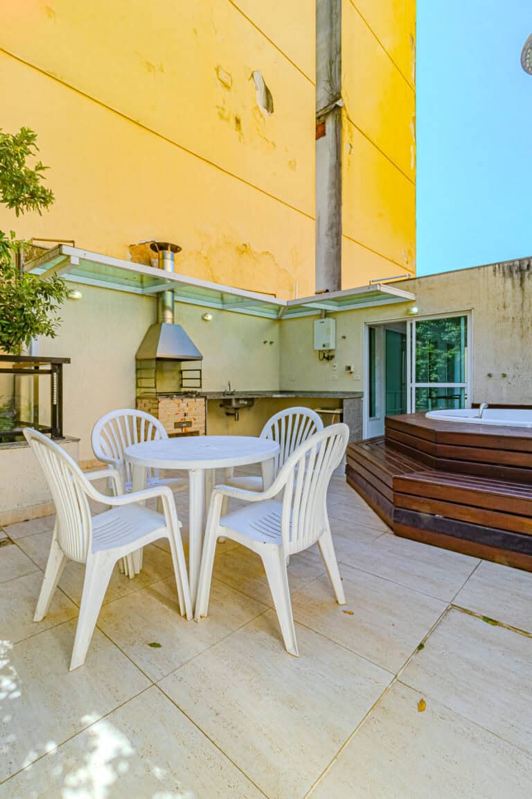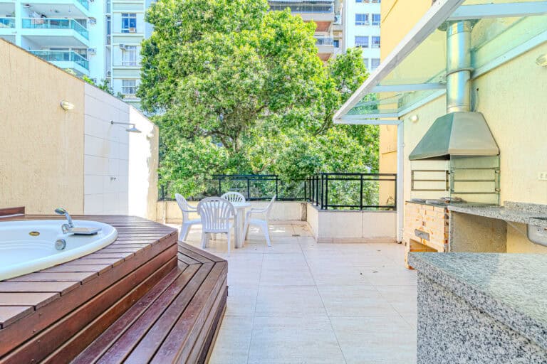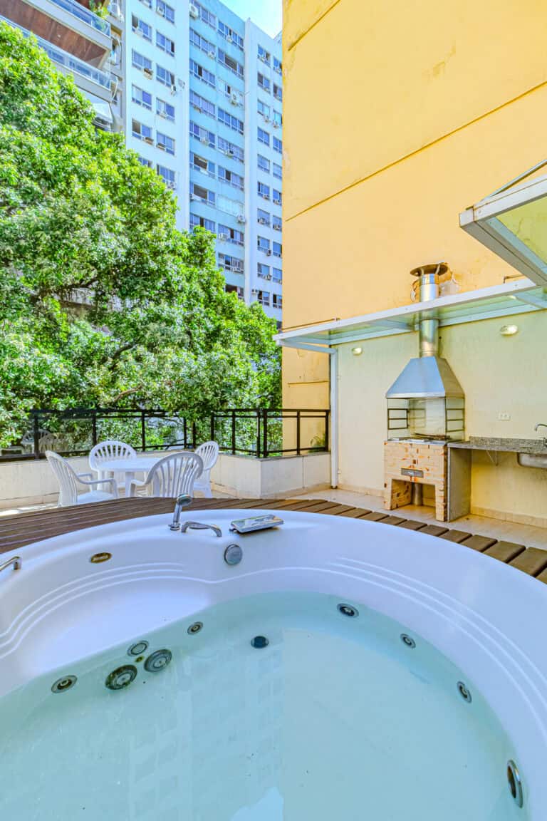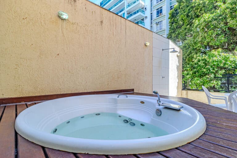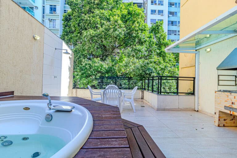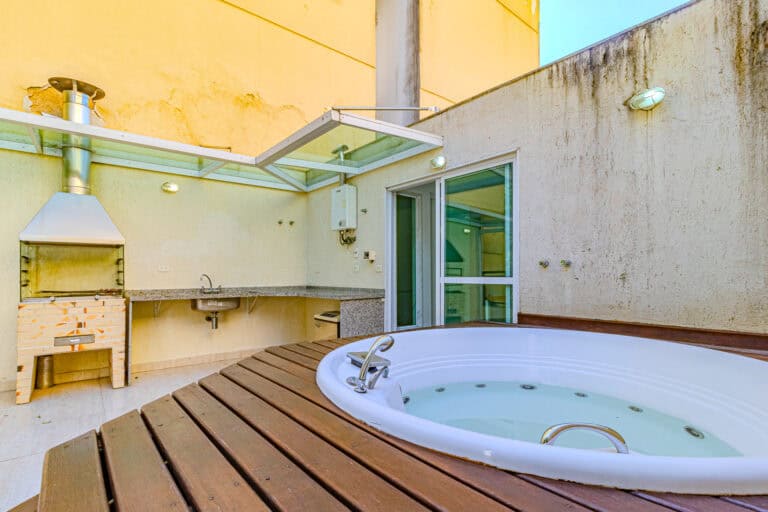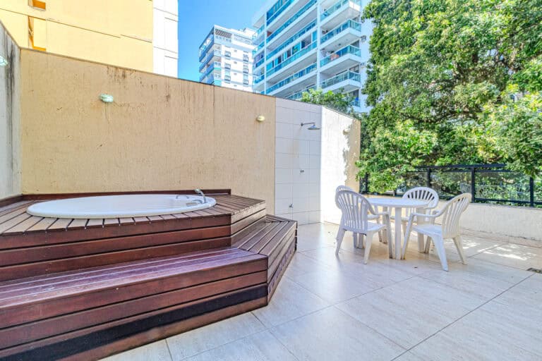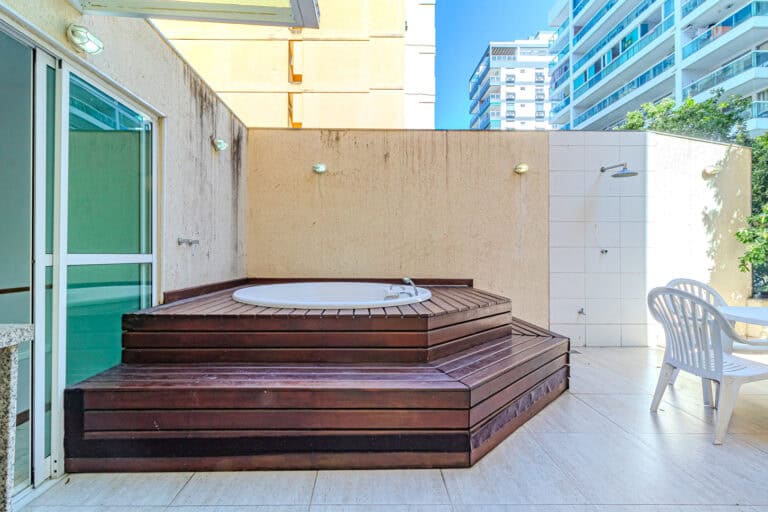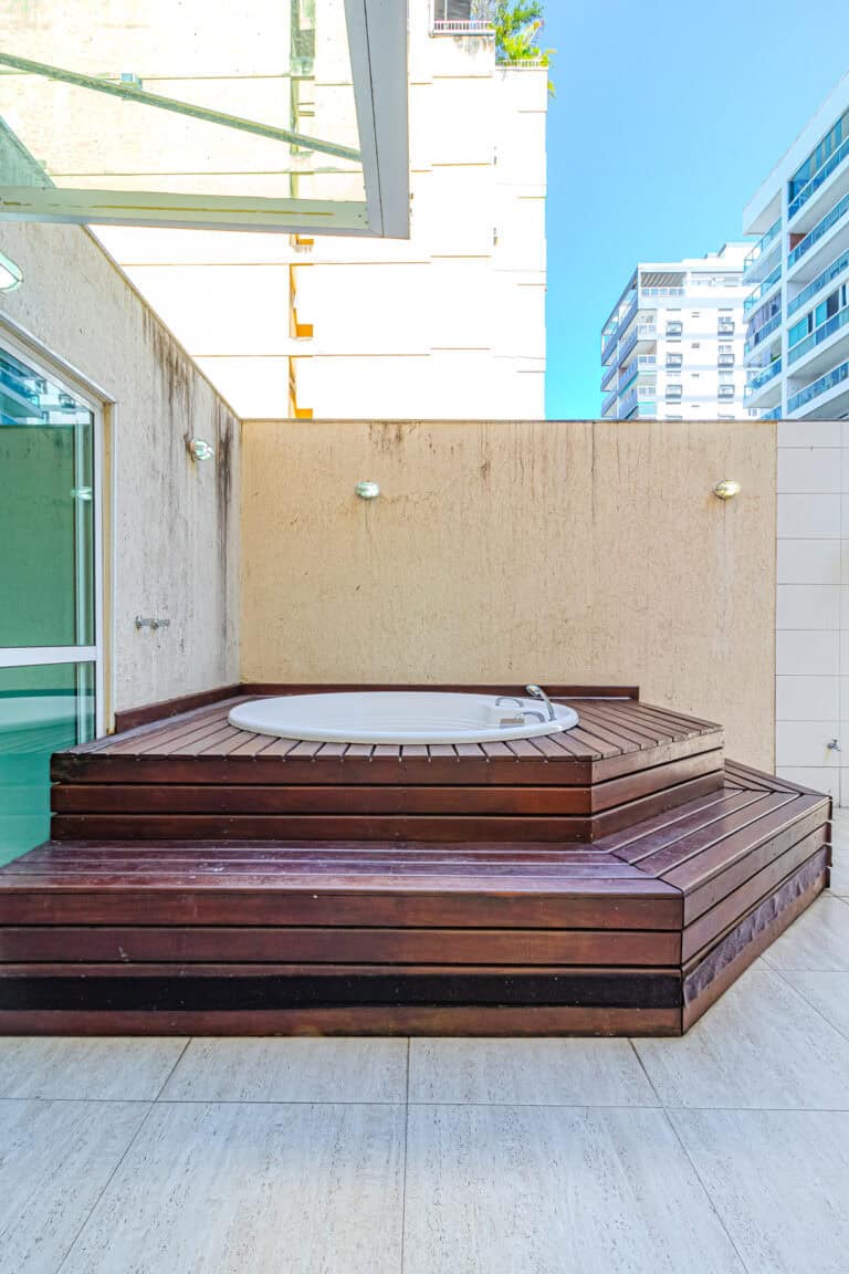 O terraço é ideal para quem não dispensa uma área externa. Além da hidro, churrasqueira e sauna, conta ainda com um banheiro completo.
